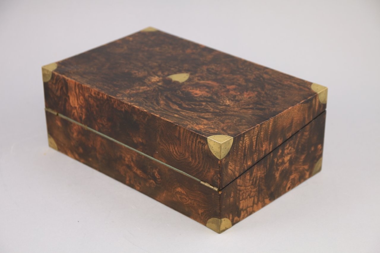 de forme rectangulaire en loupe de thuya. Il s'ouvre sur un plateau amovible foncé d'un velours vert doré aux petits fers de frises de grecques. La partie inférieure garnie d'une toile rouge formant niche. La partie supérieure comprend des emplacements pour un plumier et deux encriers.