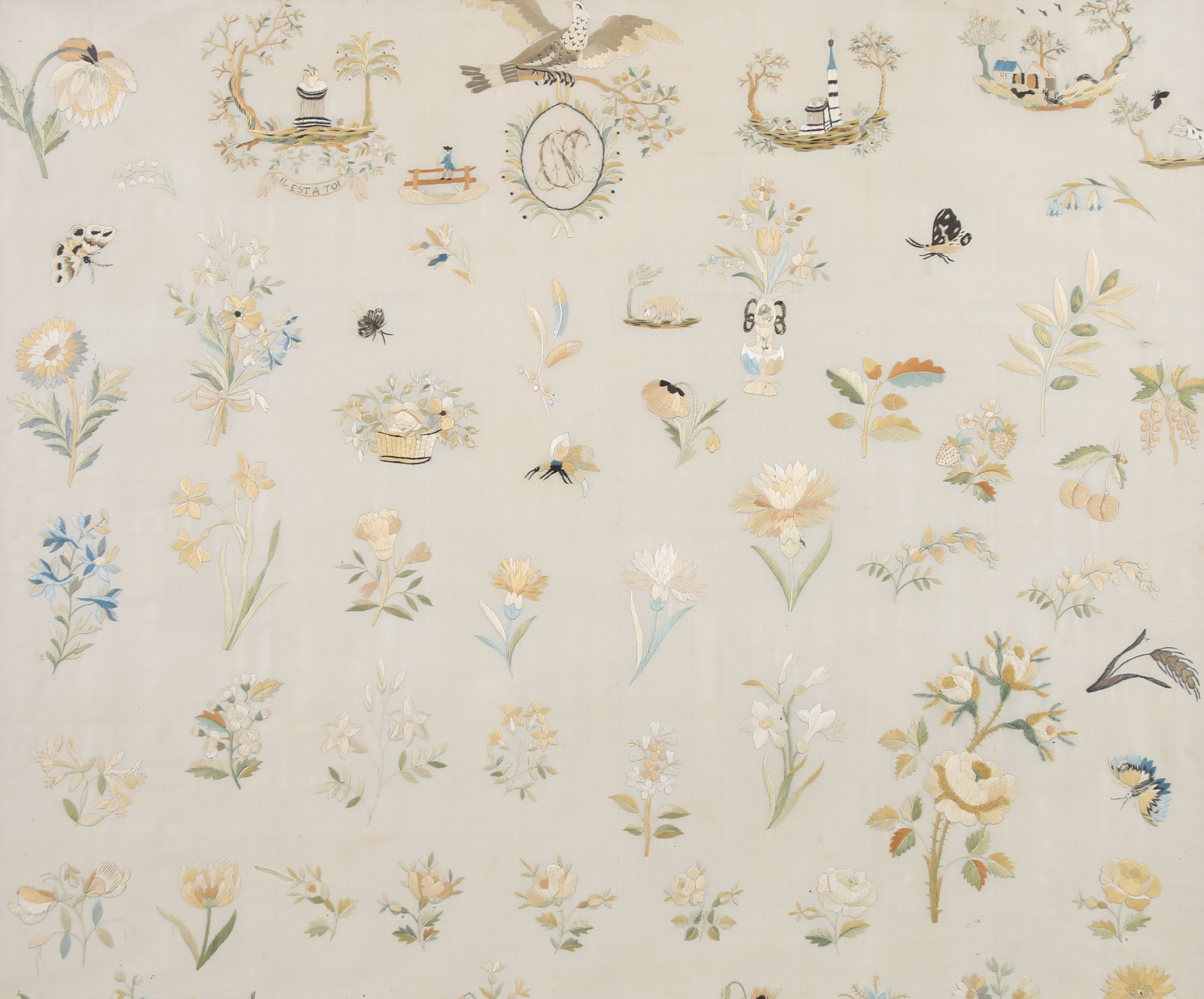 sur soie à décor de fleurs variées, insectes, oiseaux et scènes animées.