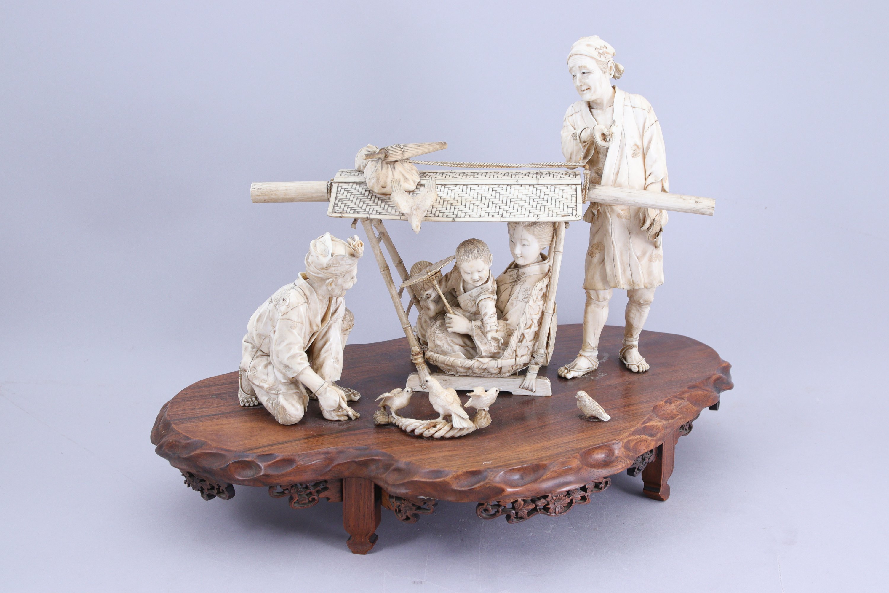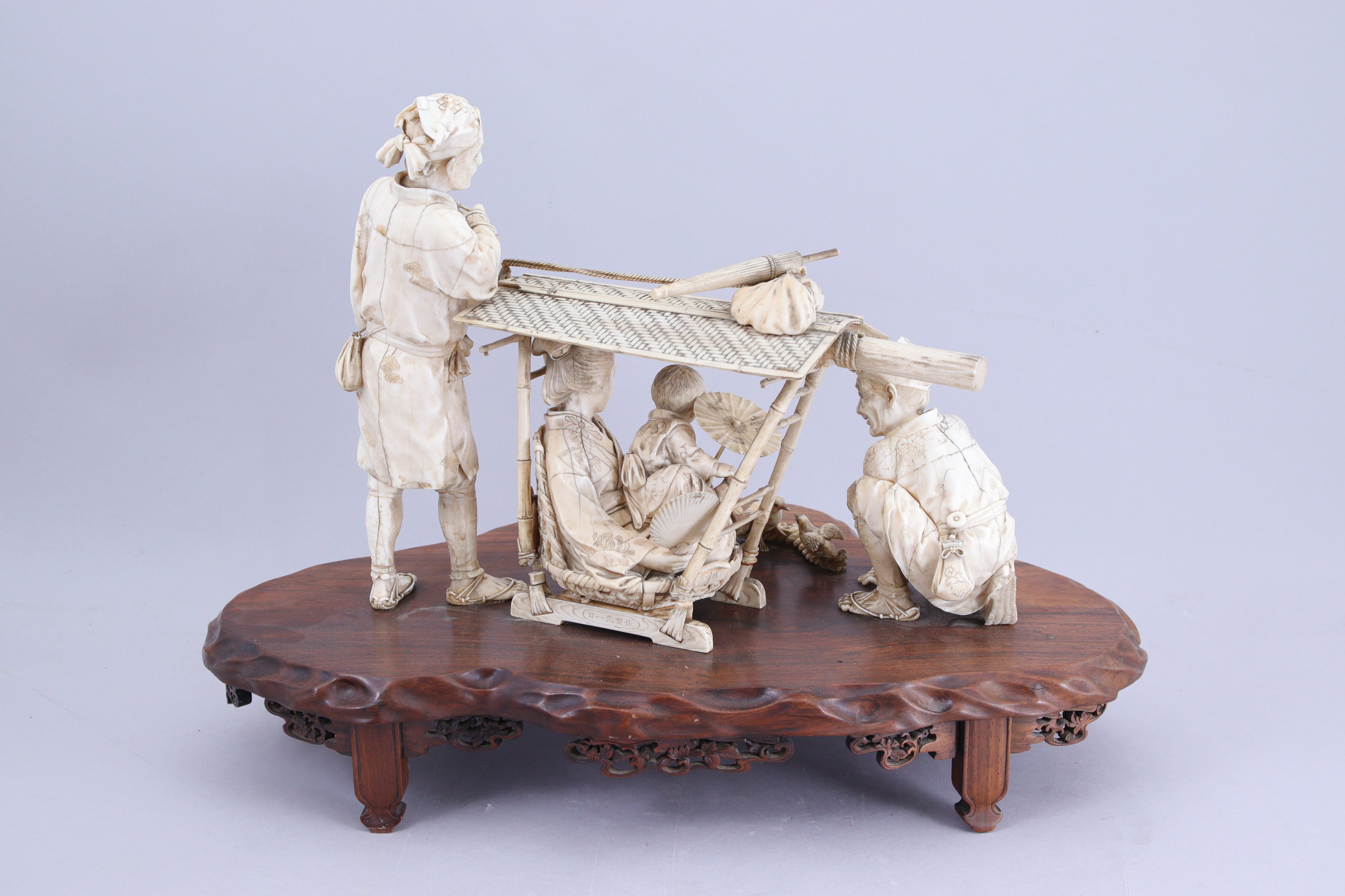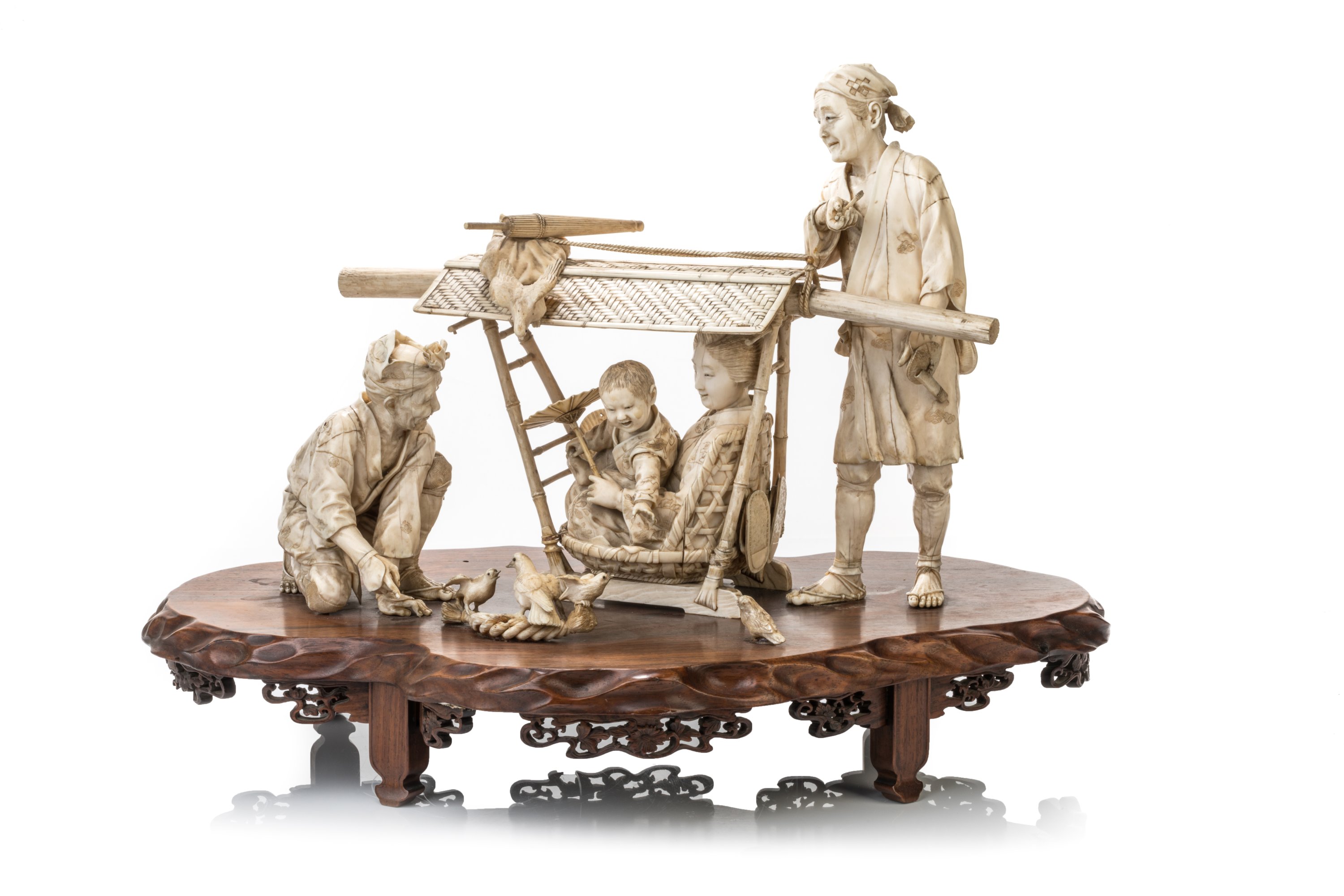Jeune femme et enfant dans un palanquin porté par deux hommes, se reposant et montrant des oiseaux au garçon