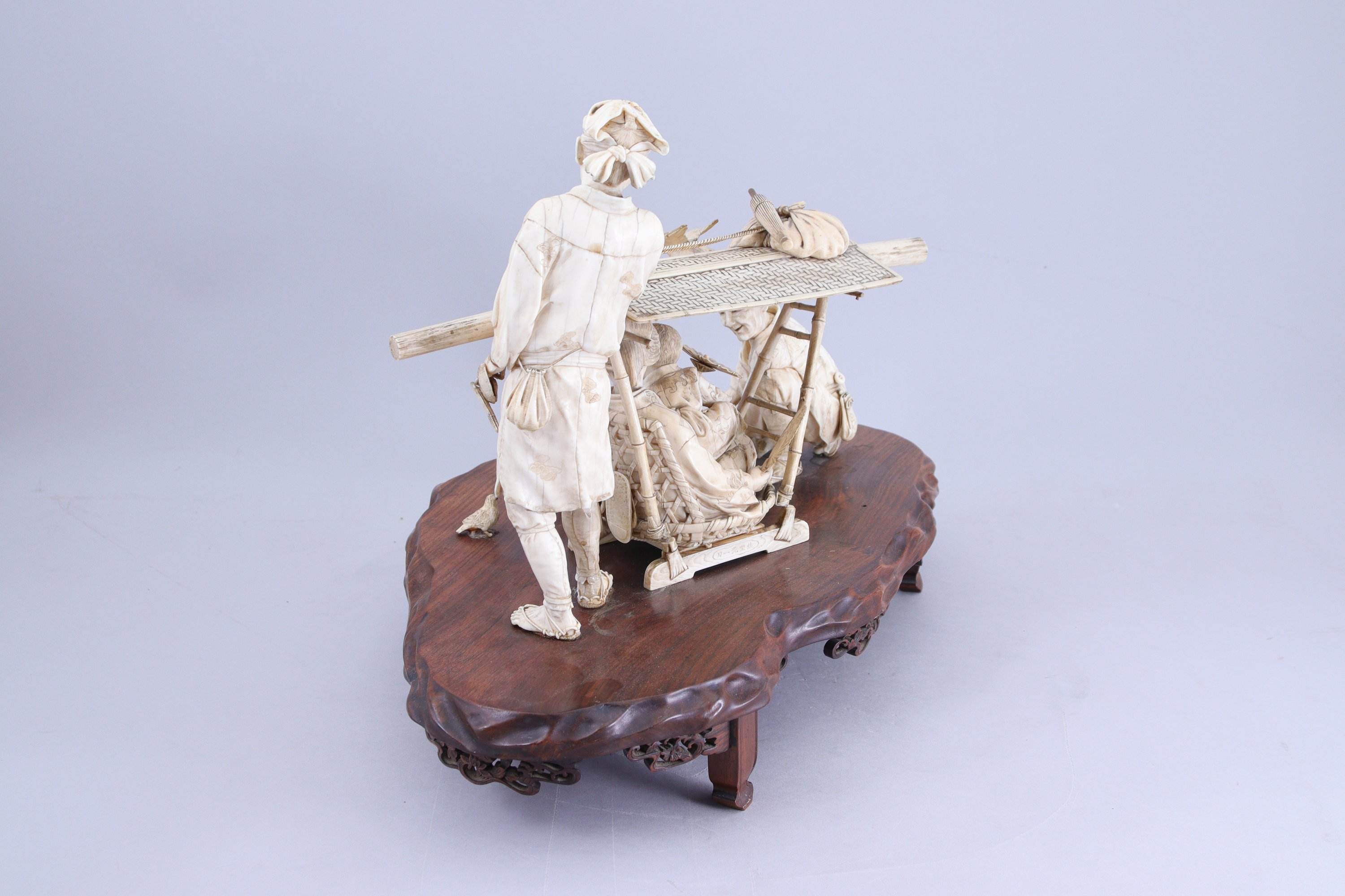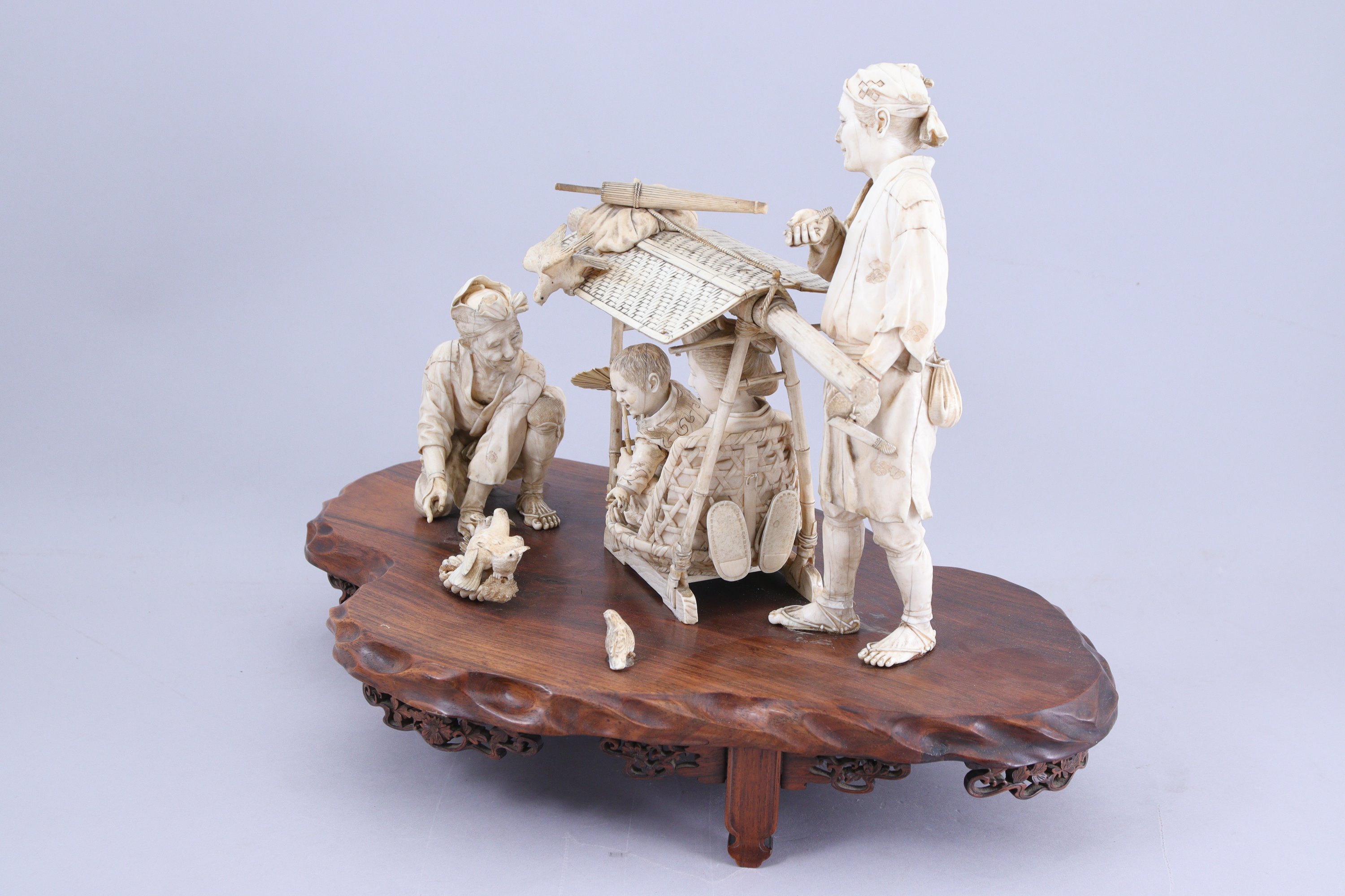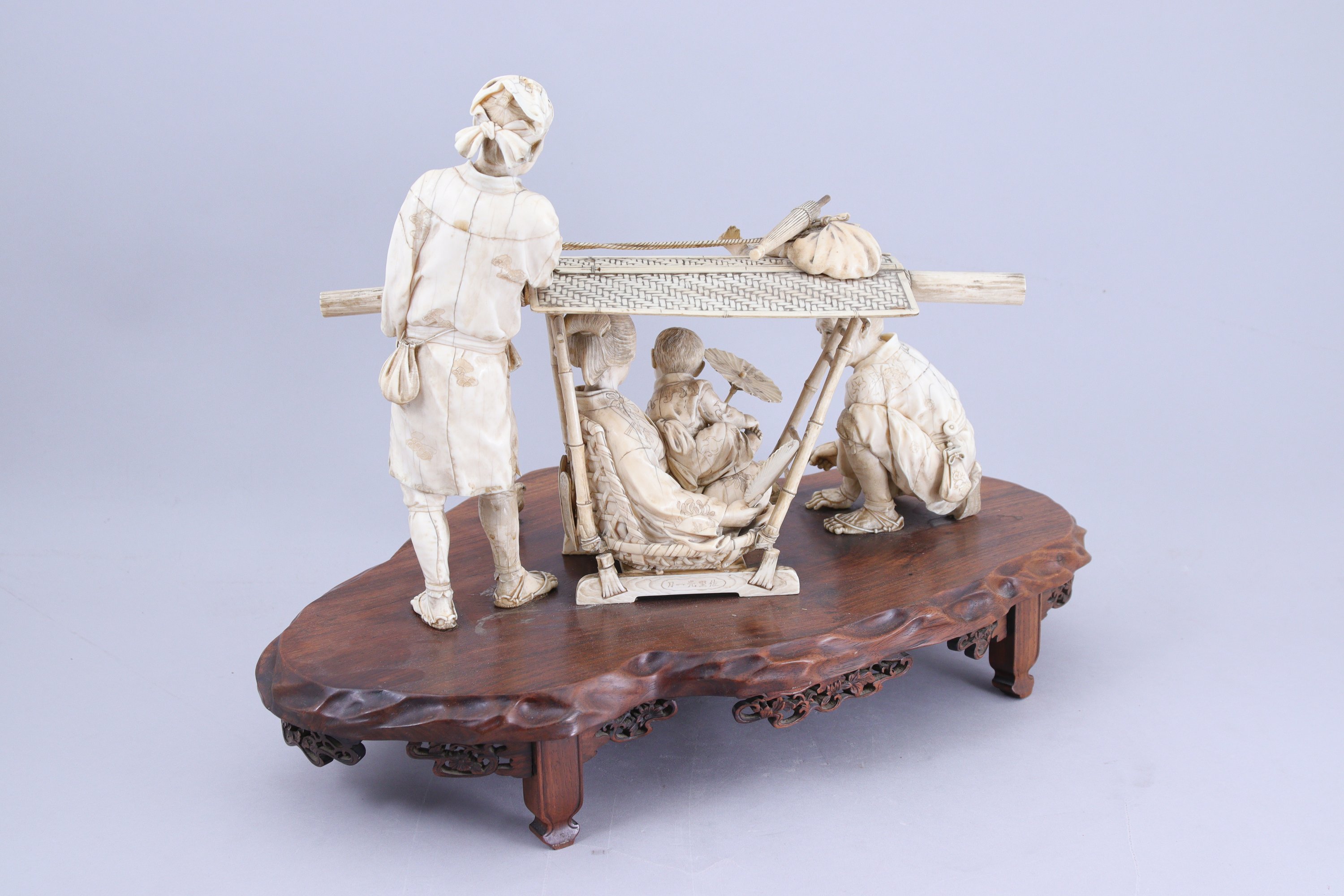 Jeune femme et enfant dans un palanquin porté par deux hommes, se reposant et montrant des oiseaux au garçon