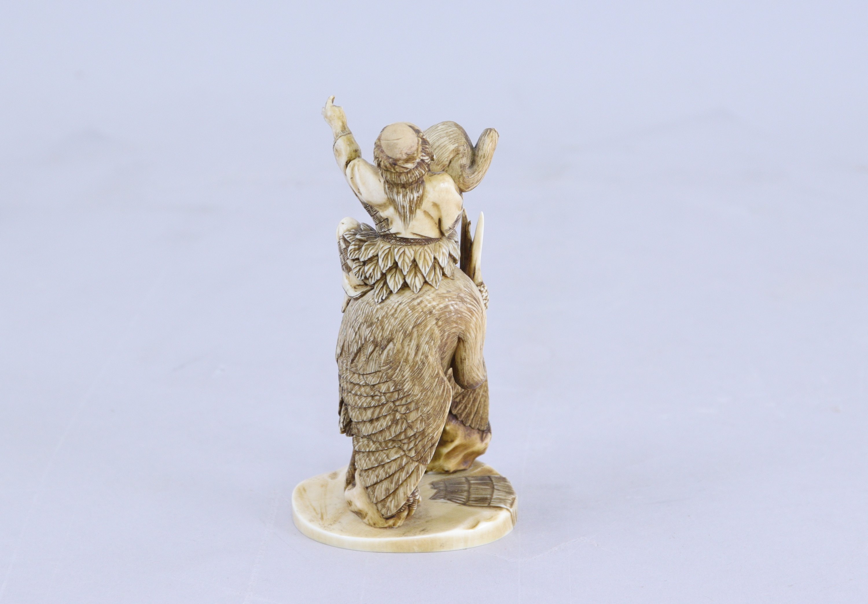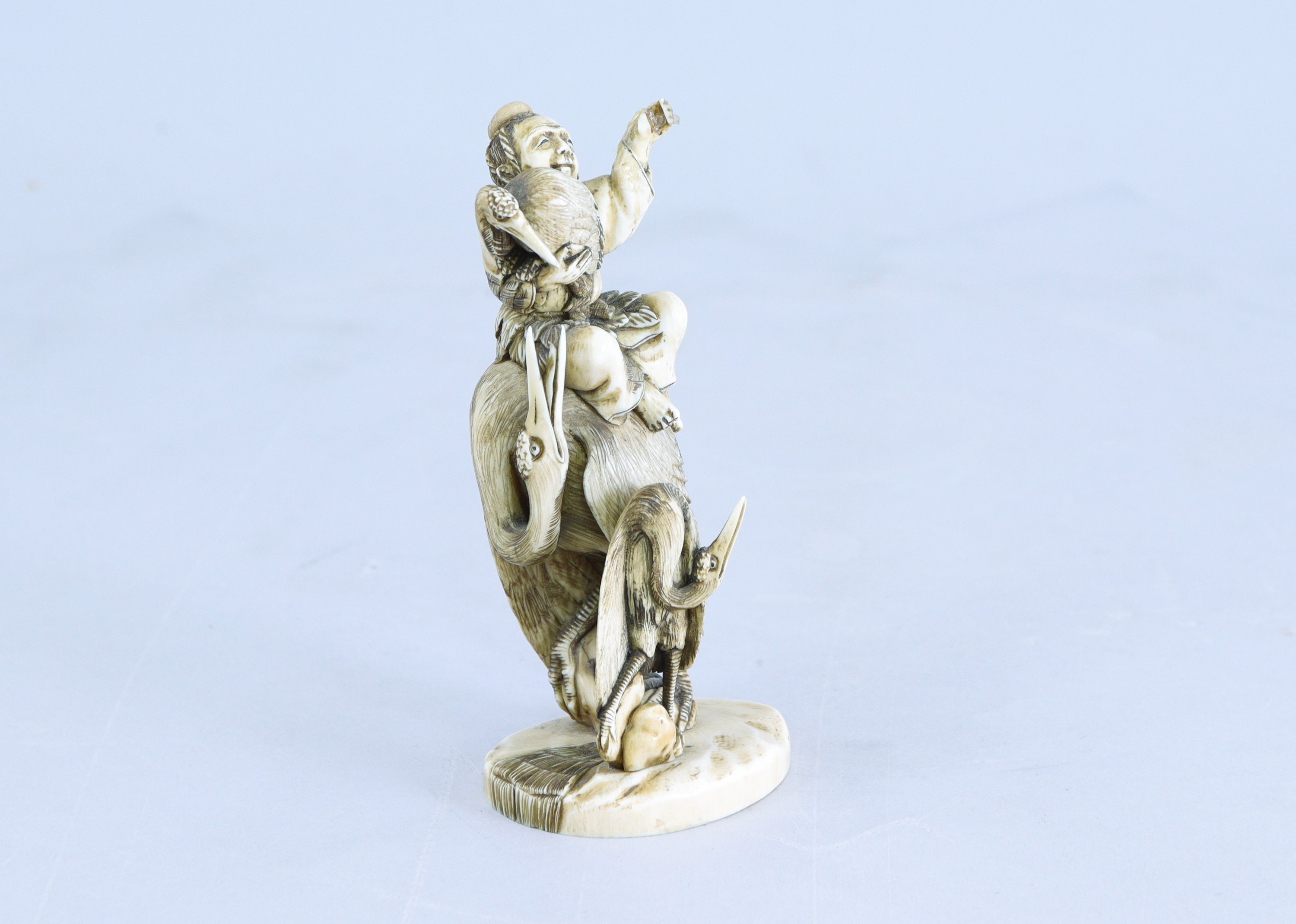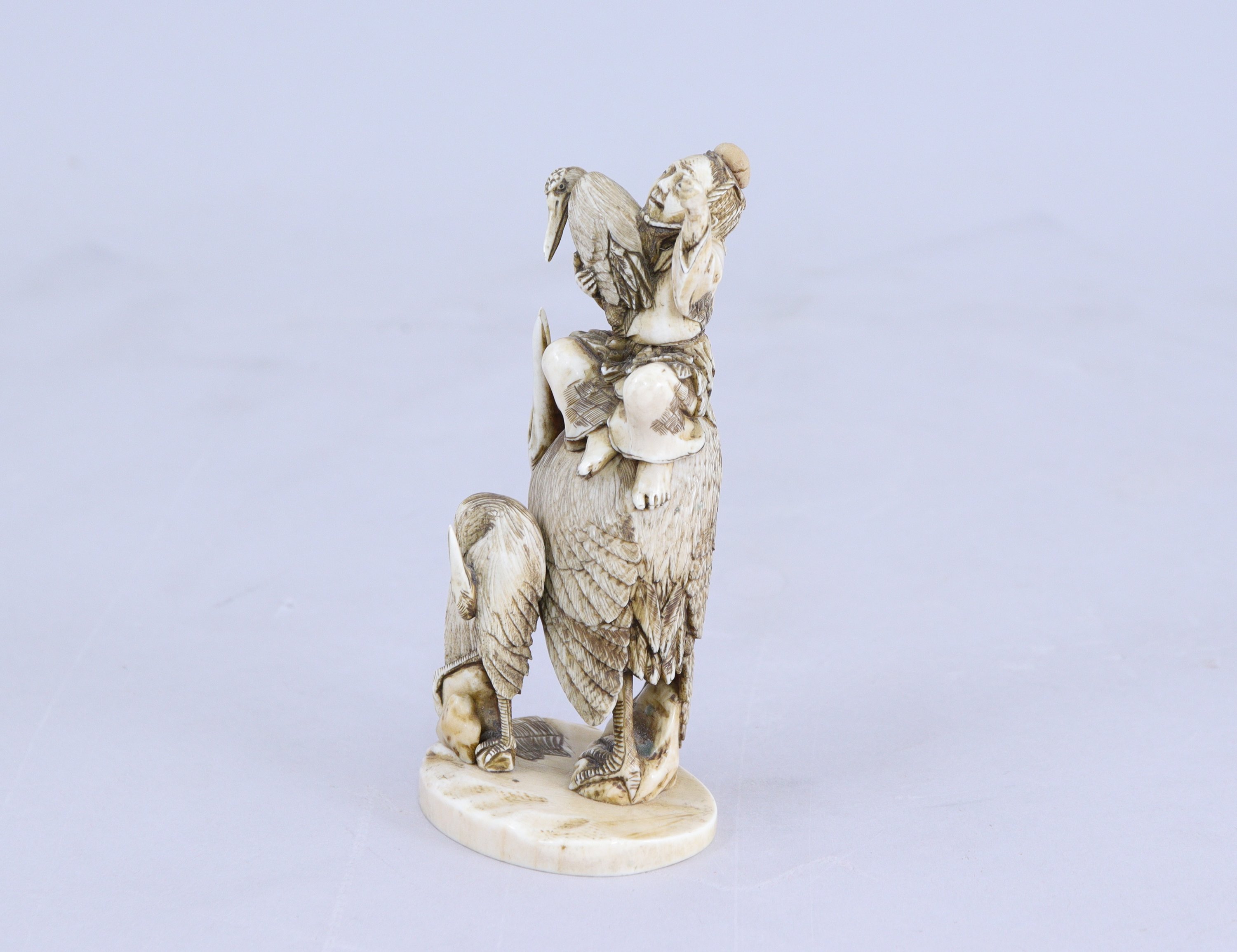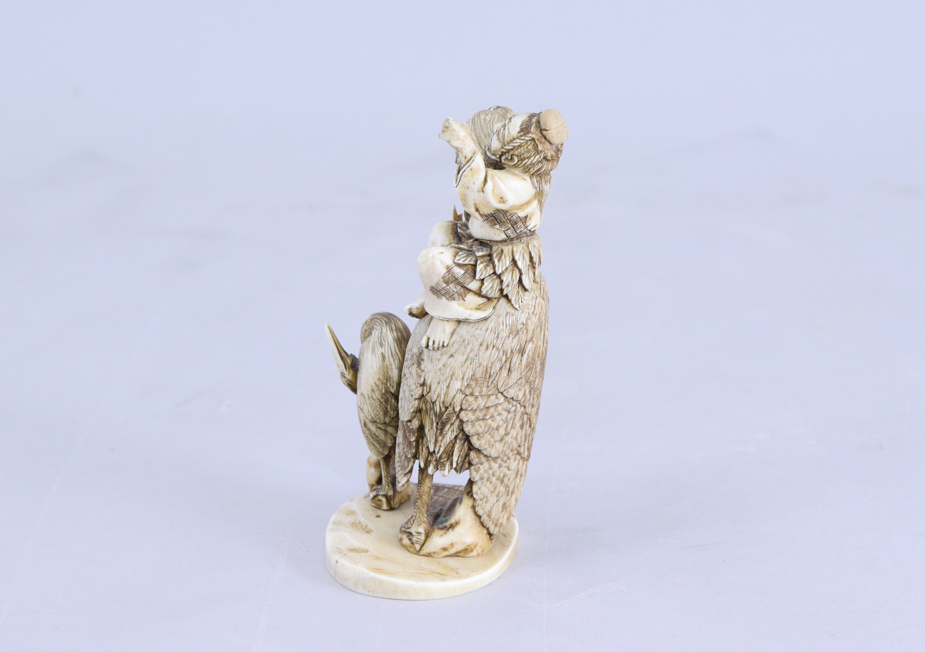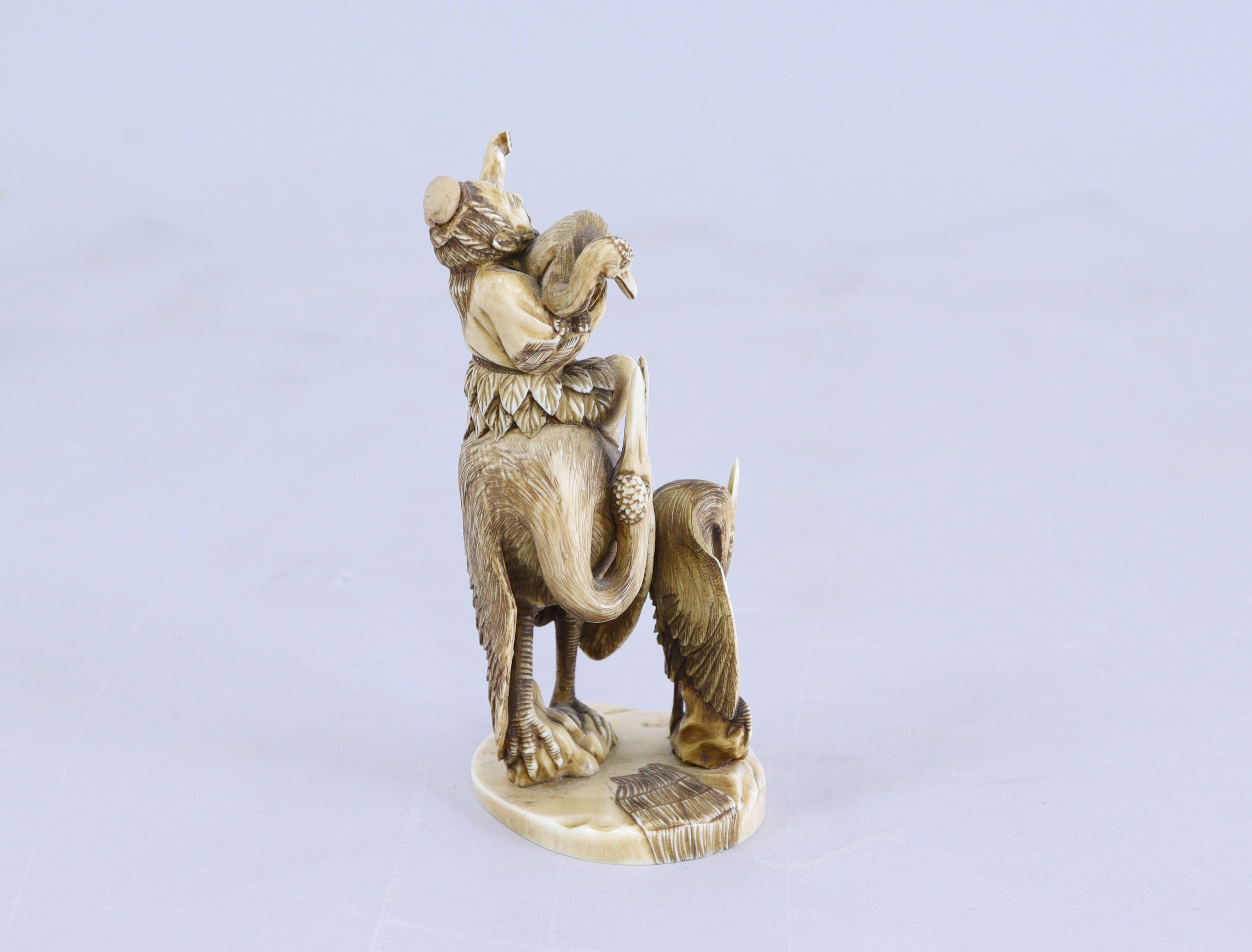 Personnage assis sur le dos d'une grue