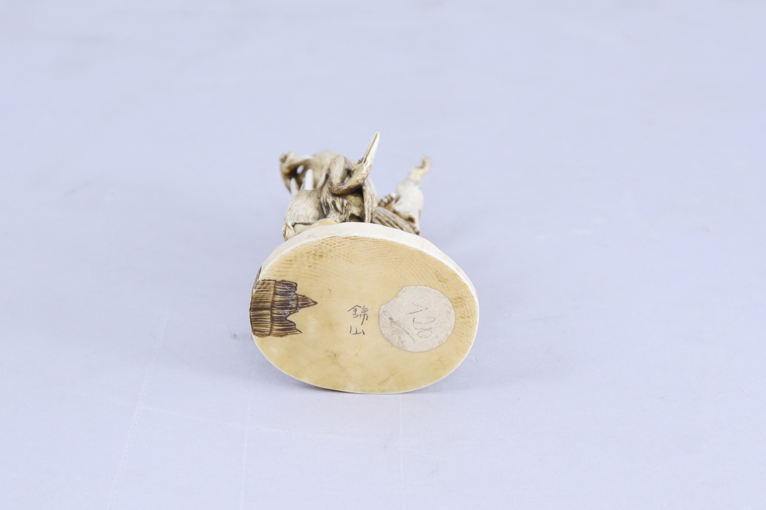 Okimono en ivoire représentant un personnage portant un petit dans ses bras, un autre petit près de lui.