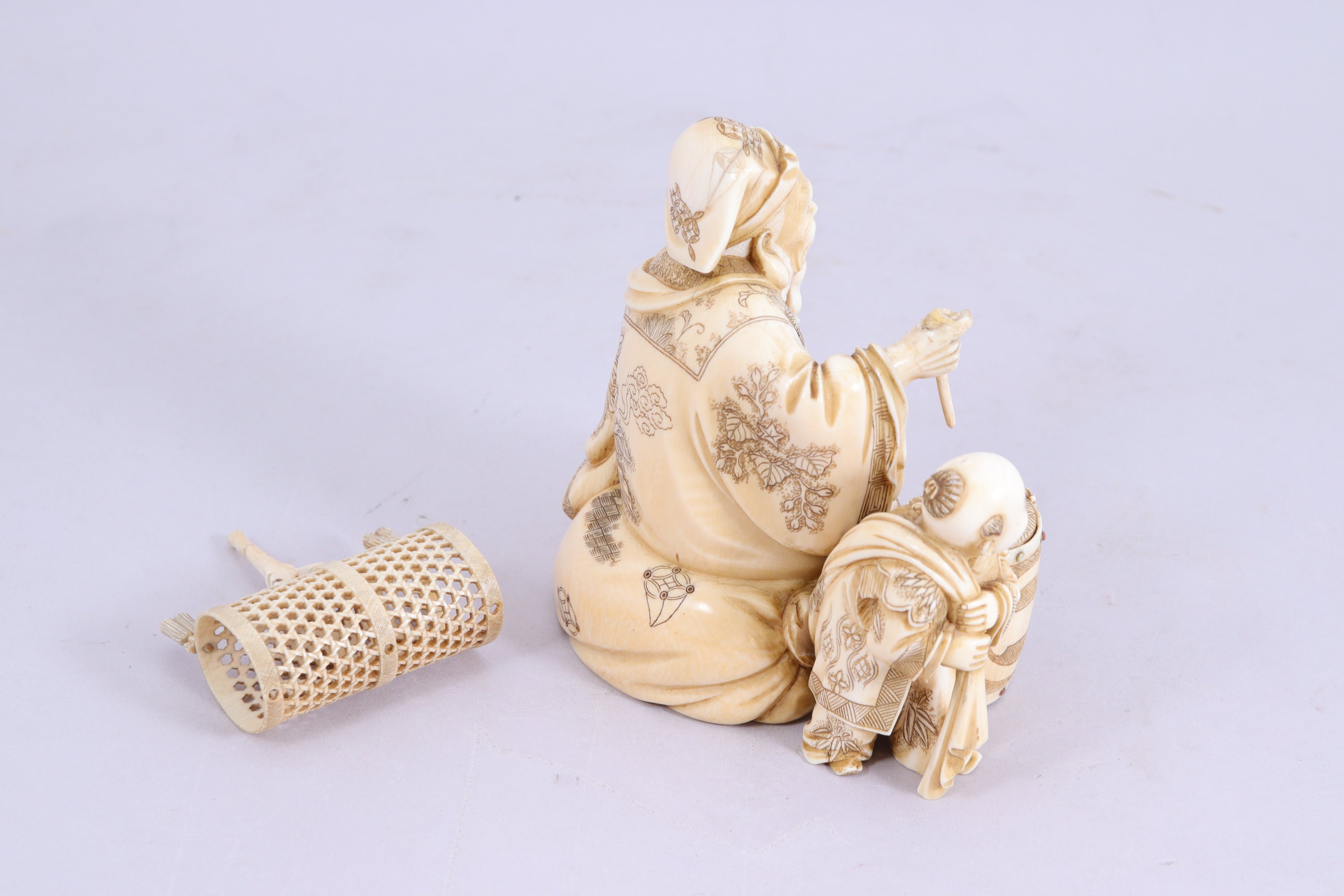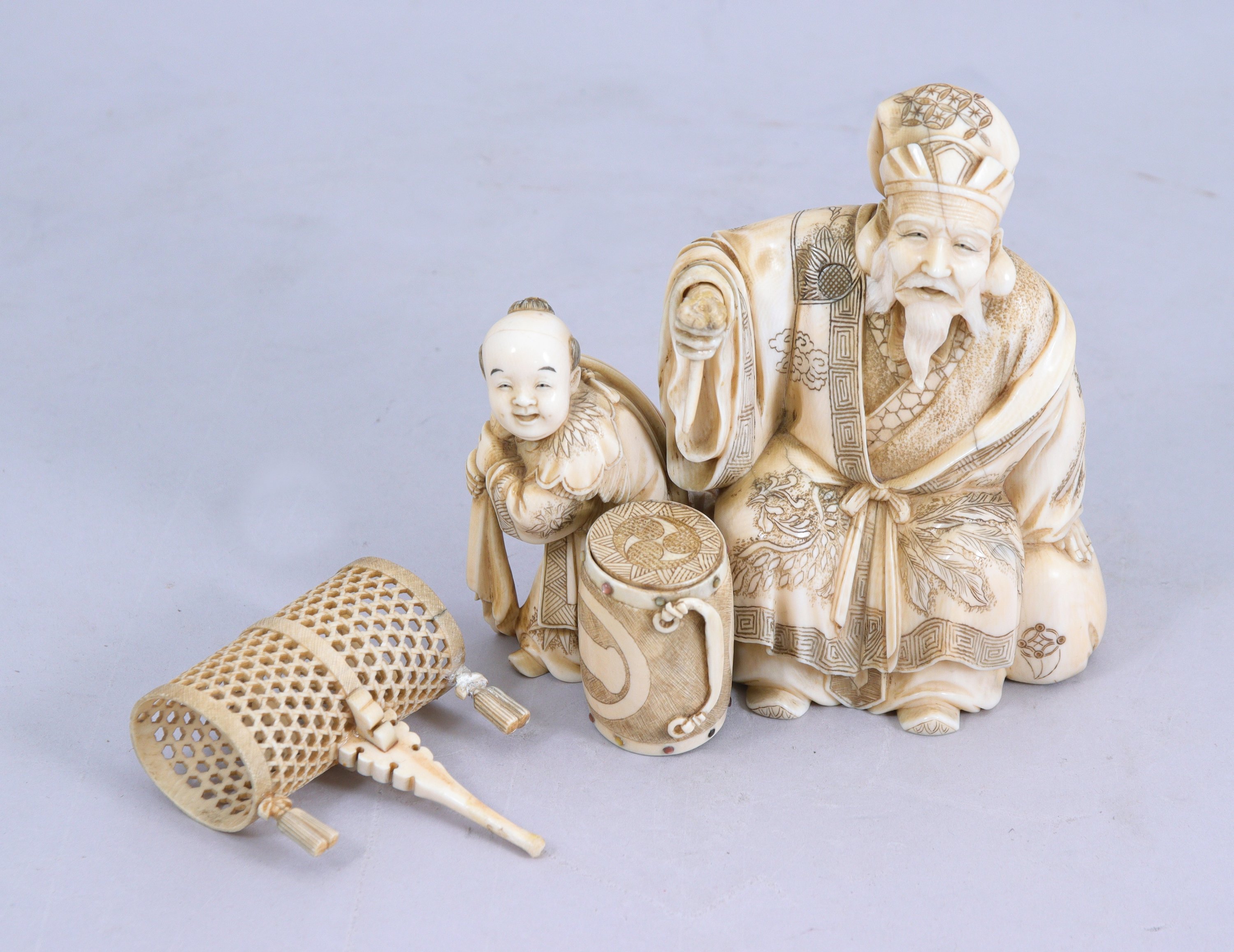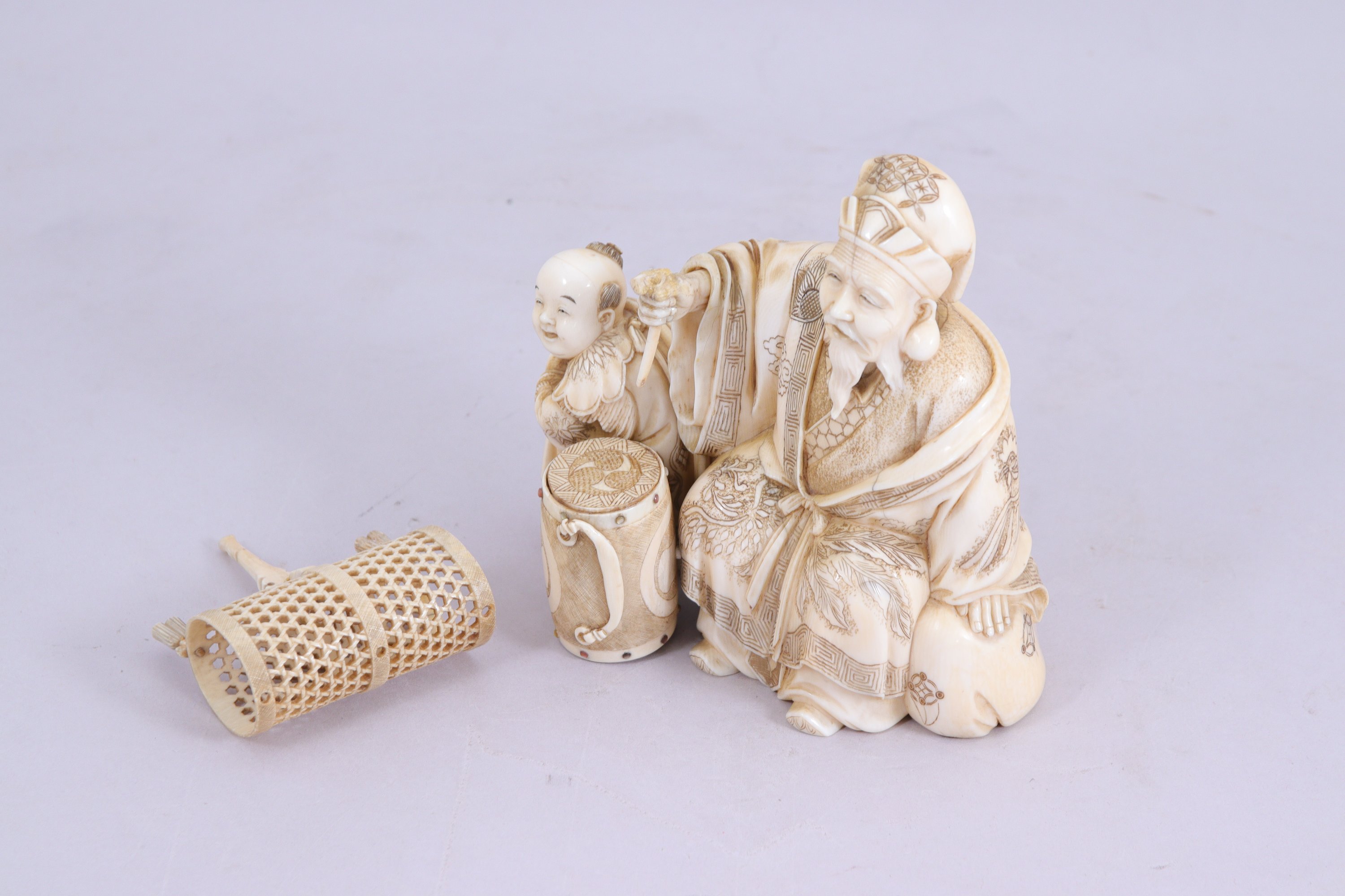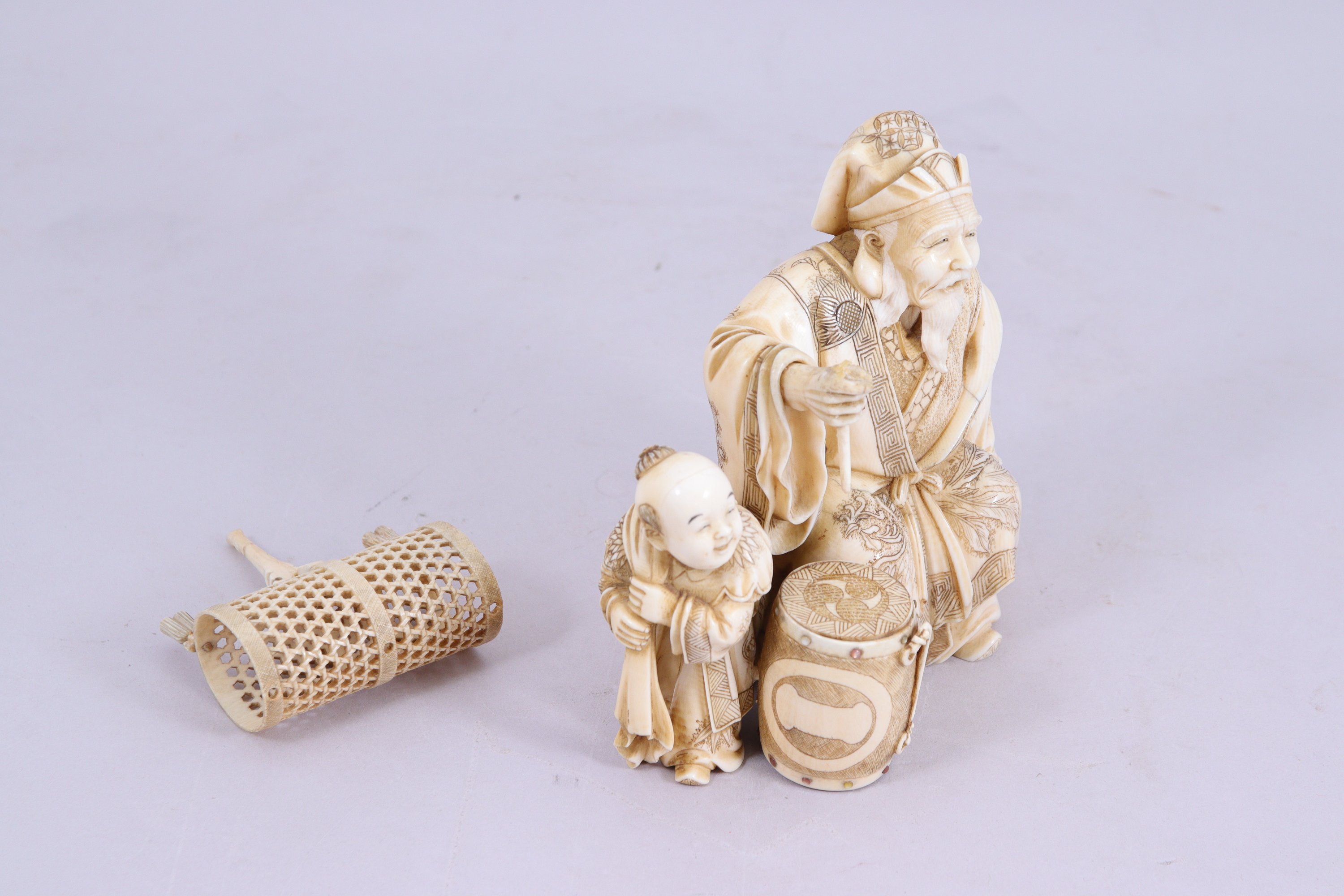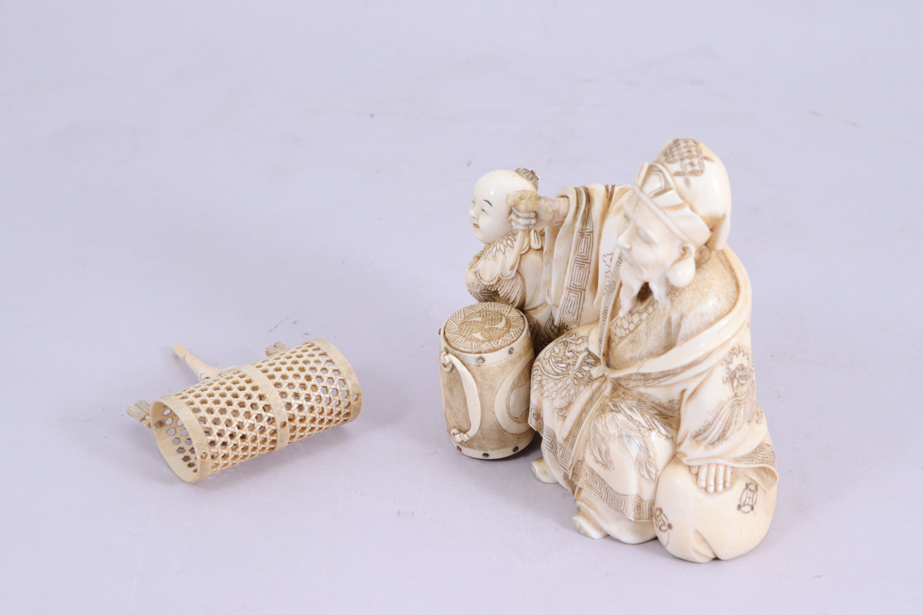Okimono en ivoire, l'homme tenant un bâton pour le tambour posé devant lui. Les rivets du tambour incrustés de nacre.