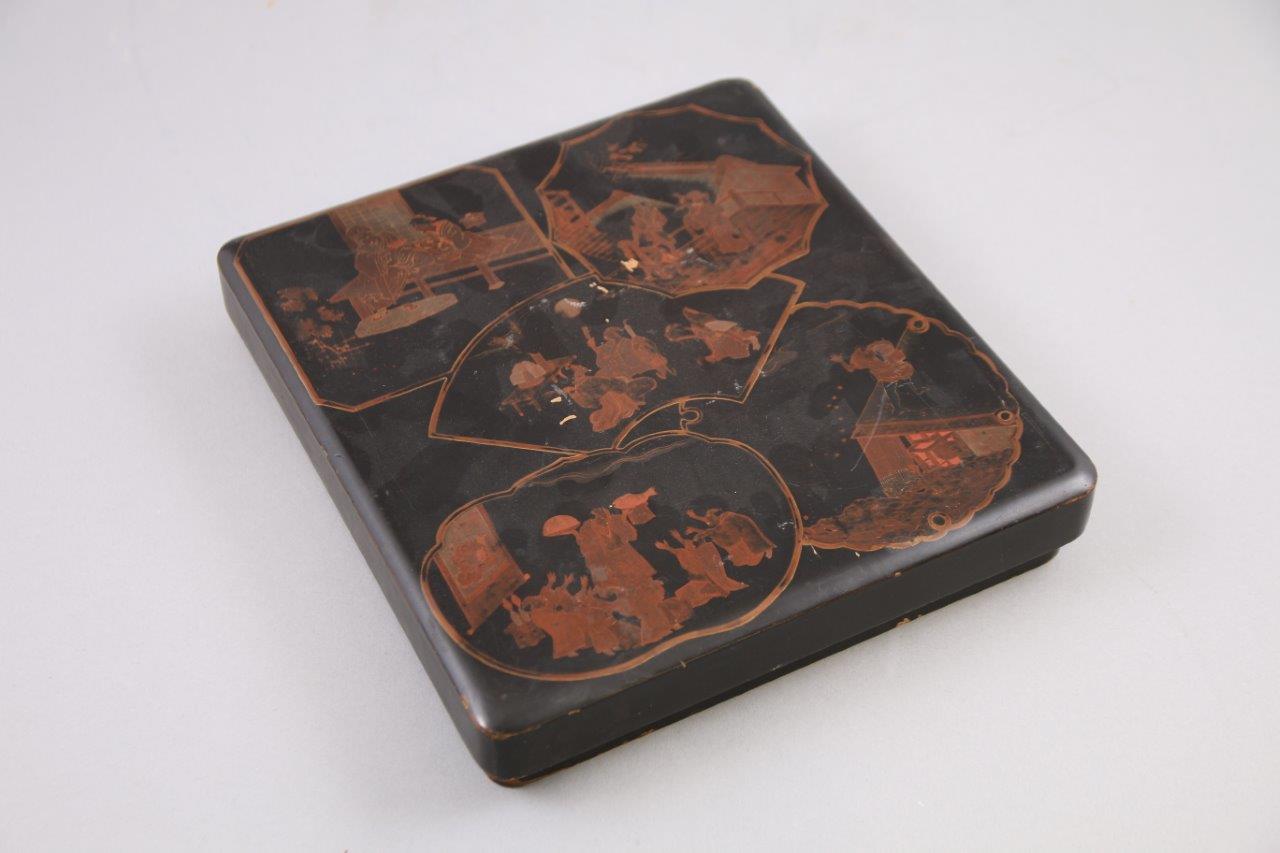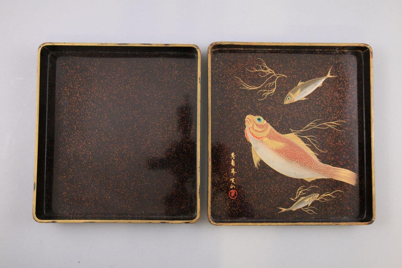 à décor laqué sur le couvercle extérieur, de cinq scènes animées dans des cartouches et, à l'intérieur, d'une carpe entourée de deux petits poissons sur un fond aventurine.