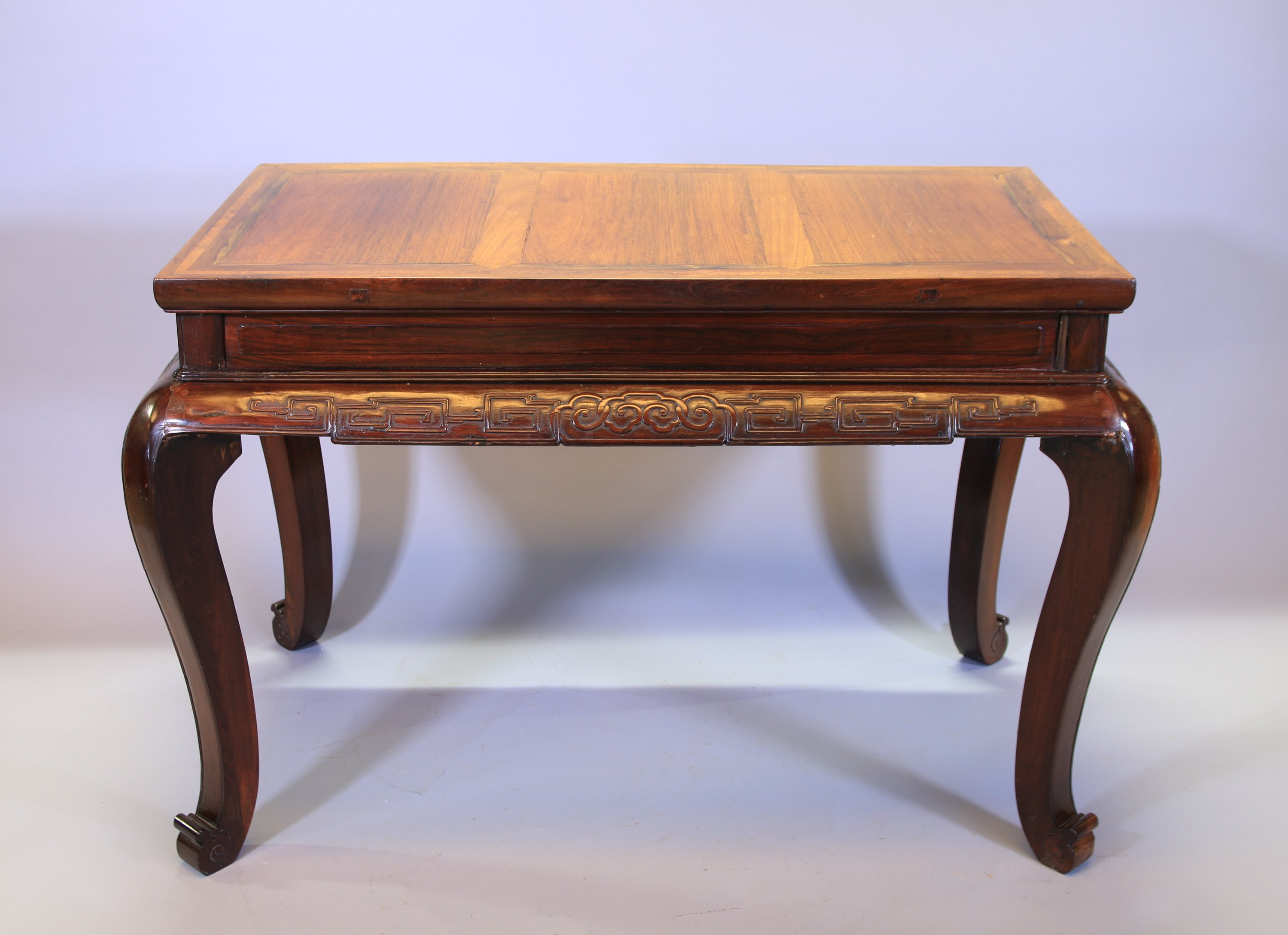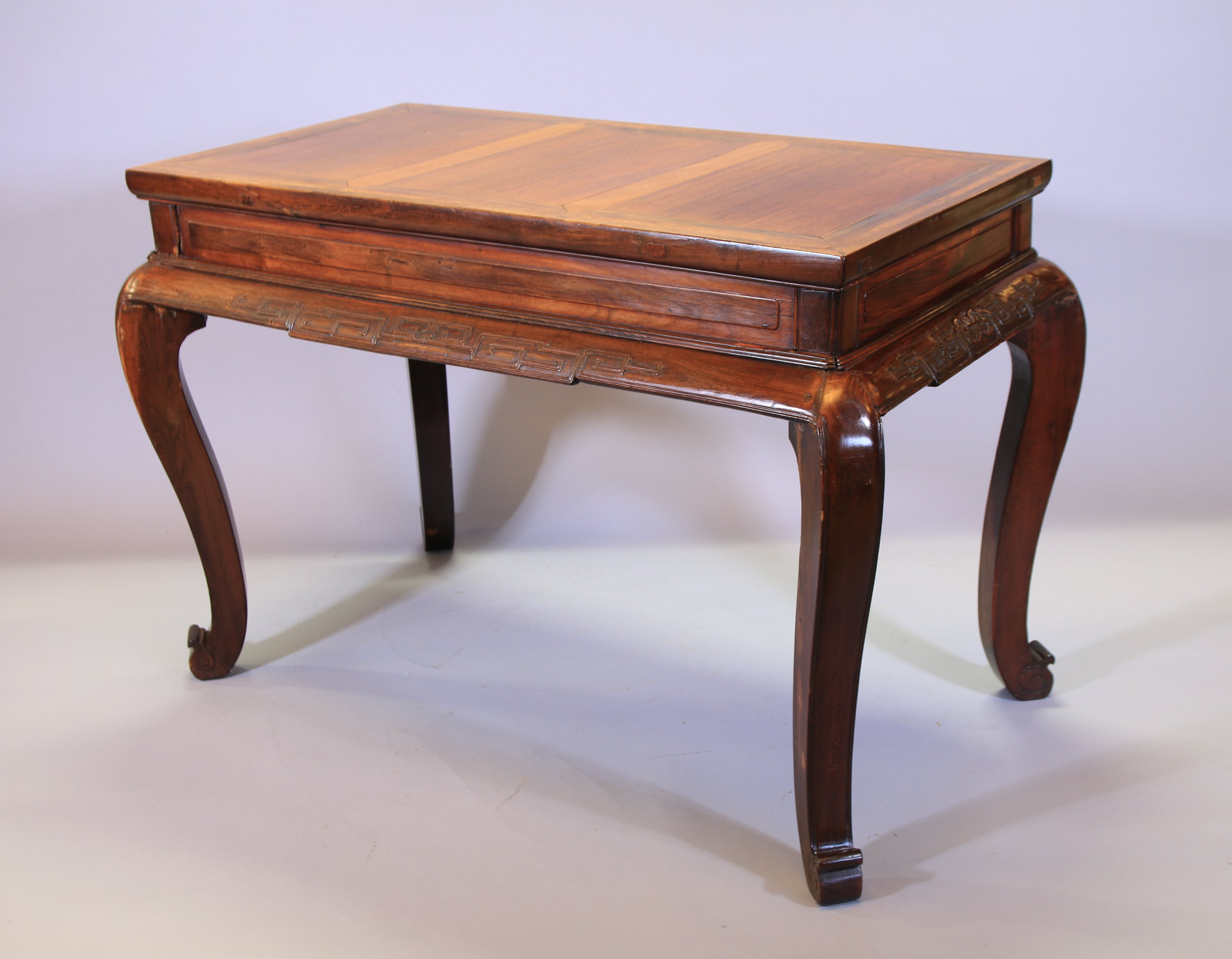 en bois exotiques. La ceinture à décor de grecques et d'enroulement, les pieds galbés terminés par des enroulements.