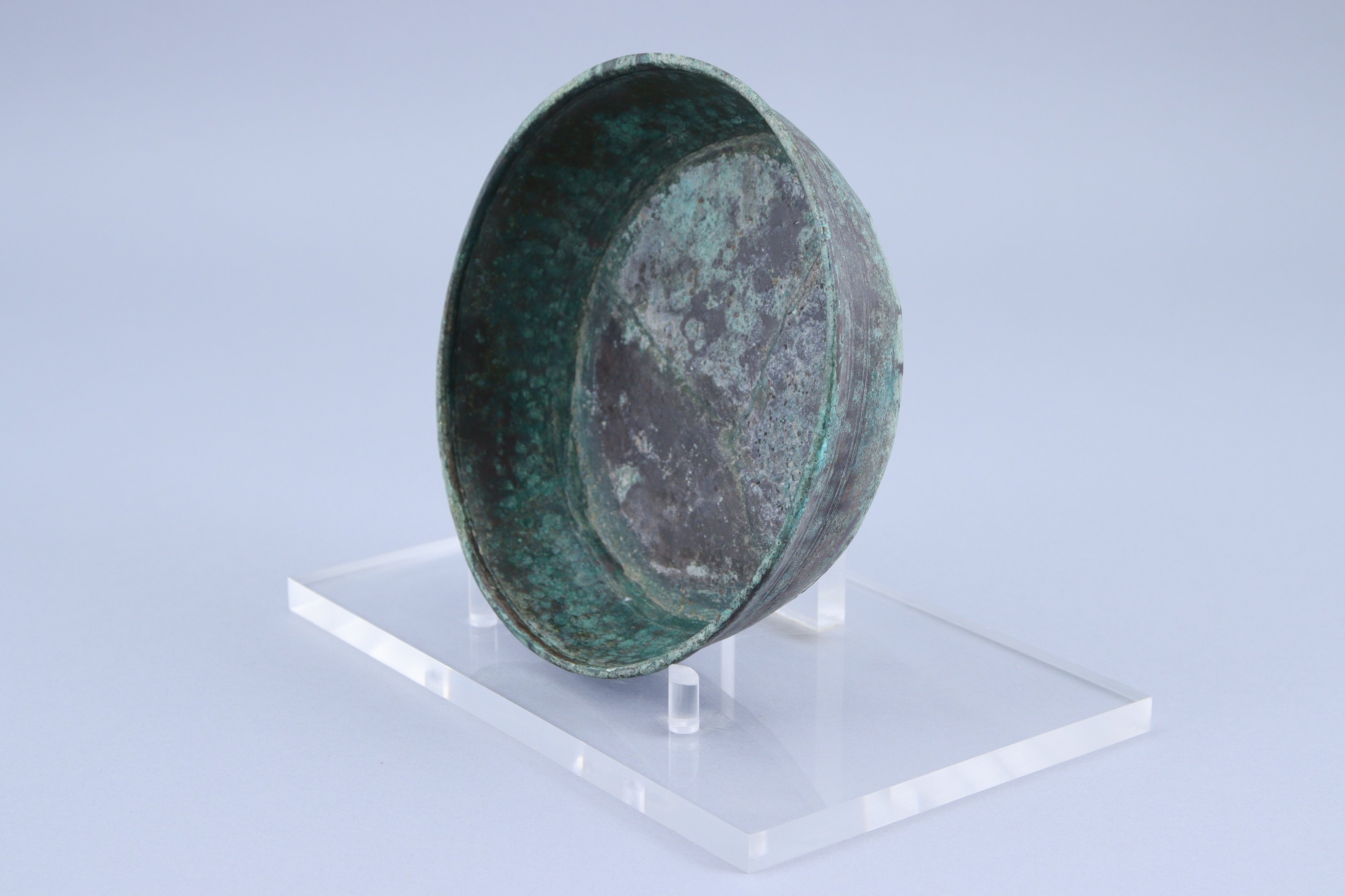 en bronze à patine verte, l’extérieur décoré de bandes en creux.