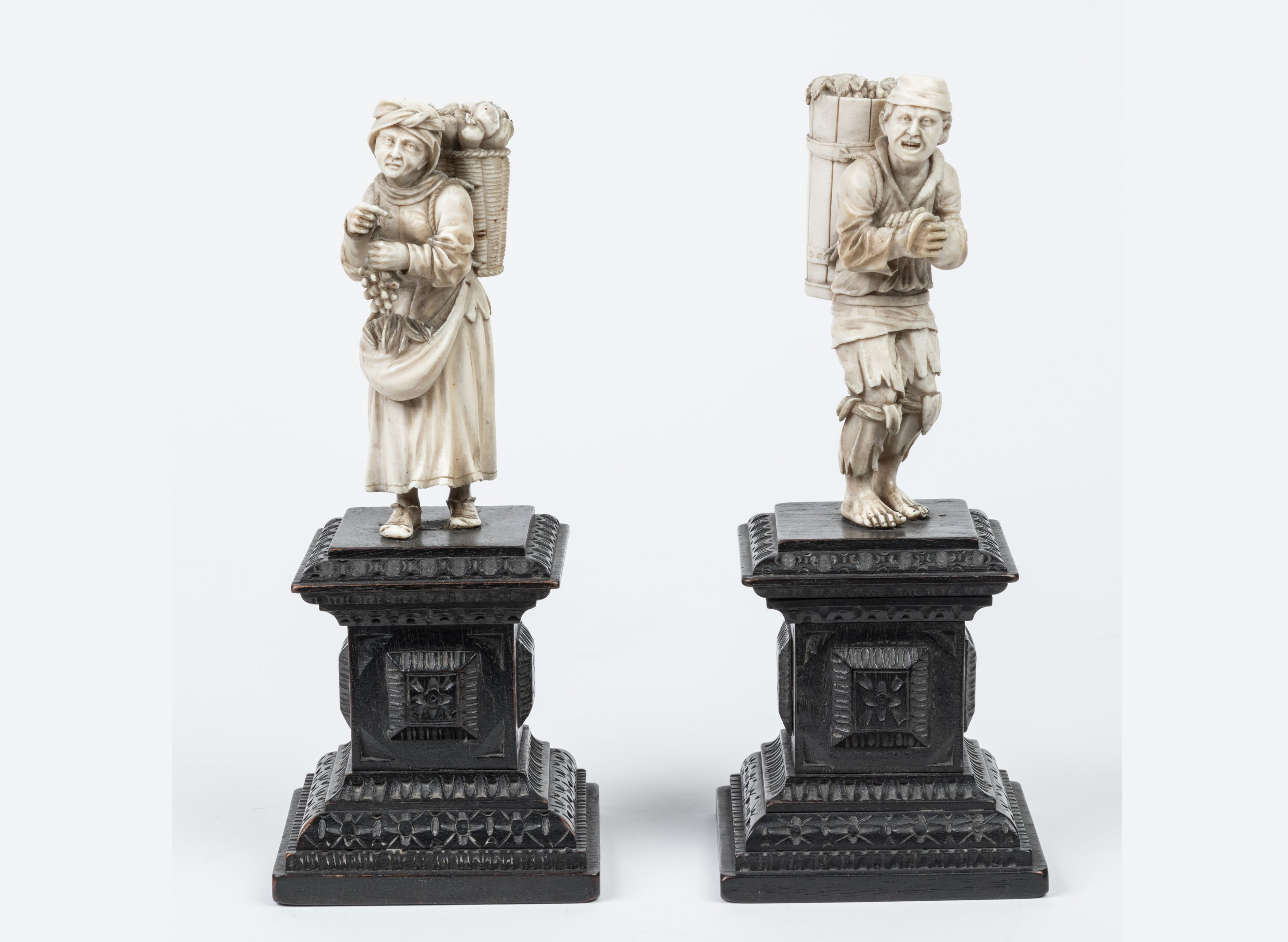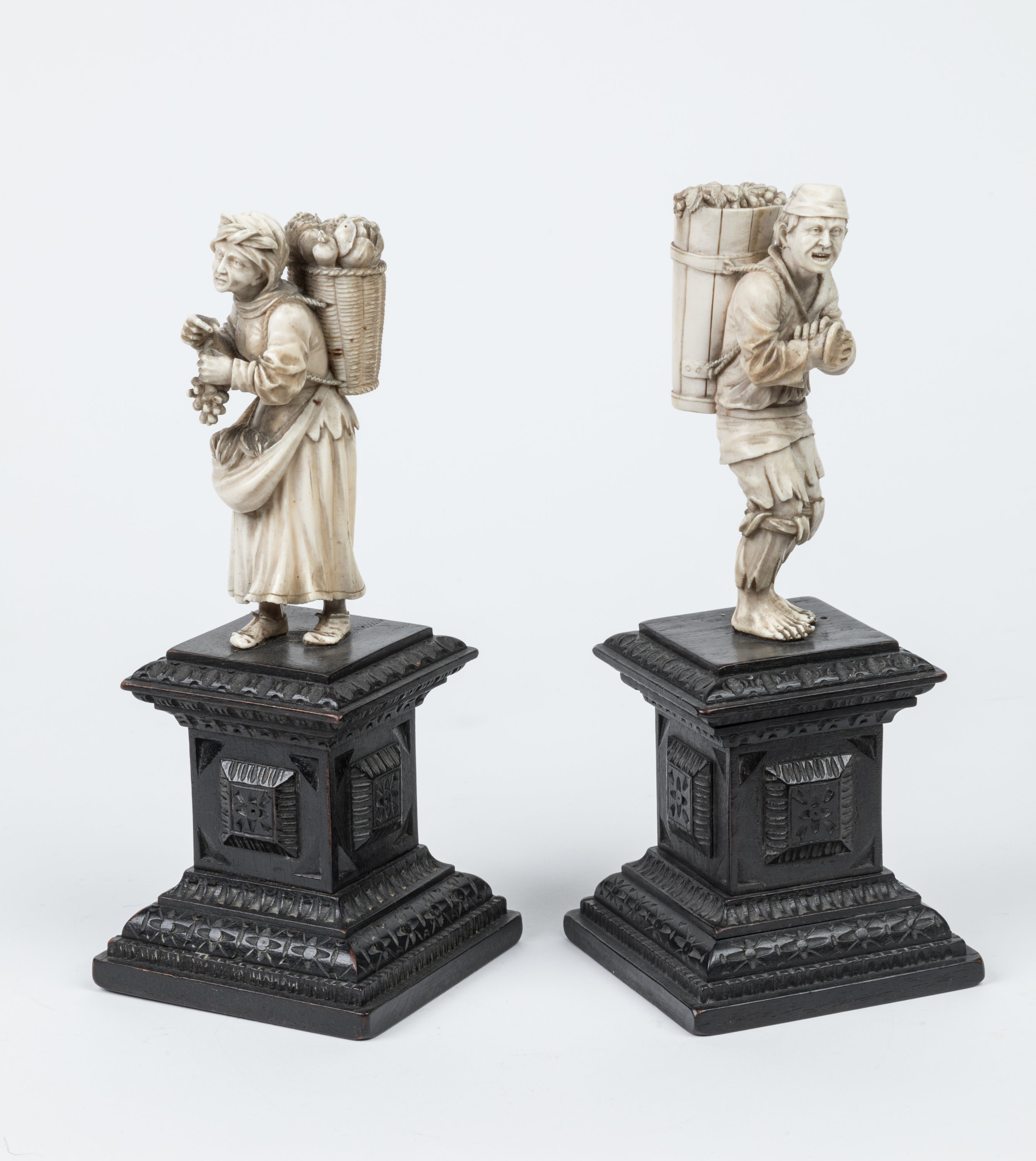 en ivoire sculptée en ronde-bosse représentant un vendangeur et une marchande de légumes tenant une grappe dans la main.