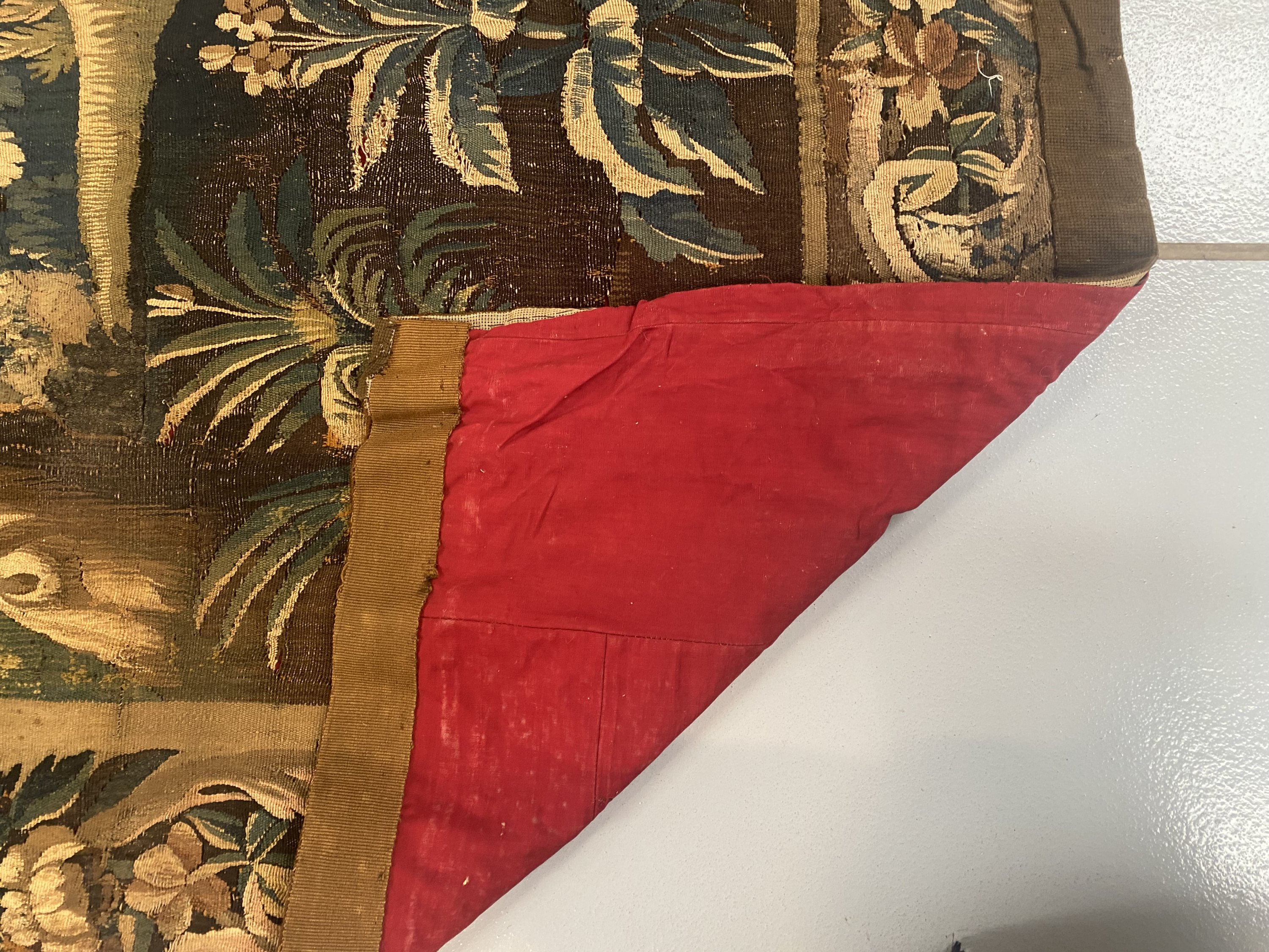 en laine et soie, verdure, avec sa bordure rentrayée de rinceaux de palmes et fleurs.