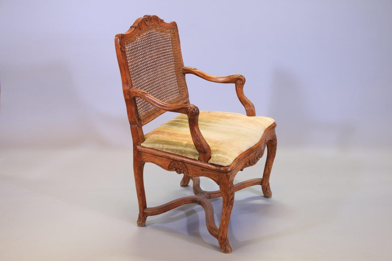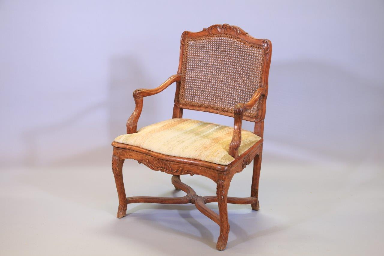 en hêtre mouluré et sculpté. L'amortissement du dossier à décor d'une coquille dans un entourage de feuilles d'acanthe, les accotoirs sculptés de feuillages reposant sur des supports mouvementés. La ceinture est ornée d'une coquille dans un entourage feuillagé. Quatre pieds cambrés réunis par une entretoise en X dont la partie centrale est décorée d'une fleurette.
