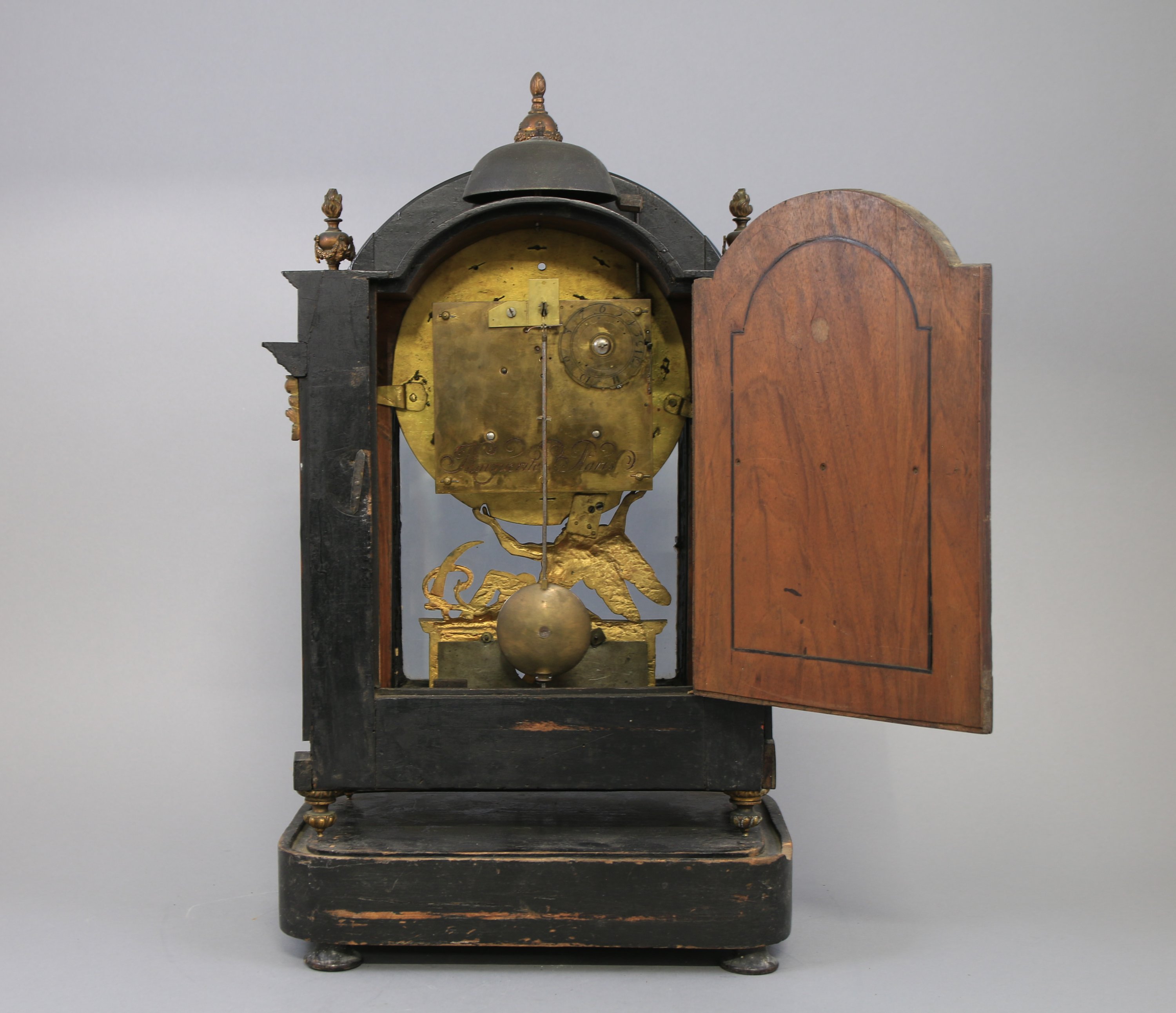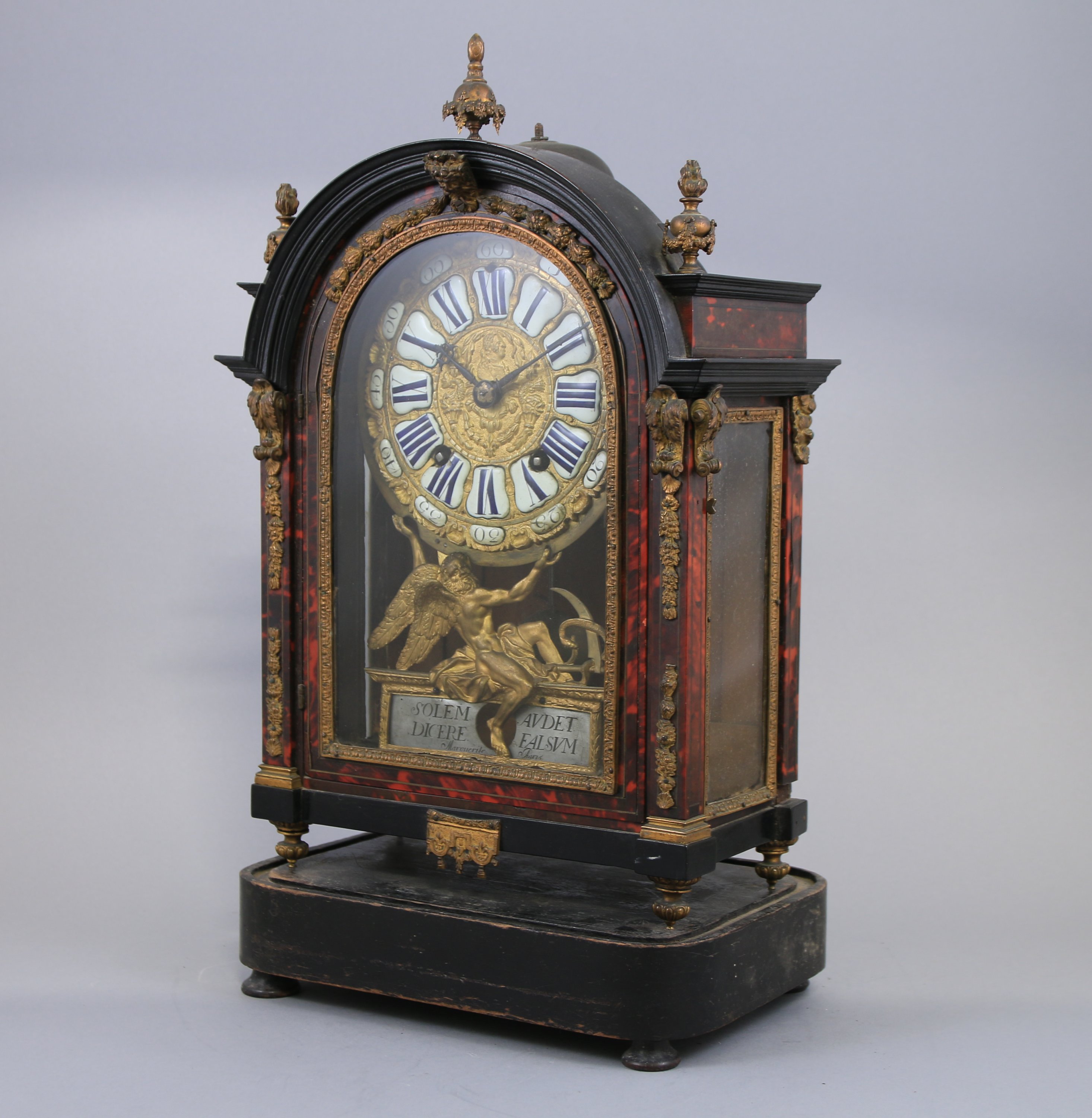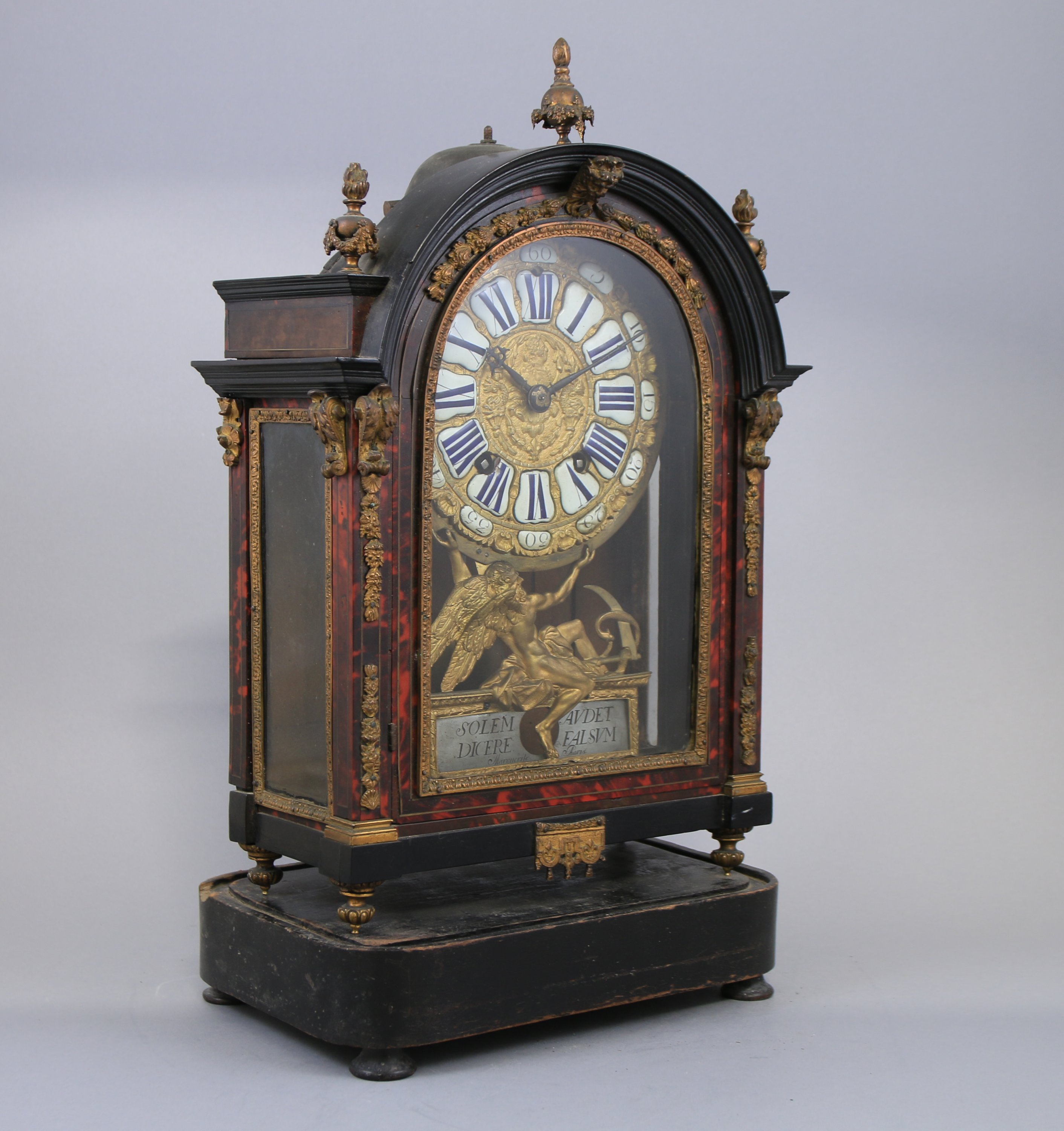 en ébène, placage d'ébène et écaille. Le cadran en laiton à décor en repoussé d'un profil entouré de deux dauphins indique les heures par des chiffres romains et les minutes par des chiffres arabes dans des cartouches en émail. Il est soutenu par Chronos avec la mention "Solem Avdet / Dicere Falsum". Signé "Marguerite Paris". La partie supérieure à décor de pots à feu prolongés par des pilastres. Elle repose sur quatre pieds toupies. La platine signée "Marguerite Paris". Suspension à Brocot.