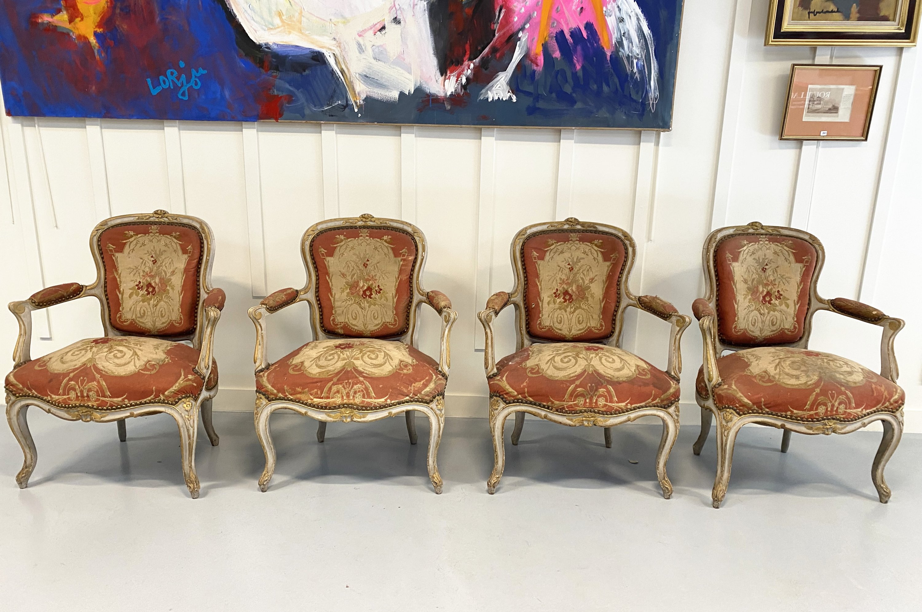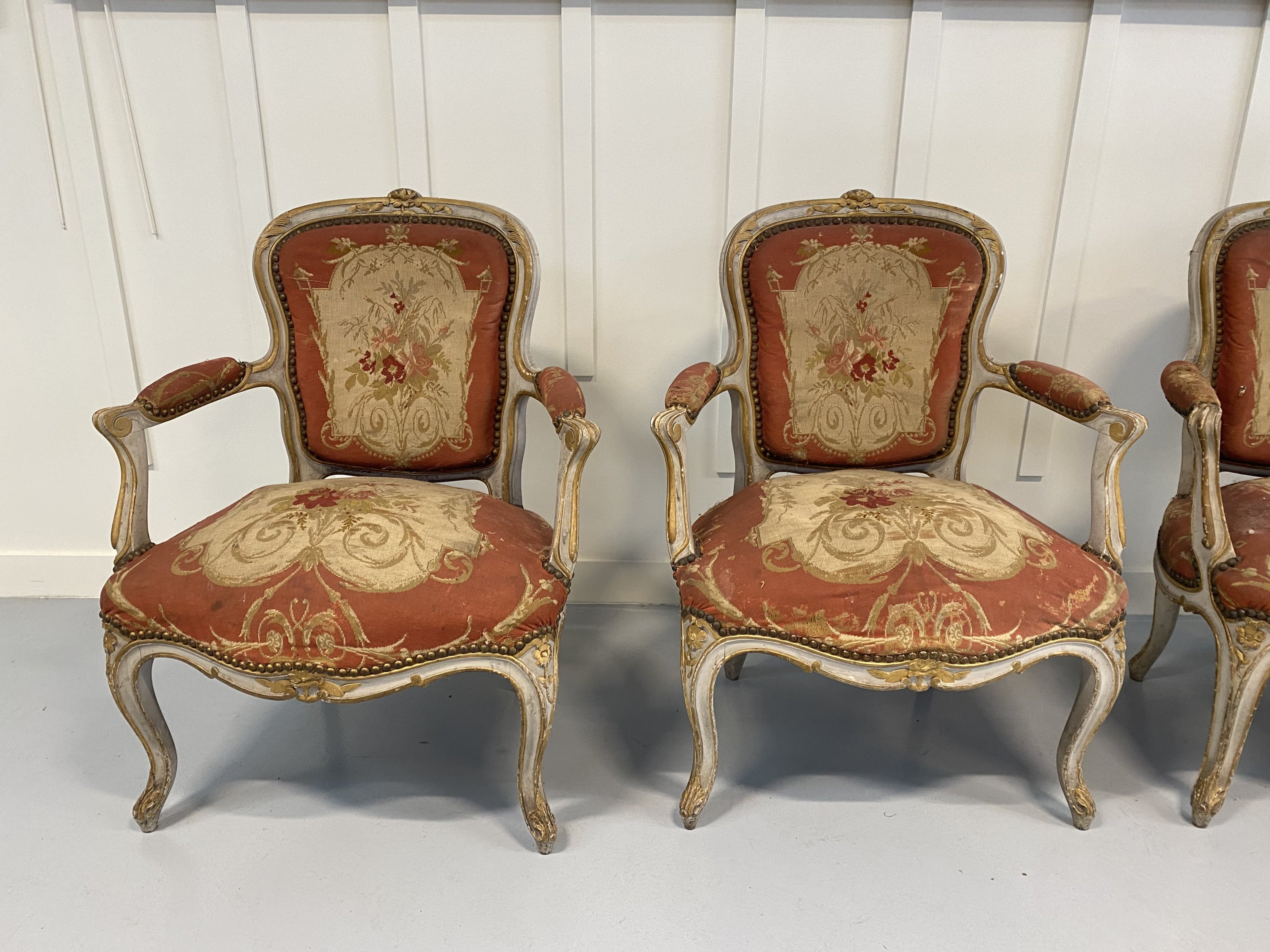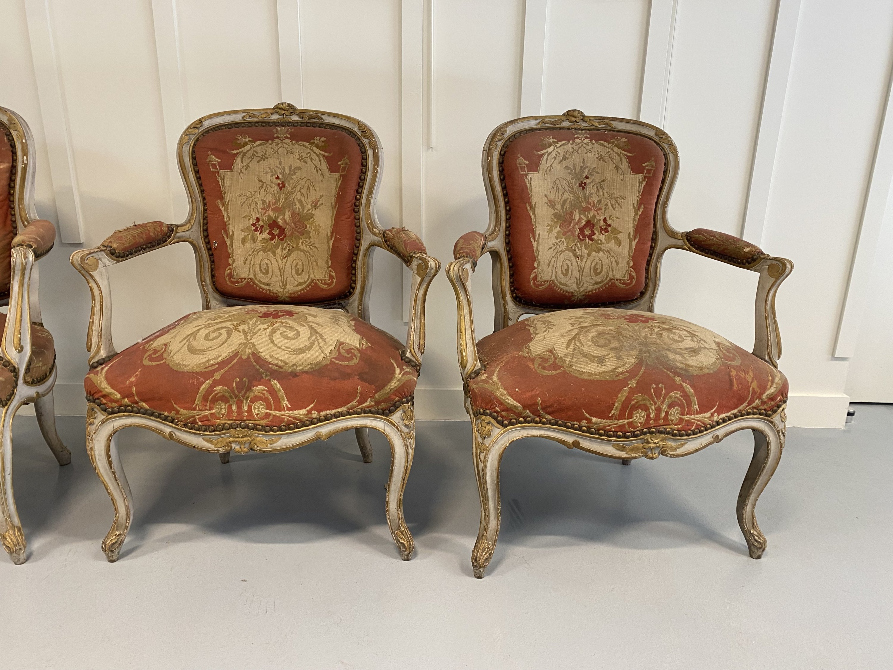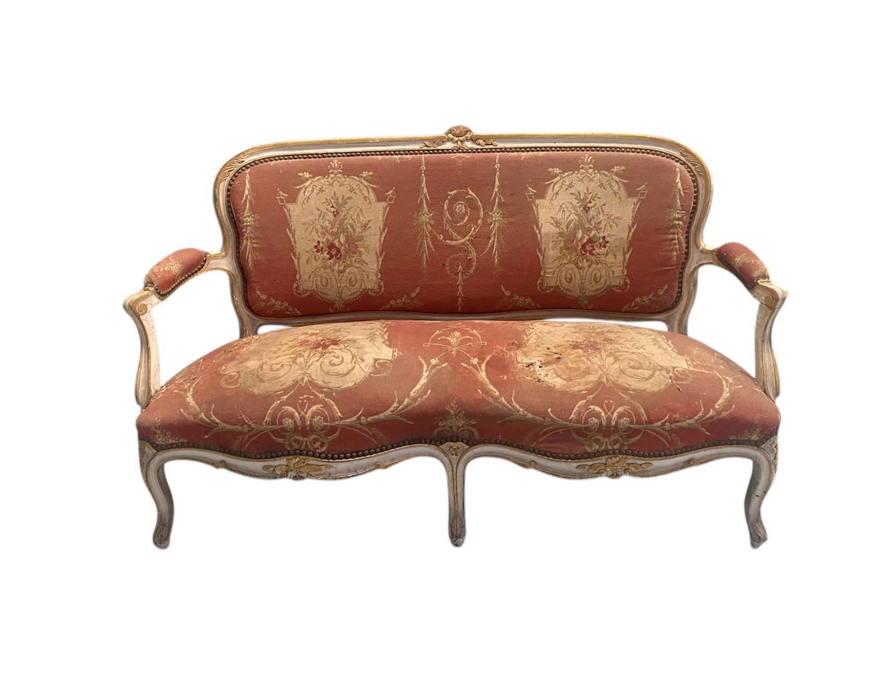 en bois mouluré, sculpté et laqué blanc et rehauts or reposant sur des pieds cambrés, comprenant quatre fauteuils cabriolets aux accotoirs à manchettes et un canapé deux places.