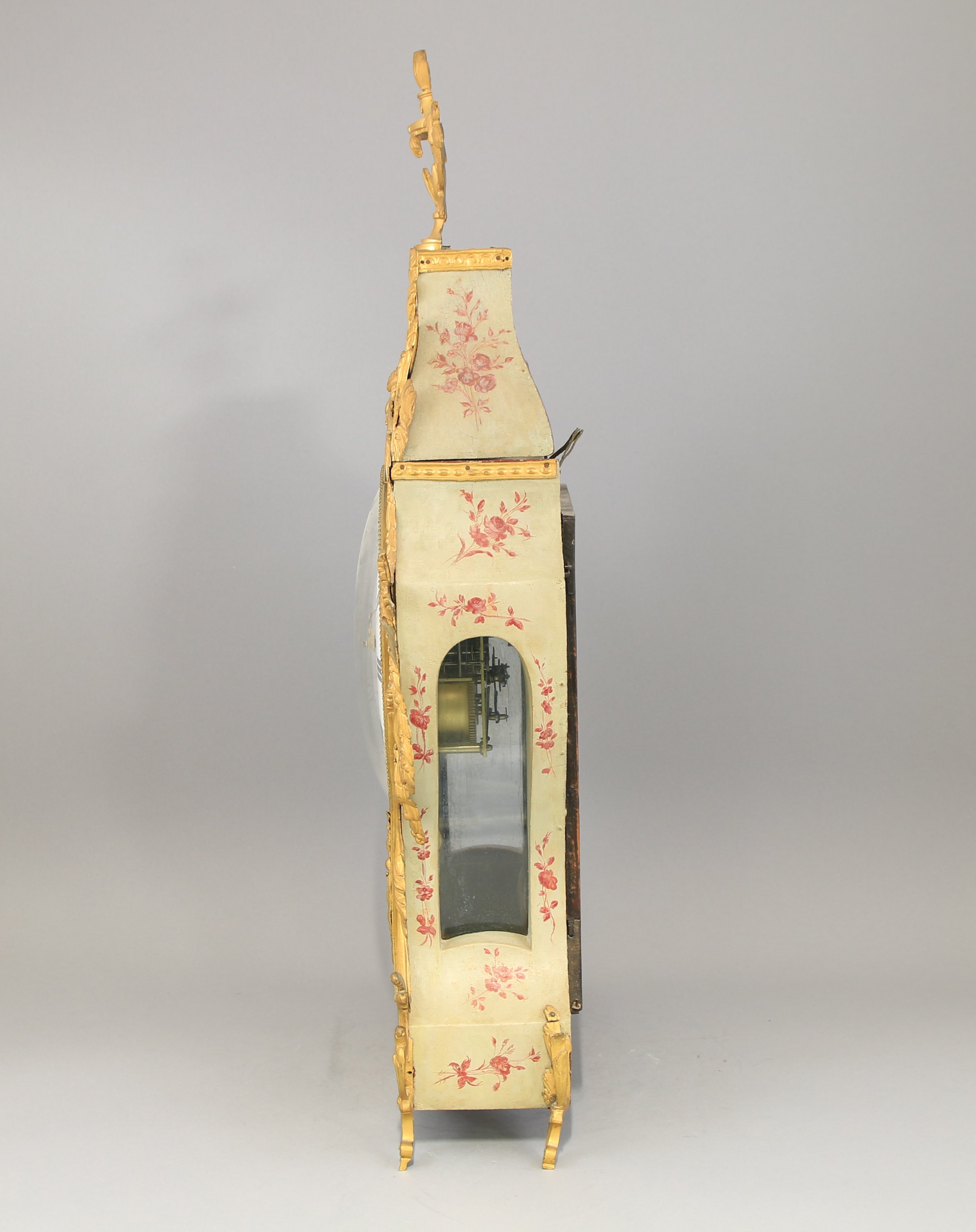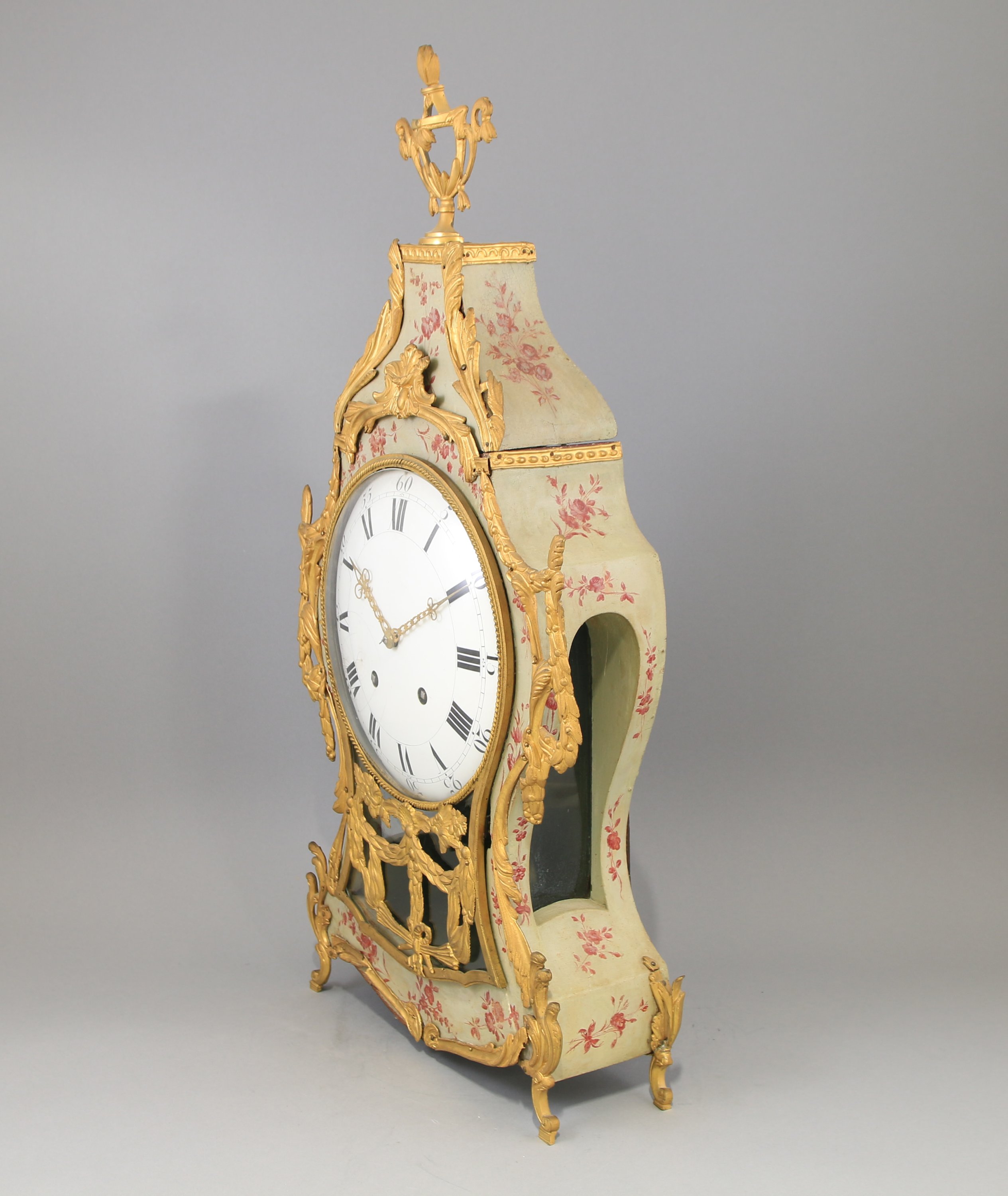 en vernis Martin coiffé en partie supérieure d'un vase. Le cadran émaillé blanc indiquant les heures en chiffres romains, les minutes par un chemin de fer.