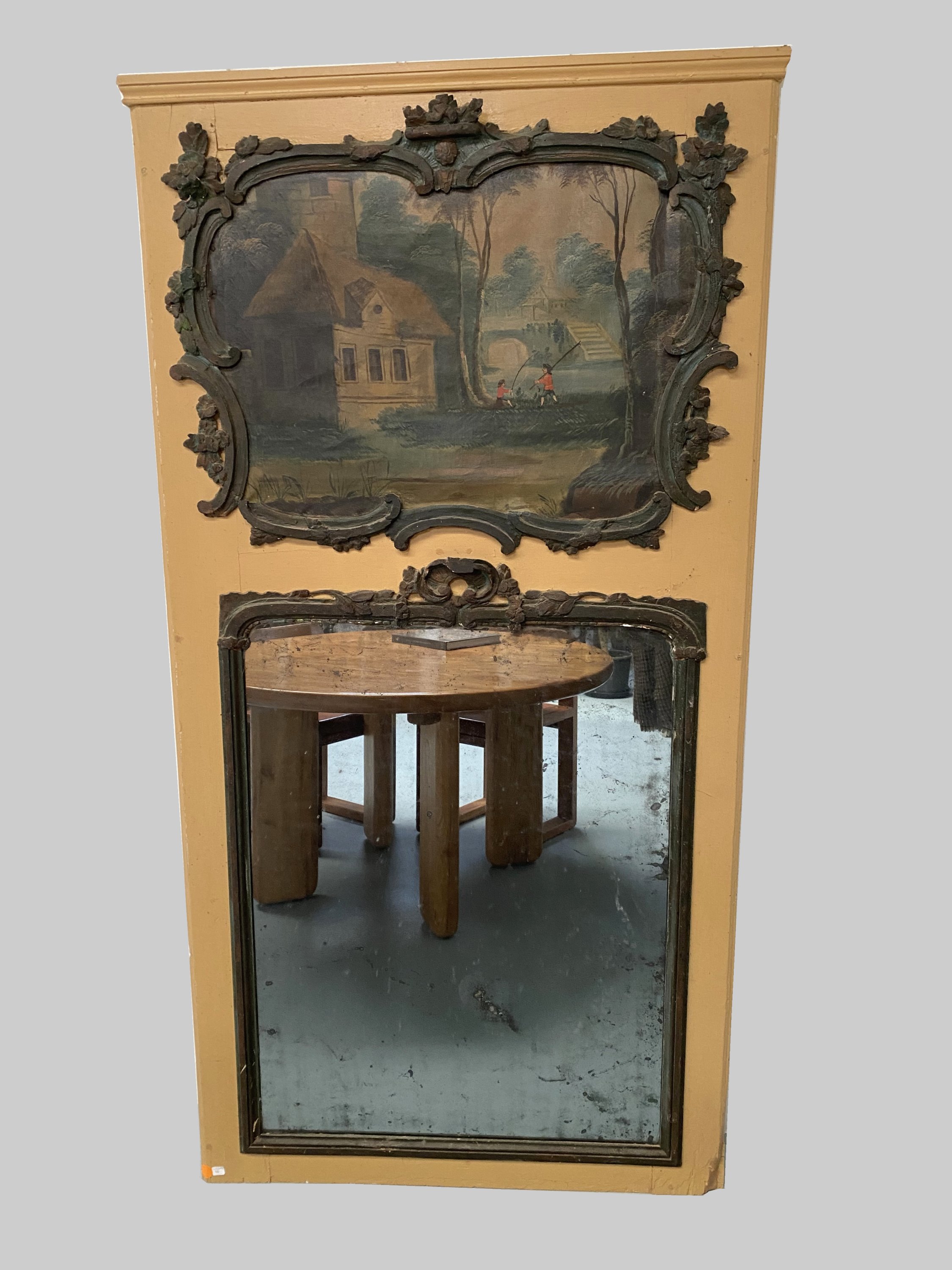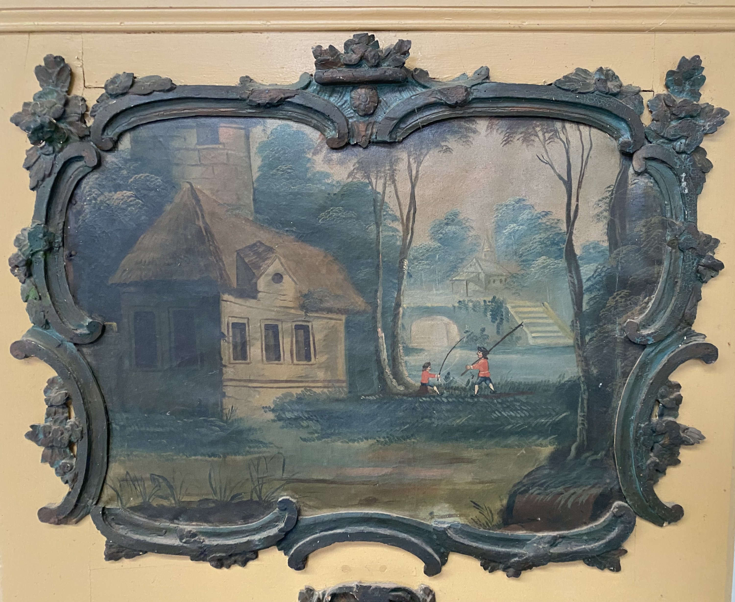 en bois mouluré, sculpté et laqué. Il est décoré d'une scène galante sur toile inscrite dans un encadrement rocaille feuillagé surmontant un miroir.