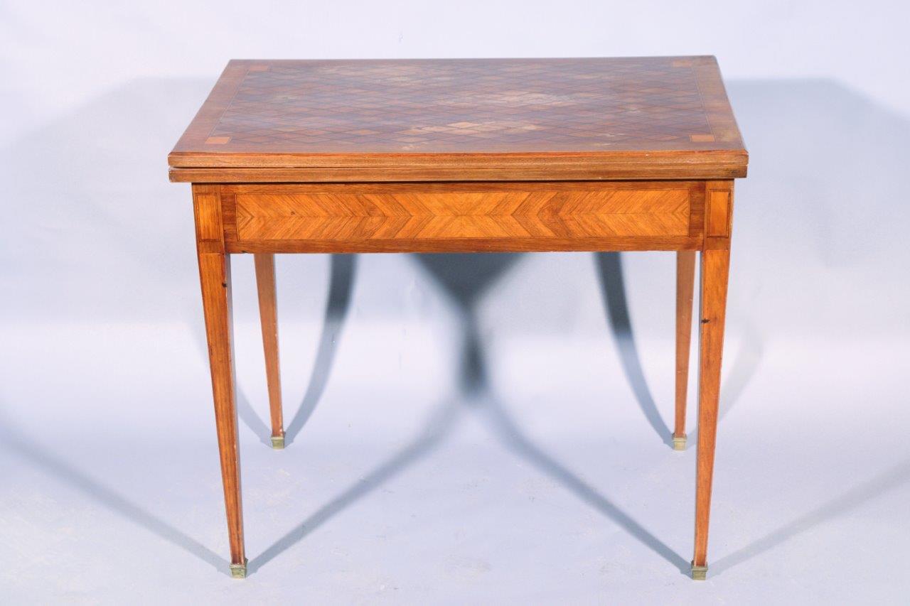 en placage de bois de rose et palissandre de forme rectangulaire. Le plateau tournant à décor de croisillons dans un entourage de filets de bois clair. L'intérieur formant tric-trac composé d'un feutre vert, la ceinture à un tiroir à décor de frisage en X. Elle repose sur quatre pieds gaines terminés par des sabots en laiton.