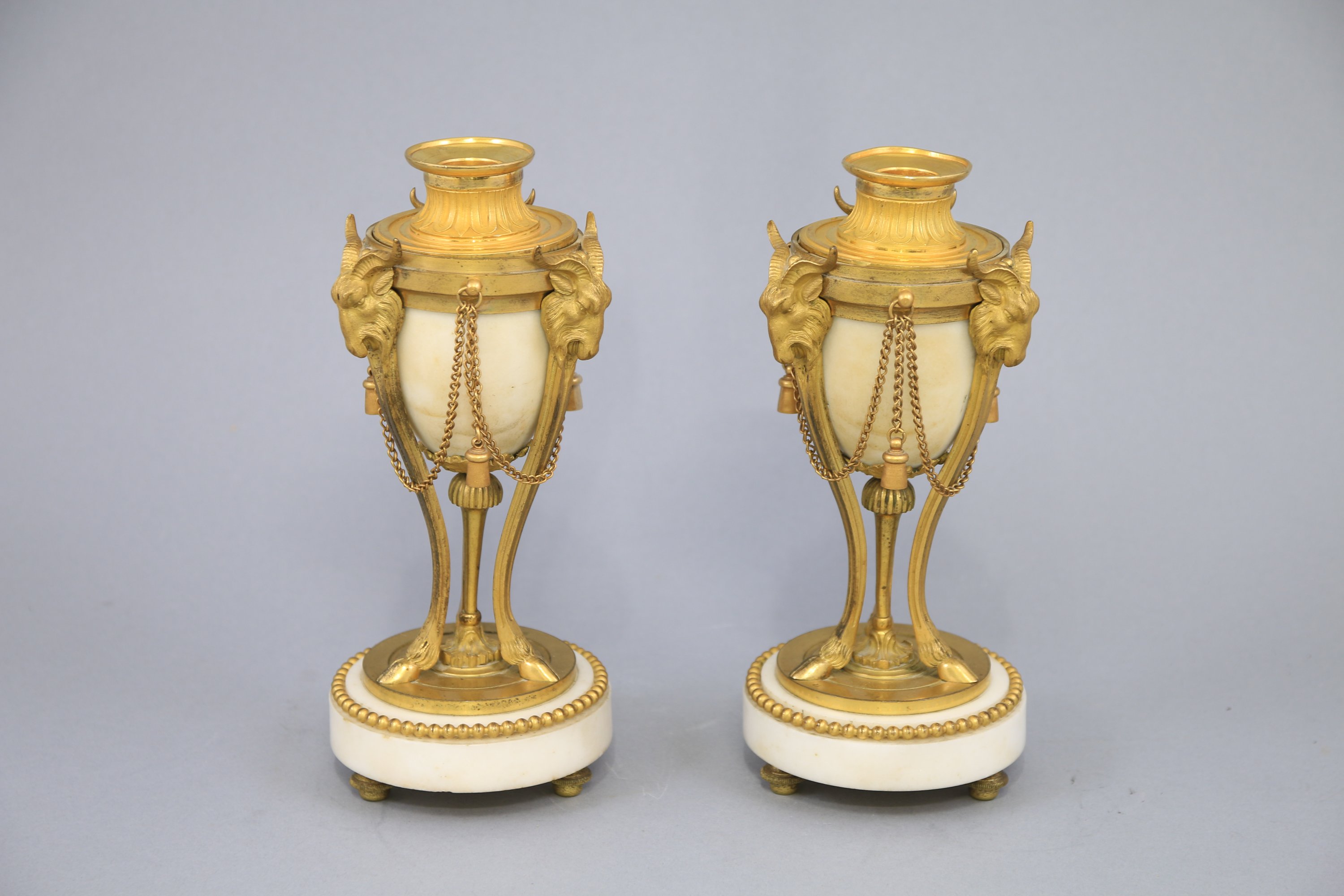 en marbre blanc, de forme ovoïde sur un piétement tripode en bronze doré et ciselé. La partie supérieure en dôme présente un fretel en forme de grenade sur une terrasse de feuilles se renversant pour former bougeoirs. Le piétement tripode en Athénienne à décor de têtes de bélier se terminant par des sabots. Un fût central fuselé terminé par une terrasse végétale. La base circulaire moulurée est soulignée par une frise de perles et soutenue par trois pieds à patins.