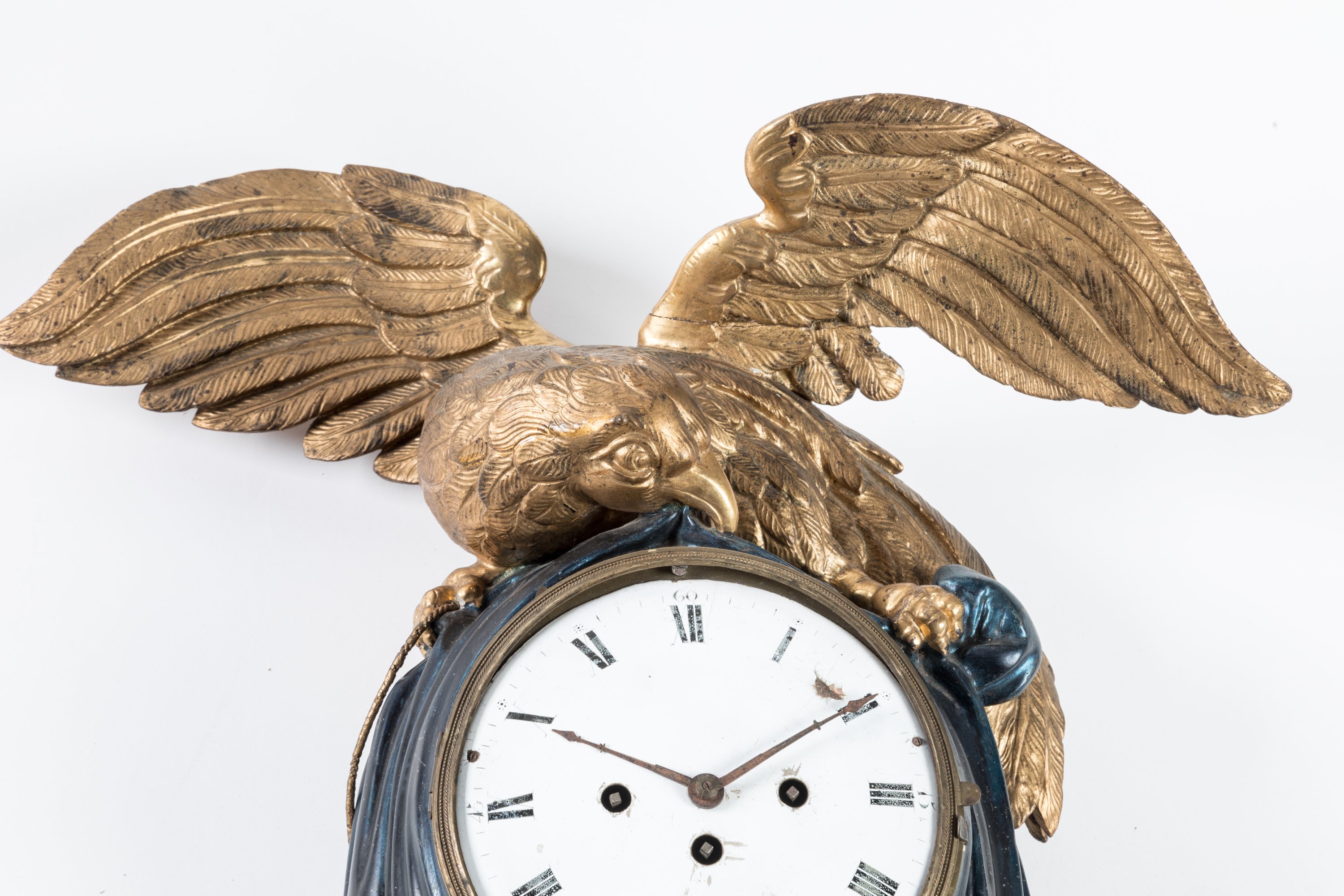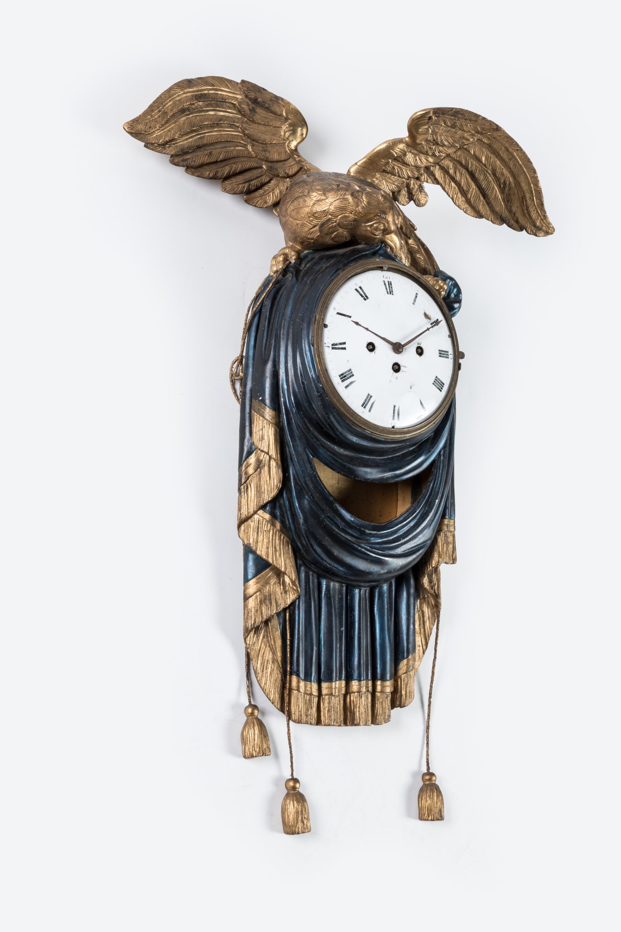 en bois sculpté polychrome et doré. Un aigle aux ailes déployées retient dans ses serres un cadran émaillé, les heures en chiffres arabes, sur un fond de draperies et passementerie.