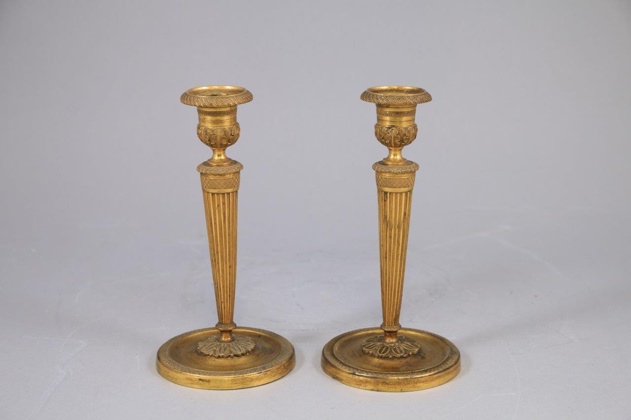 en bronze ciselé et doré. Les bobèches sont à décor de rangs de perles torsadés, les binets ornés de feuilles d'acanthe reposant sur des fûts cannelés et fuselés. La base circulaire soulignée d'une terrasse à motif floral.
