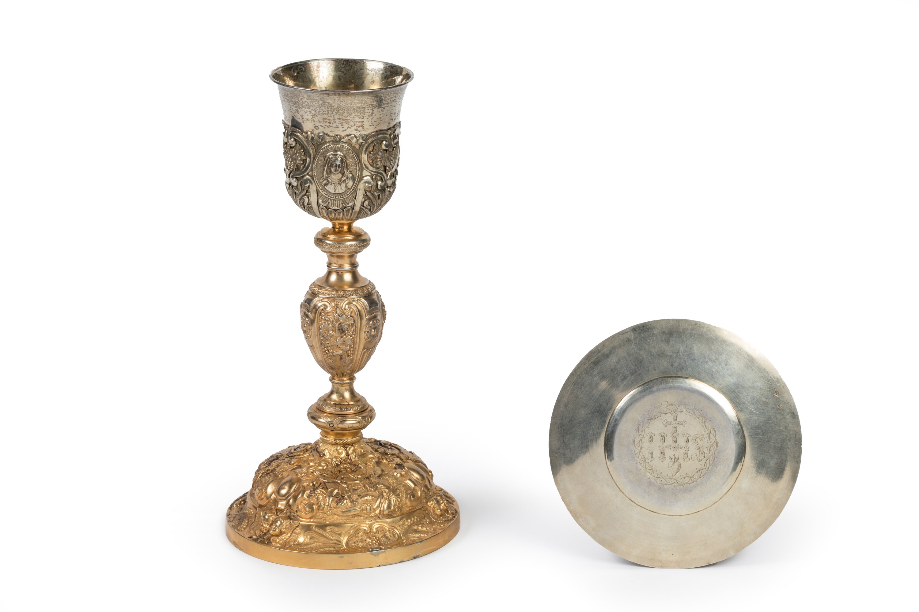 en vermeil. Le calice à lèvre évasée, à décor sur la fausse coupe de trois médaillons figurant le Christ, la Vierge Marie et saint Jean dans un entourage de rinceaux et pampres de vigne. Le fût balustre est orné de roseaux, épis de blé et pampres en alternance de rosettes. Le pied circulaire décoré de la Fuite en Egypte, la Déploration et l'Ascension, se termine par une doucine soulignée de têtes de putti, cartouches et motifs végétaux. La patène gravée au revers d'une couronne d'épines entourant le monogramme du Christ "IHS".