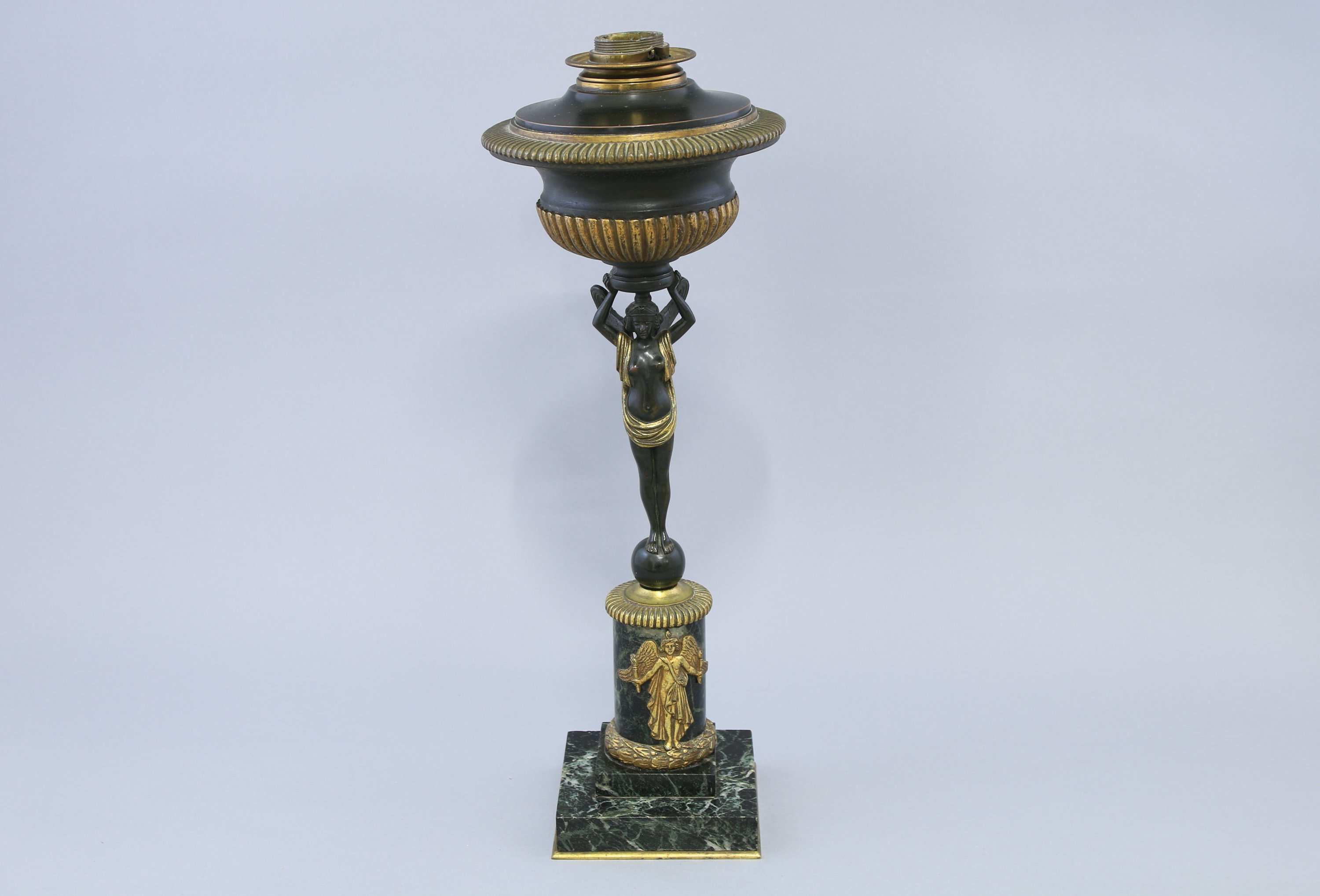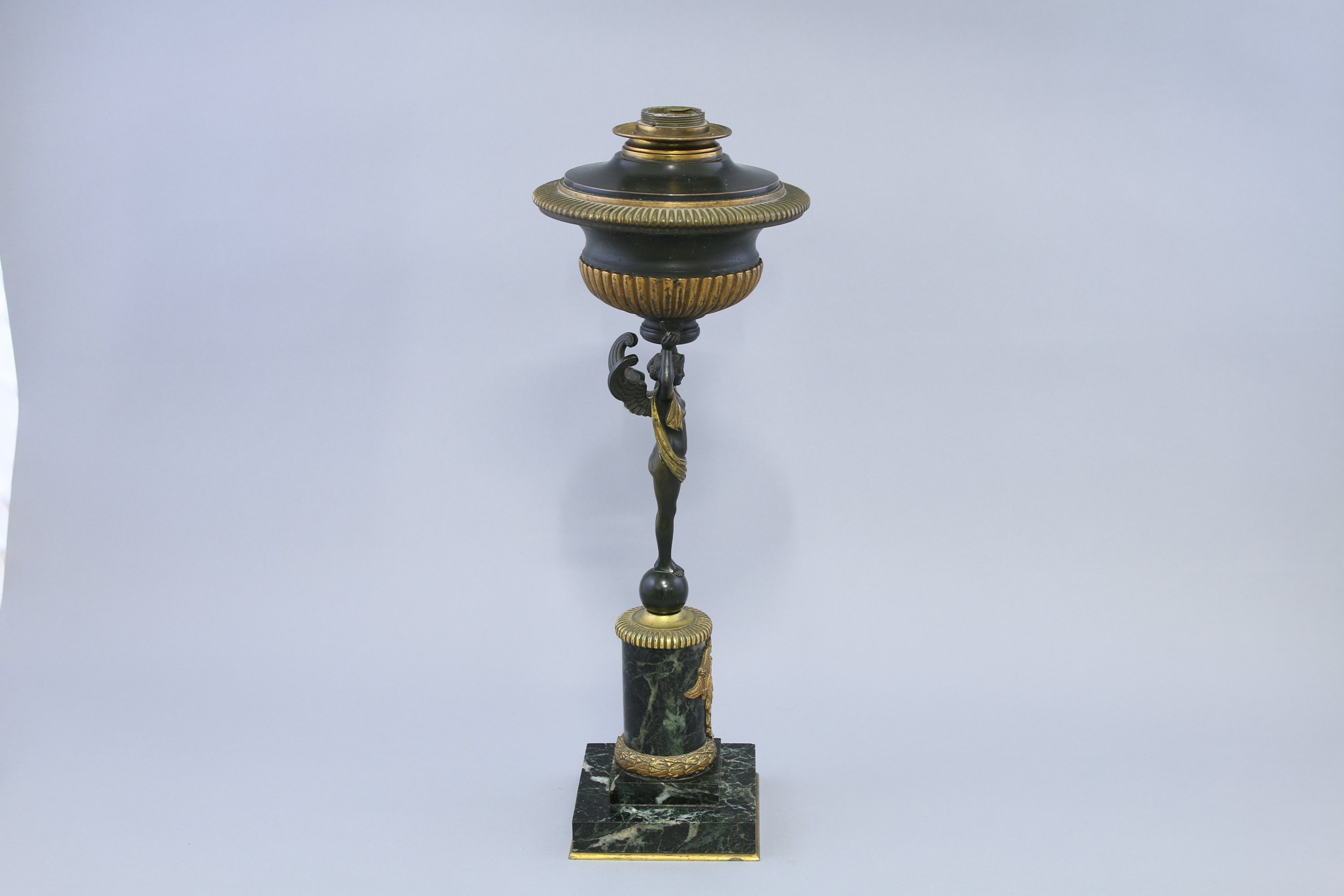 en bronze et marbre, à décor d'une femme ailée reposant sur une sphère. La base carrée.