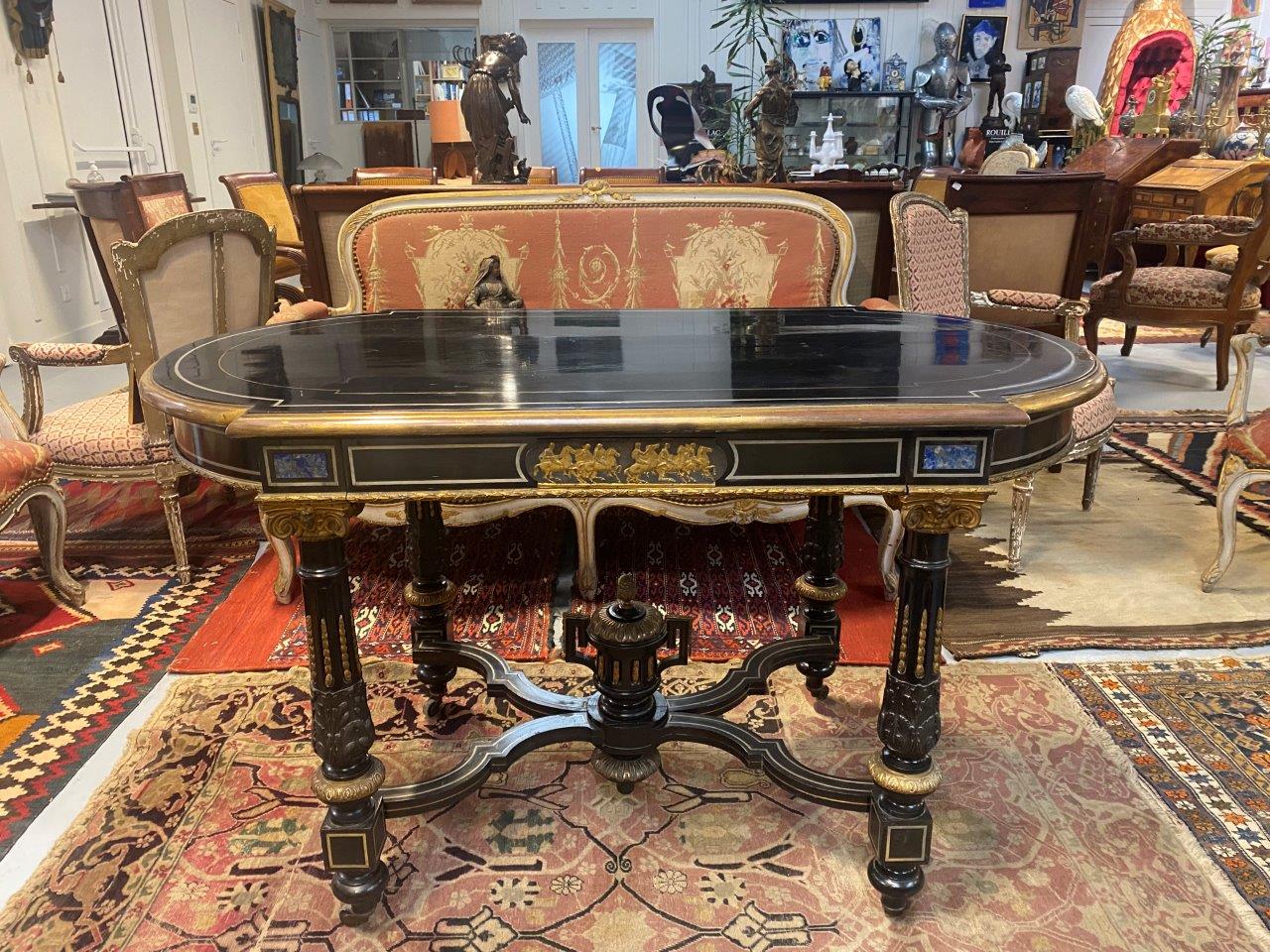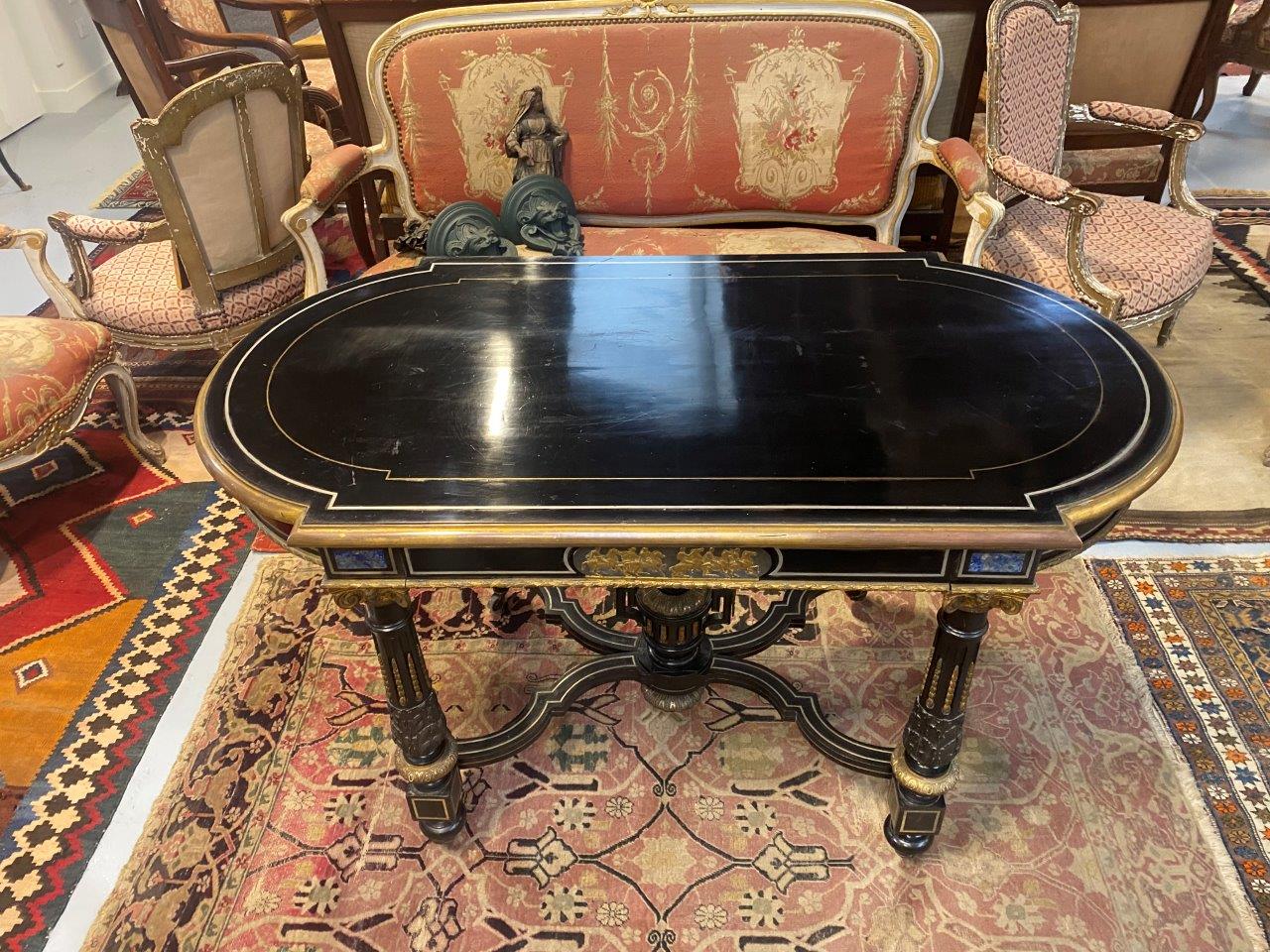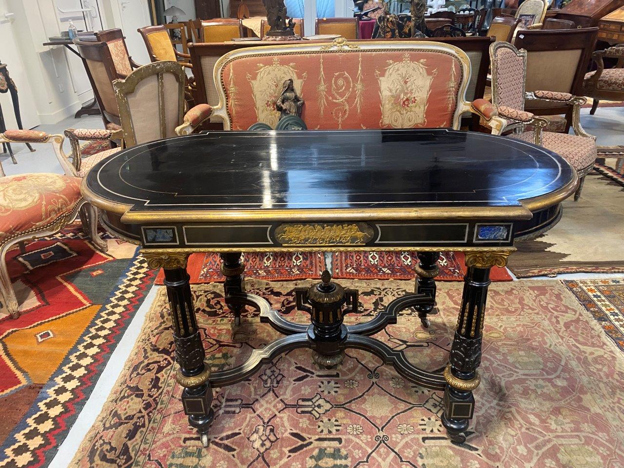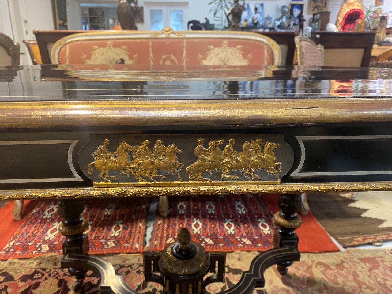 en bois et placage de bois noirci ouvrant par un tiroir en ceinture. Le plateau rectangulaire à côtés arrondis est orné de deux filets, l'un d'étain et l'autre de laiton, et souligné d'une lingotière à bec de corbin. La ceinture est décorée de filets d'étain, de lapis-lazuli, de deux plaques de laiton repoussé à décor de scènes à l'antique et d'une frise de laurier. Elle repose sur quatre fûts de colonne à chapiteaux corinthiens en bronze ciselé doré et se termine par des pieds sur roulettes. L'entretoise en X présente un vase godronné surmonté d'une pomme de pin.