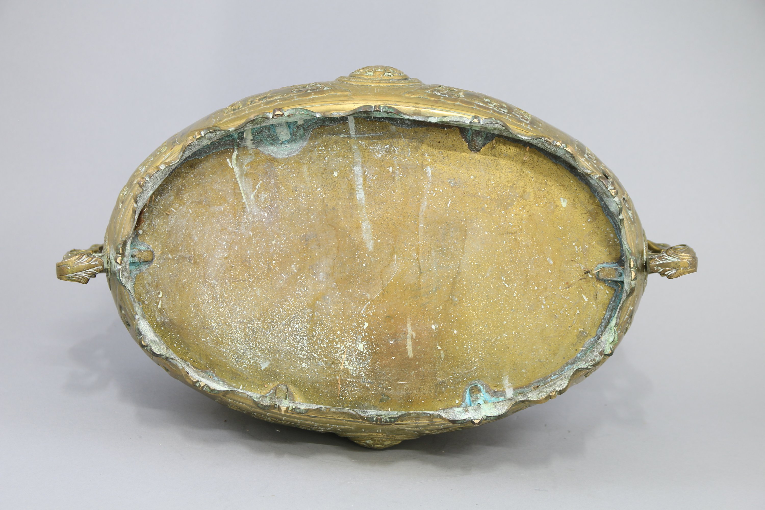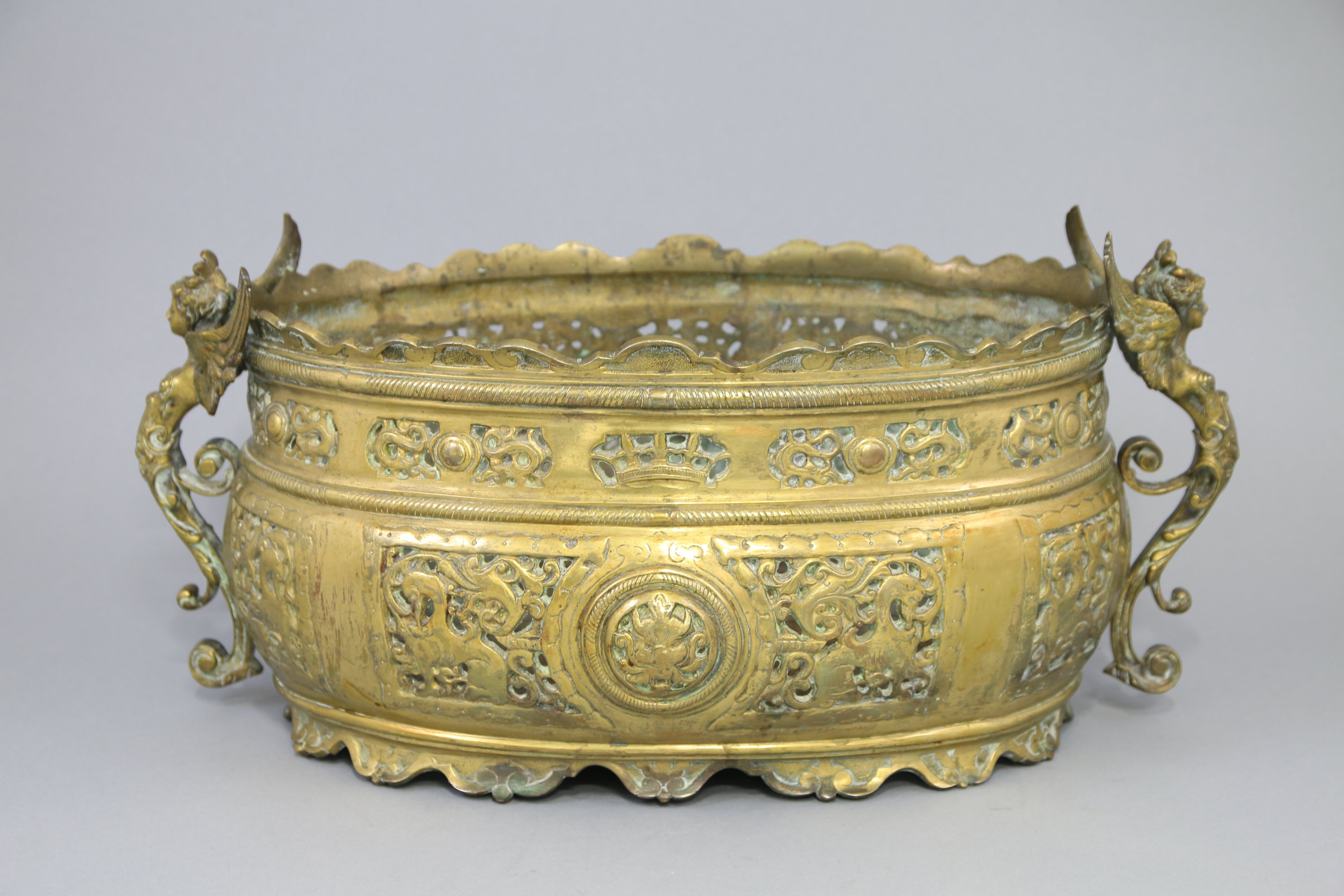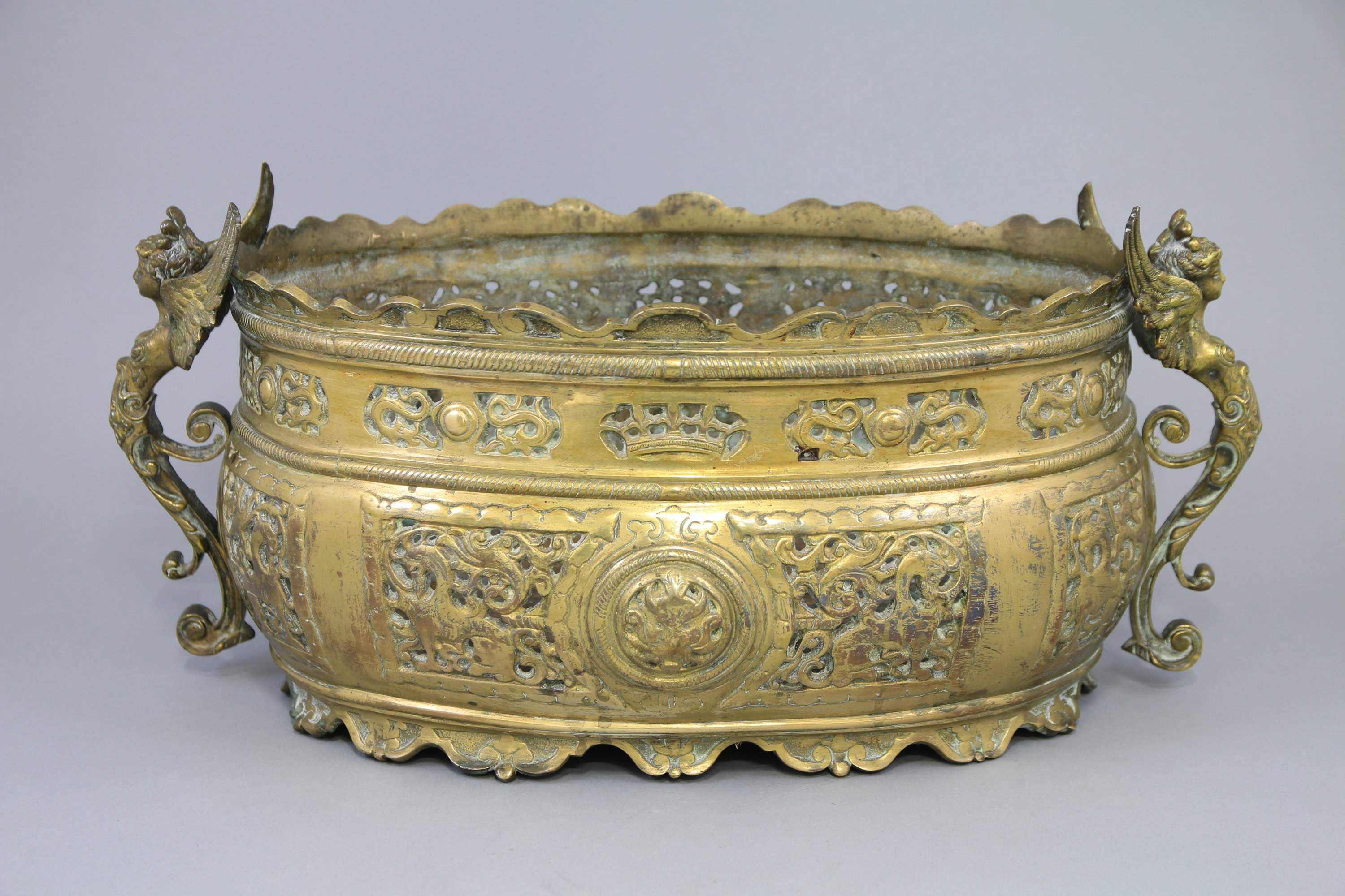 en bronze doré de forme ovale à deux anses retenues par un col à décor de vaguelettes surmontant des cartouches de rinceaux ajourés. Au centre, une couronne coiffe un médaillon entouré de deux dragons sur fond de rinceaux. Elle repose sur une base contournée.