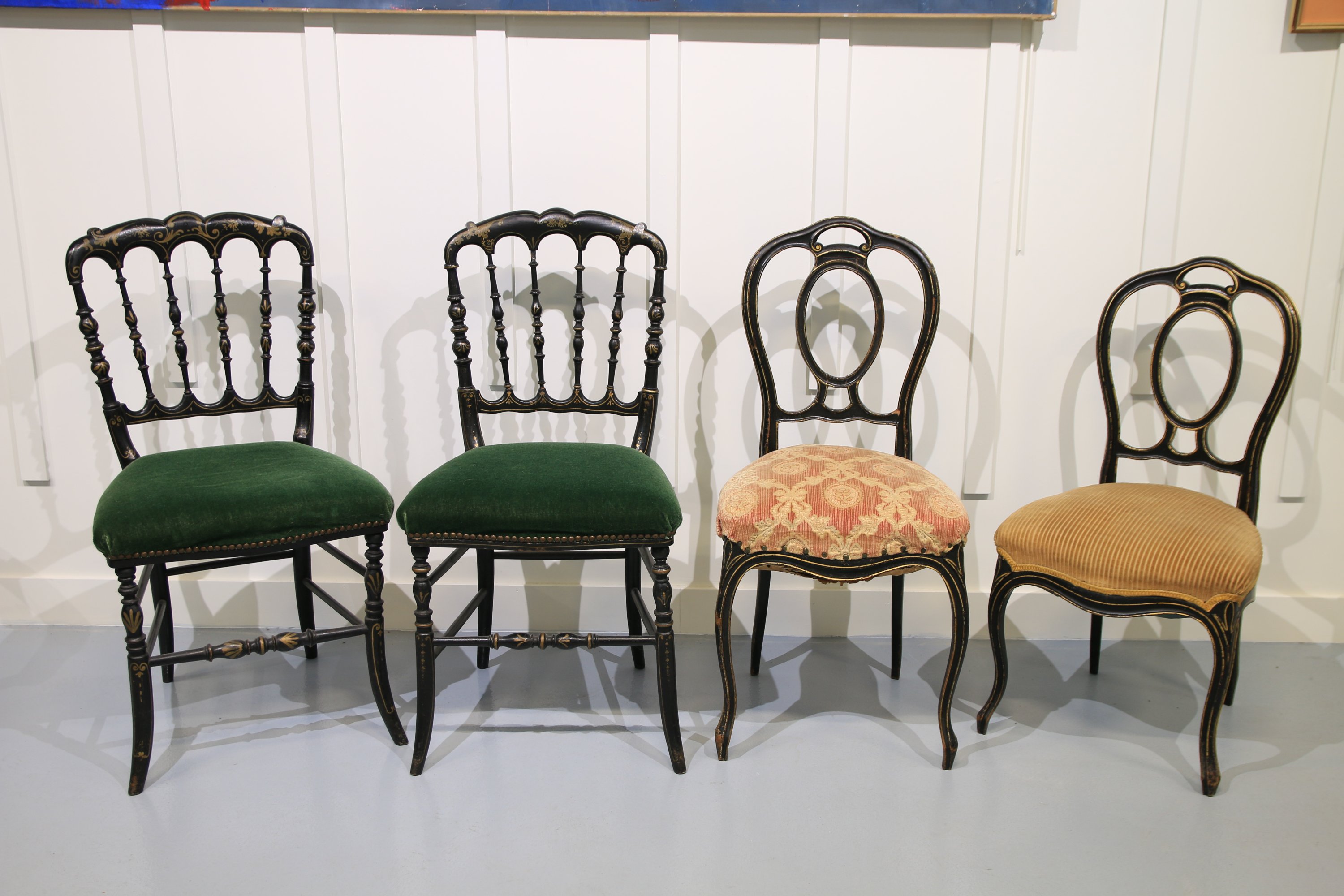 - Une chaise en bois noirci à dossier à la Reine reposant sur quatre pieds cambrés, les antérieurs terminés par des roulettes. Epoque Napoléon III. Recouverte d'un velours vert. Haut. 92 Larg. 55 Prof. 49 cm. (attaques d'insectes xylophages) ;