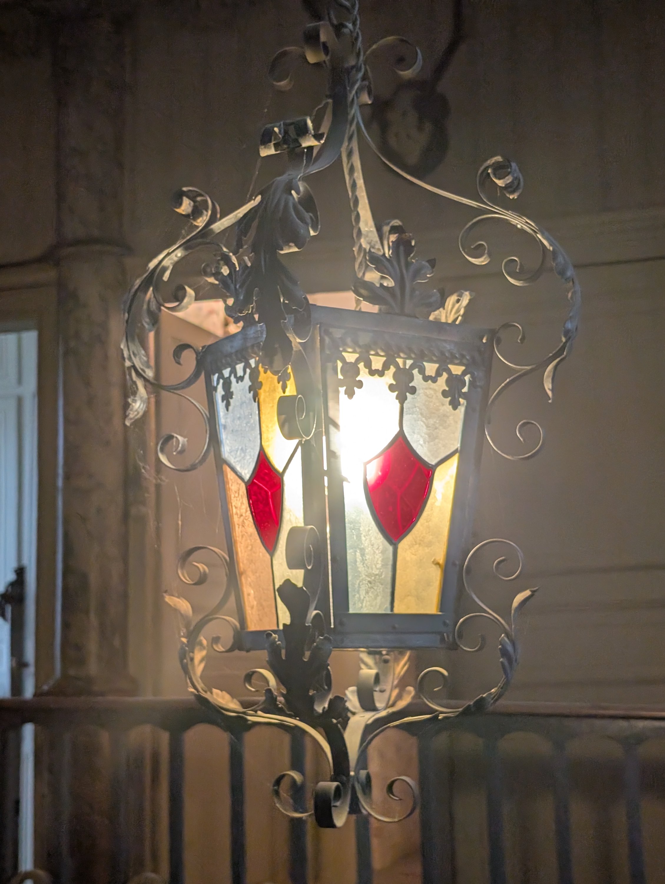 en fer forgé, de forme carrée, à quatre vitraux polychromes encadrés de volutes et enroulements.