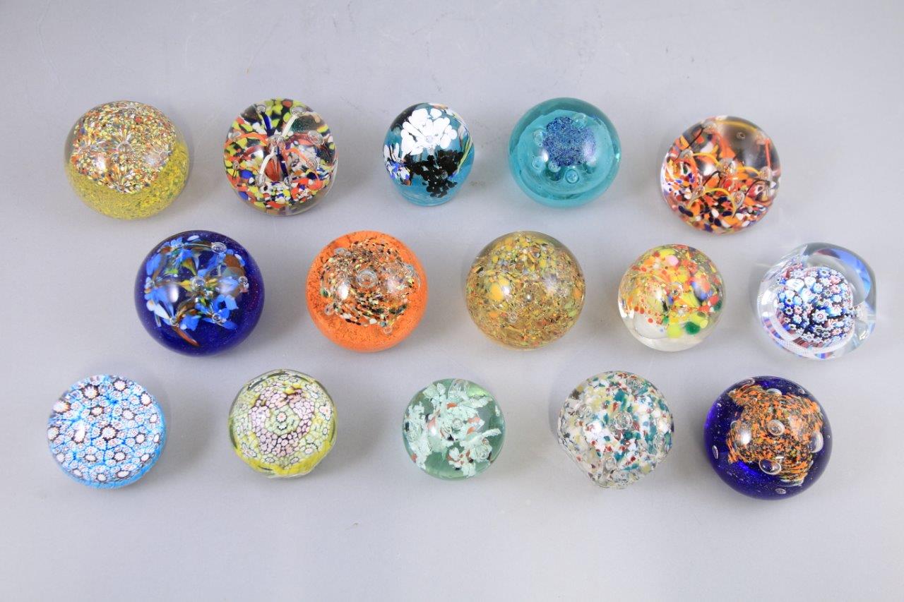 en verre et cristal, dont trois à décor "millefiori", quatre à motifs de fleurs et huit à décor torsadé ou géométrique.