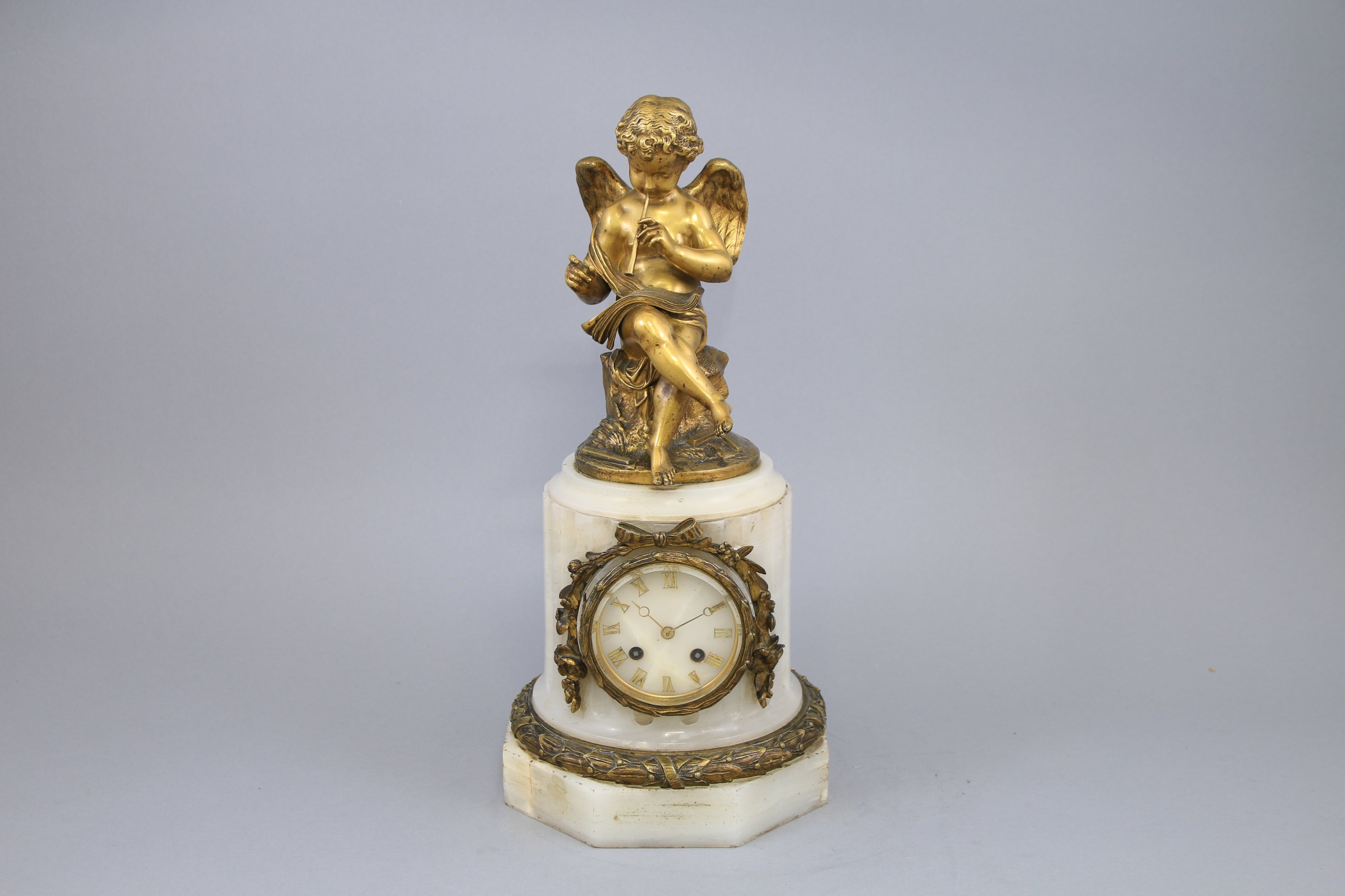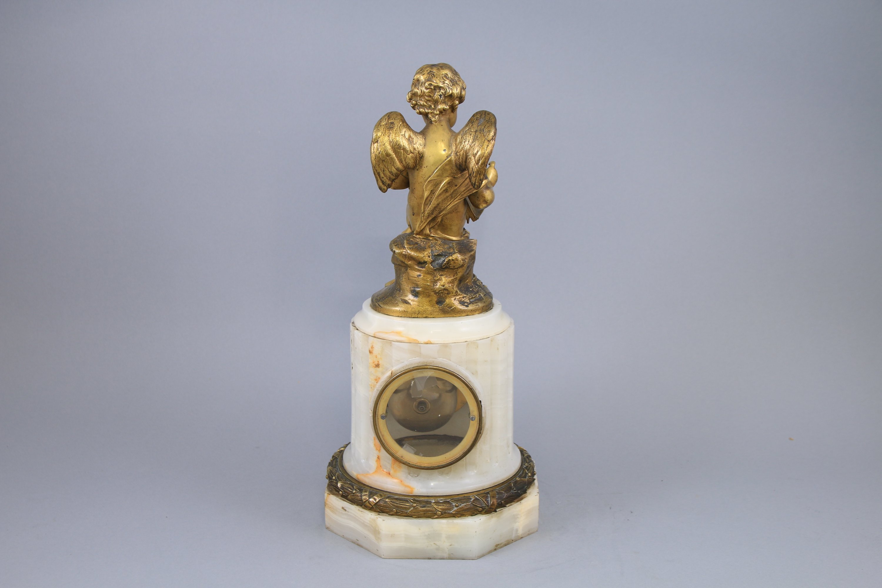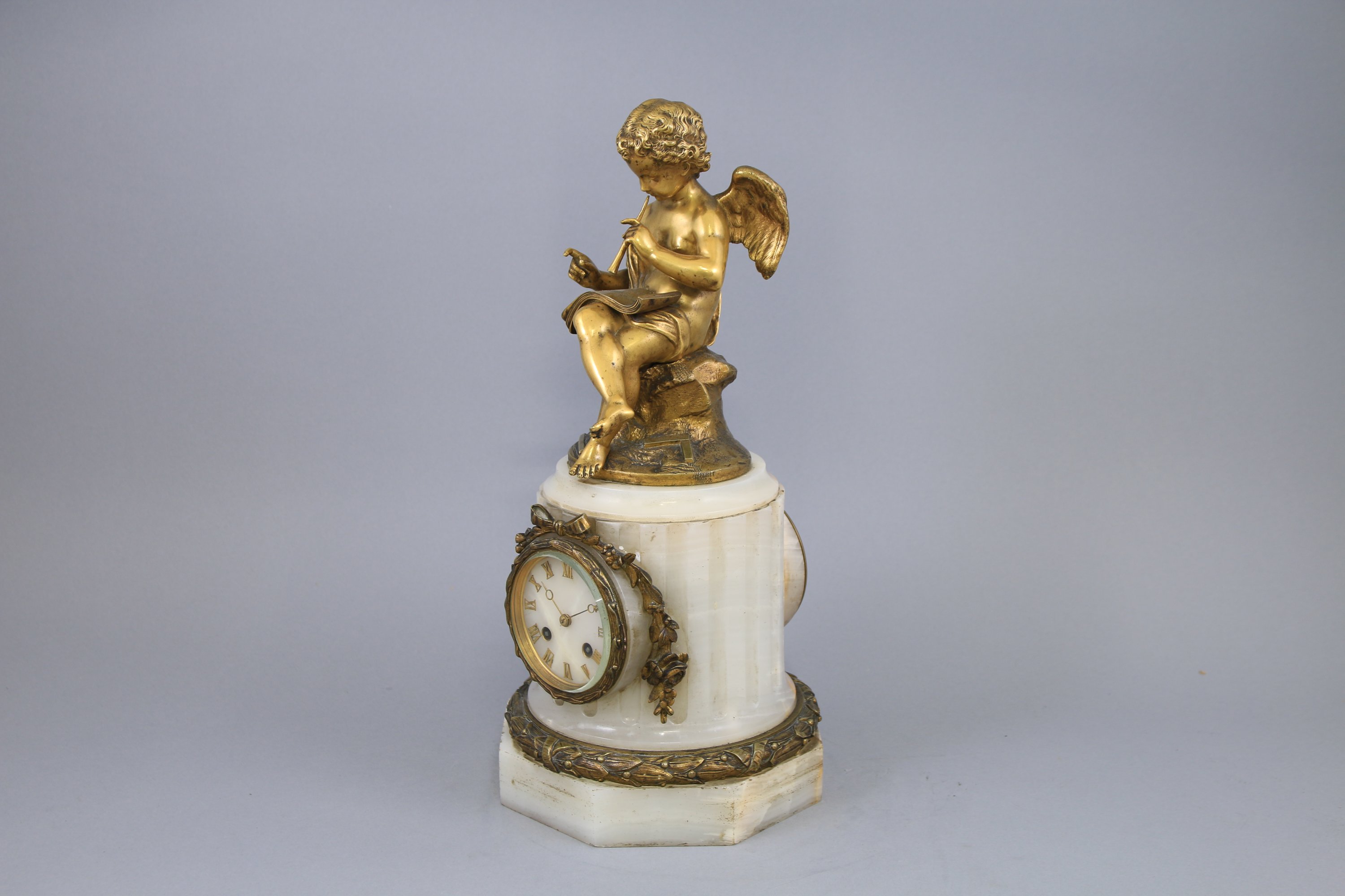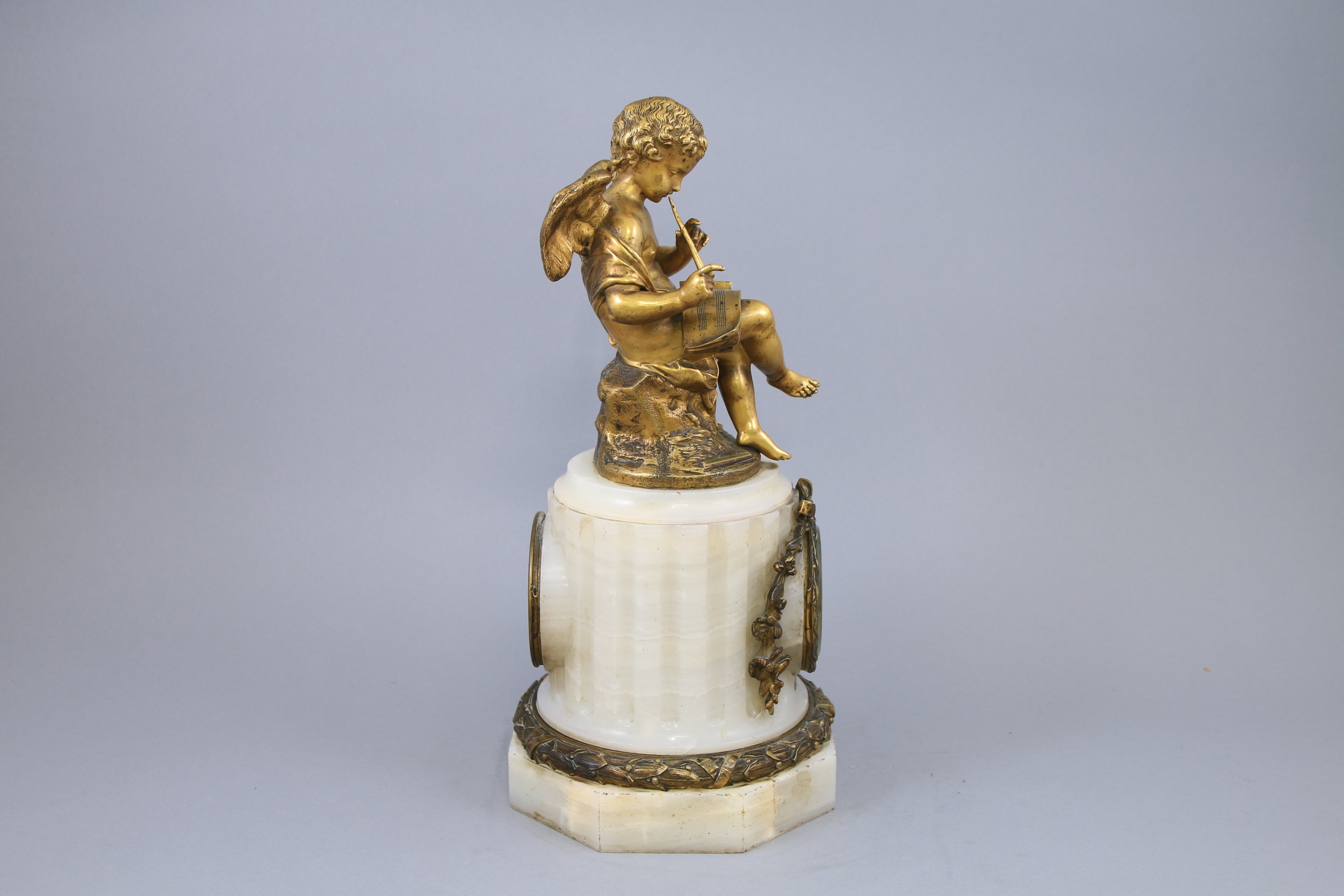 en onyx et bronze. Le cadran entouré d'une guirlande végétale indique les heures en chiffres romains. Il est inscrit dans une demi-colonne cannelée surmontée d'un sujet en bronze en forme d'un putto à la trompe et la partition de musique. L'ensemble repose sur une base octogonale décorée de tores de laurier.