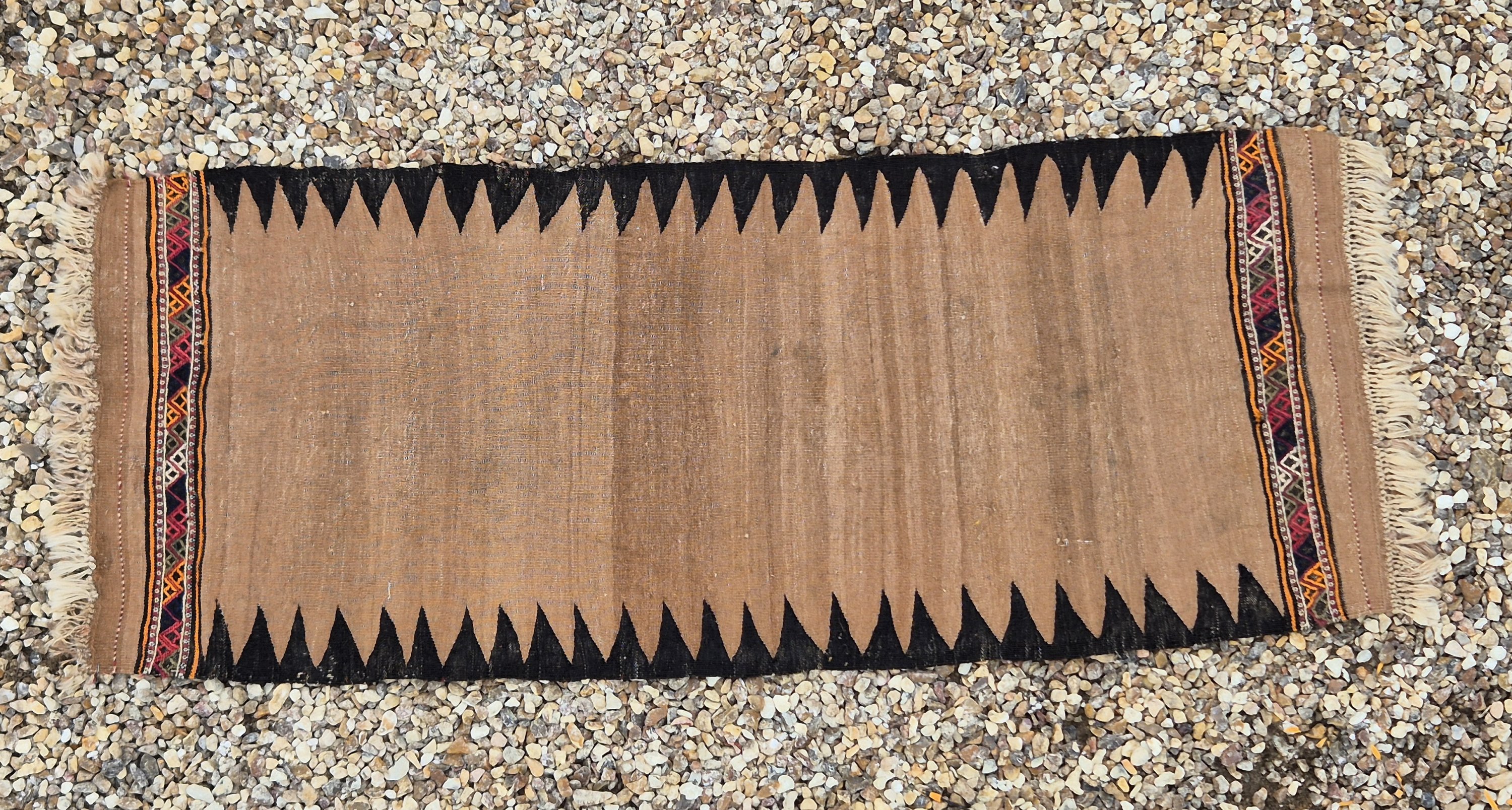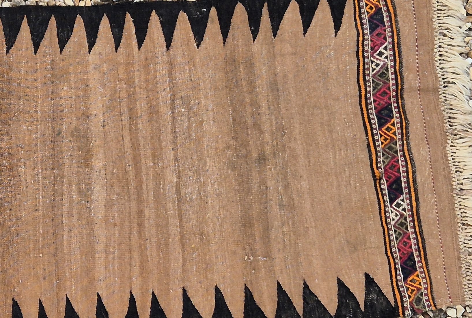 sur fond poil de chameau uni encadré par des motifs en forme de triangles noirs.
