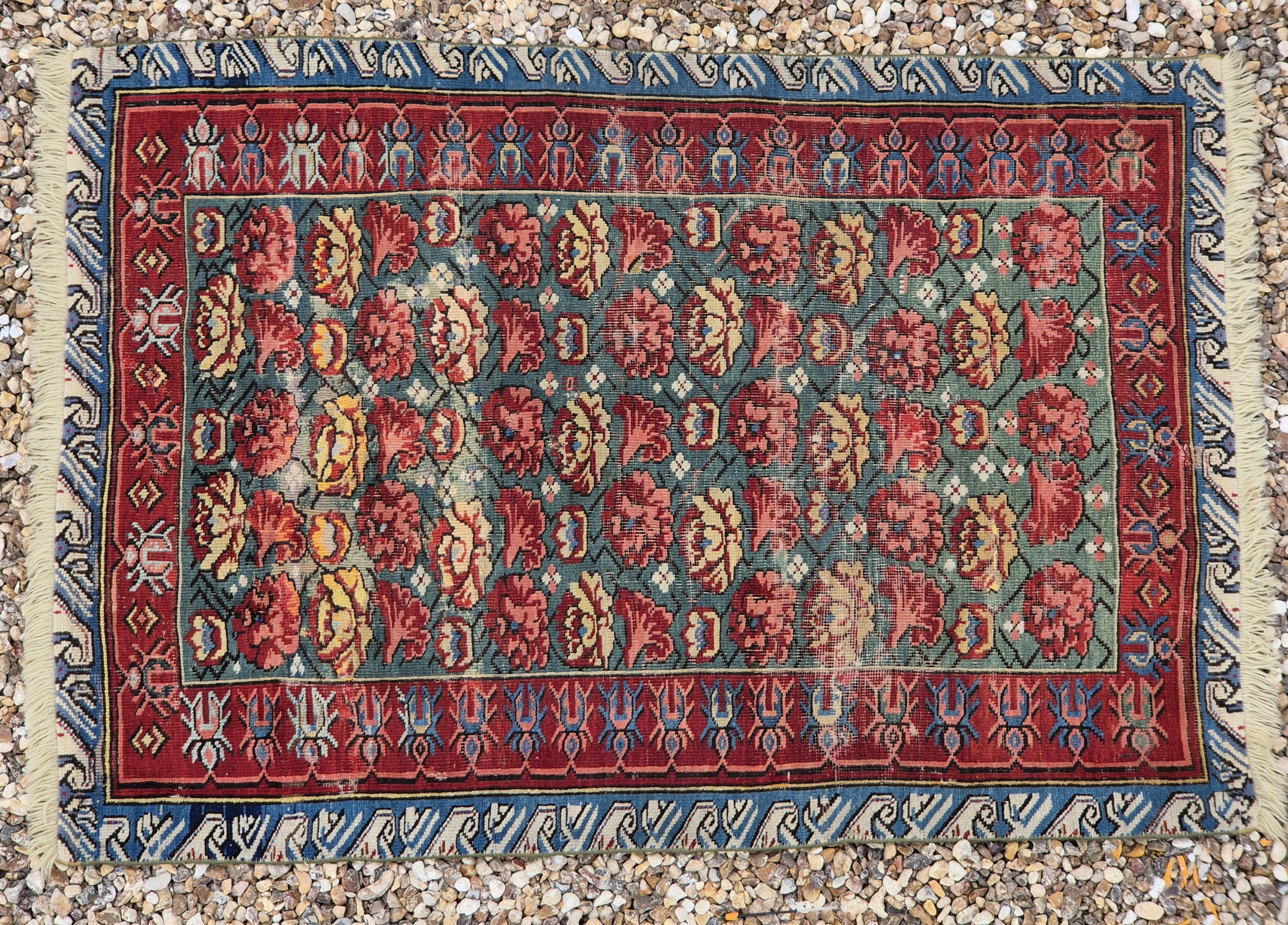 intéressant tapis ancien ou sur un fond vert se détache des roses stylisées rouge et bordure dite « à chien courant ».