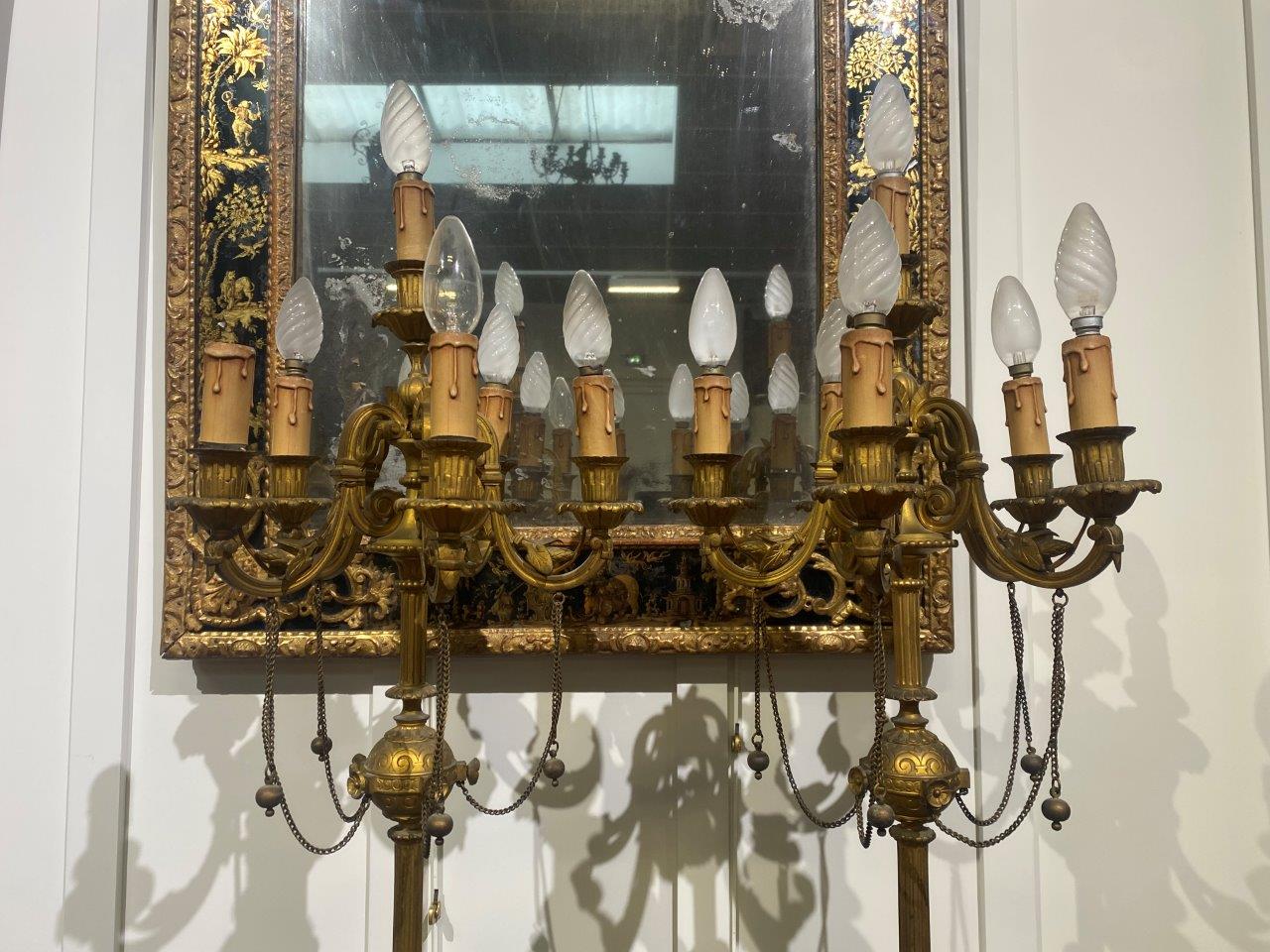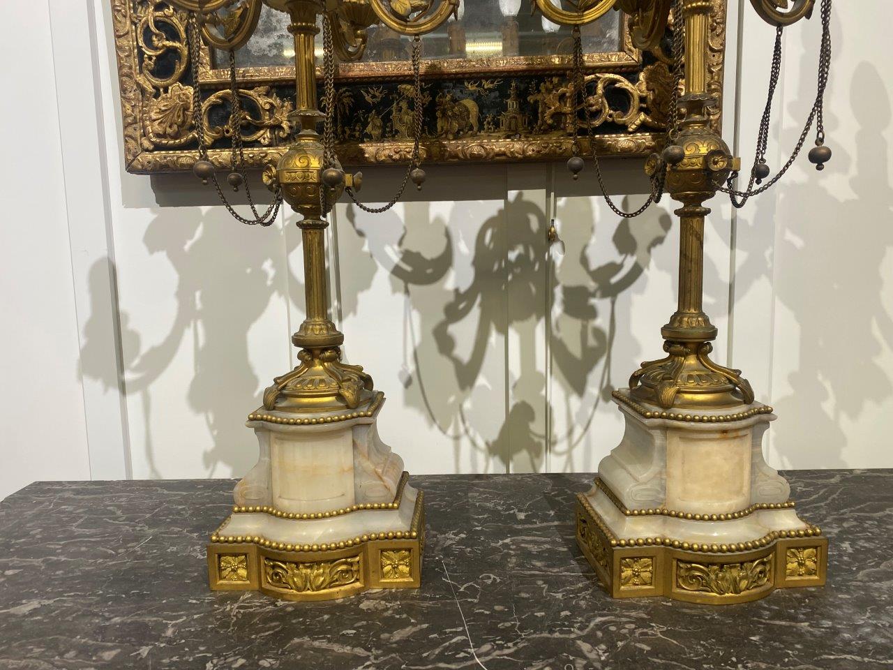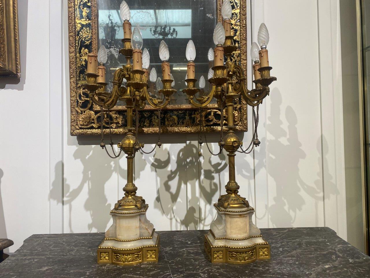 - Les candélabres à six bras de lumières à décor de feuilles d'acanthe réunis par des chainettes. Ils reposent sur un fût cannelé décoré d'une sphère en son centre. Base à degré en onyx.