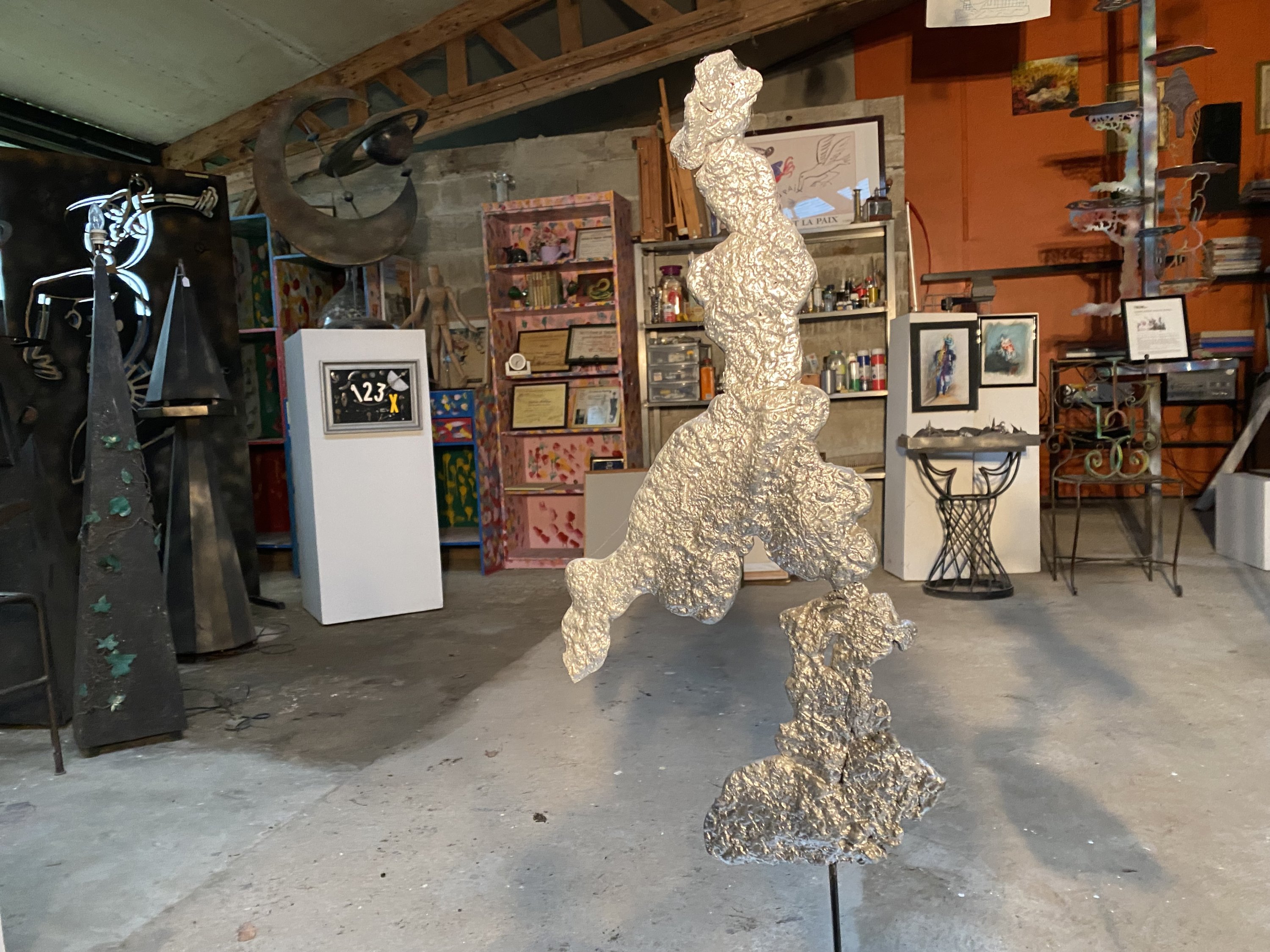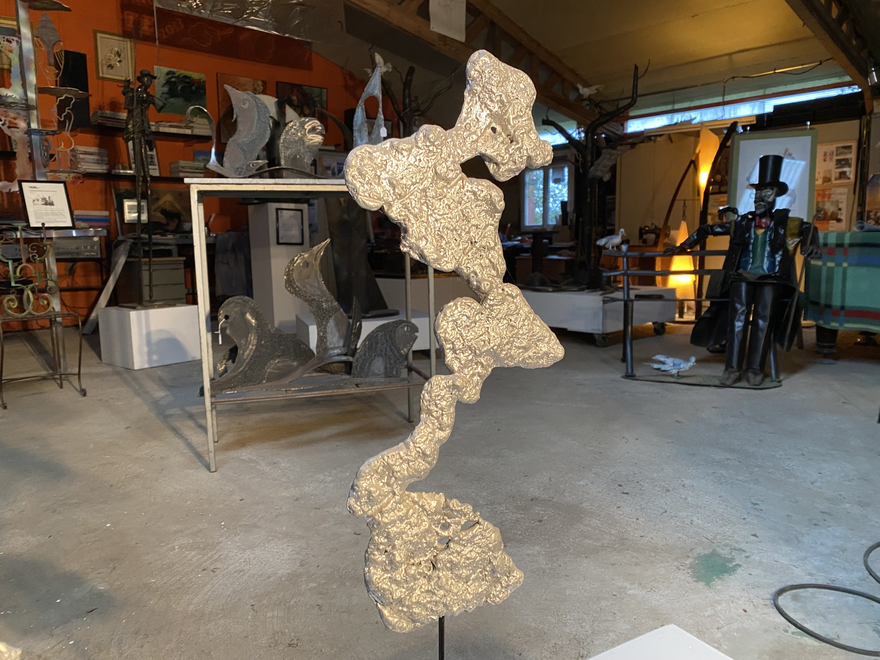 Deux sculptures en aluminium. Le piétement en acier.