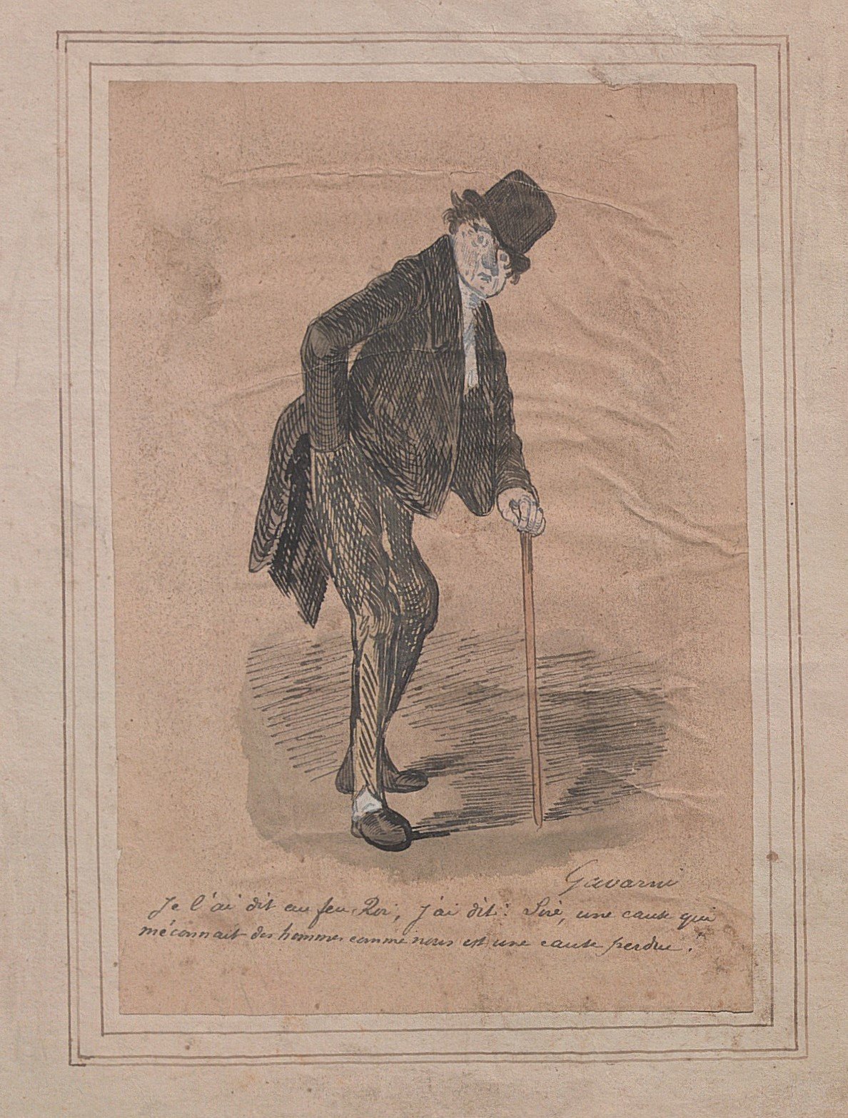 Dessin original signé, encre, lavis d’aquarelle et rehauts de blanc, légendé à la plume : « Je l’ai dit au feu Roi, j’ai dit : Sire, une cause qui méconnait des hommes comme nous est une cause perdue », 18 x 12 cm ;