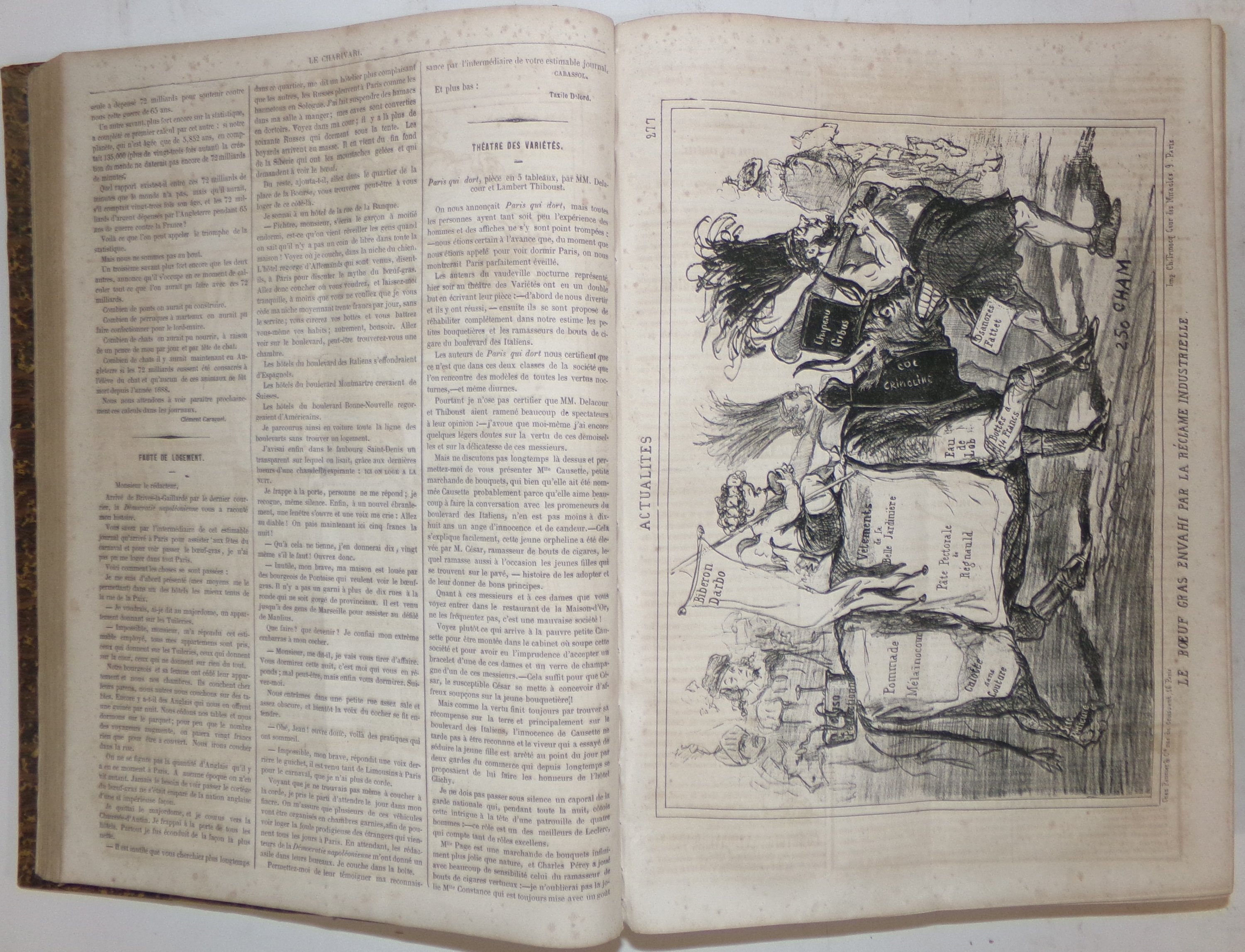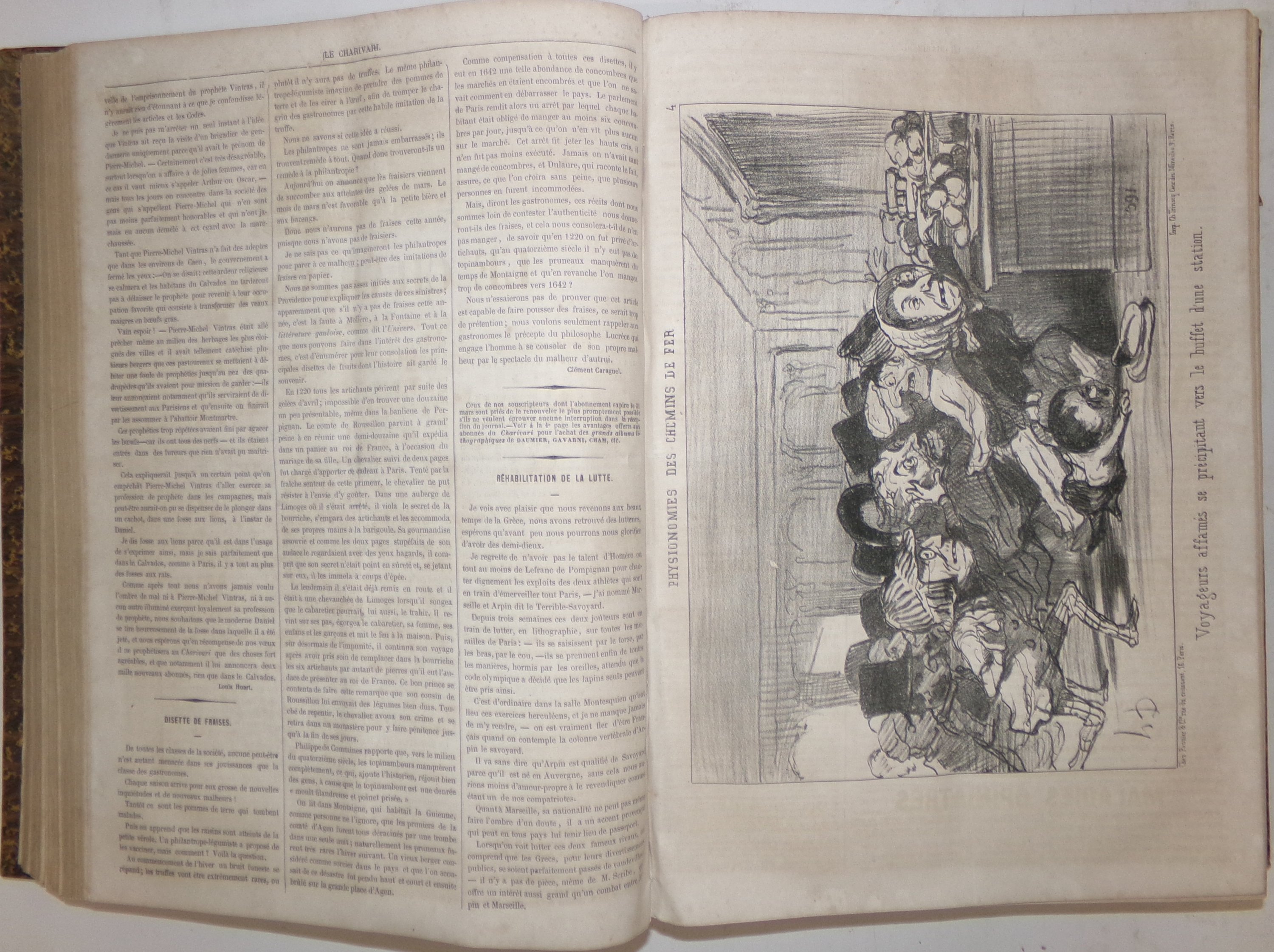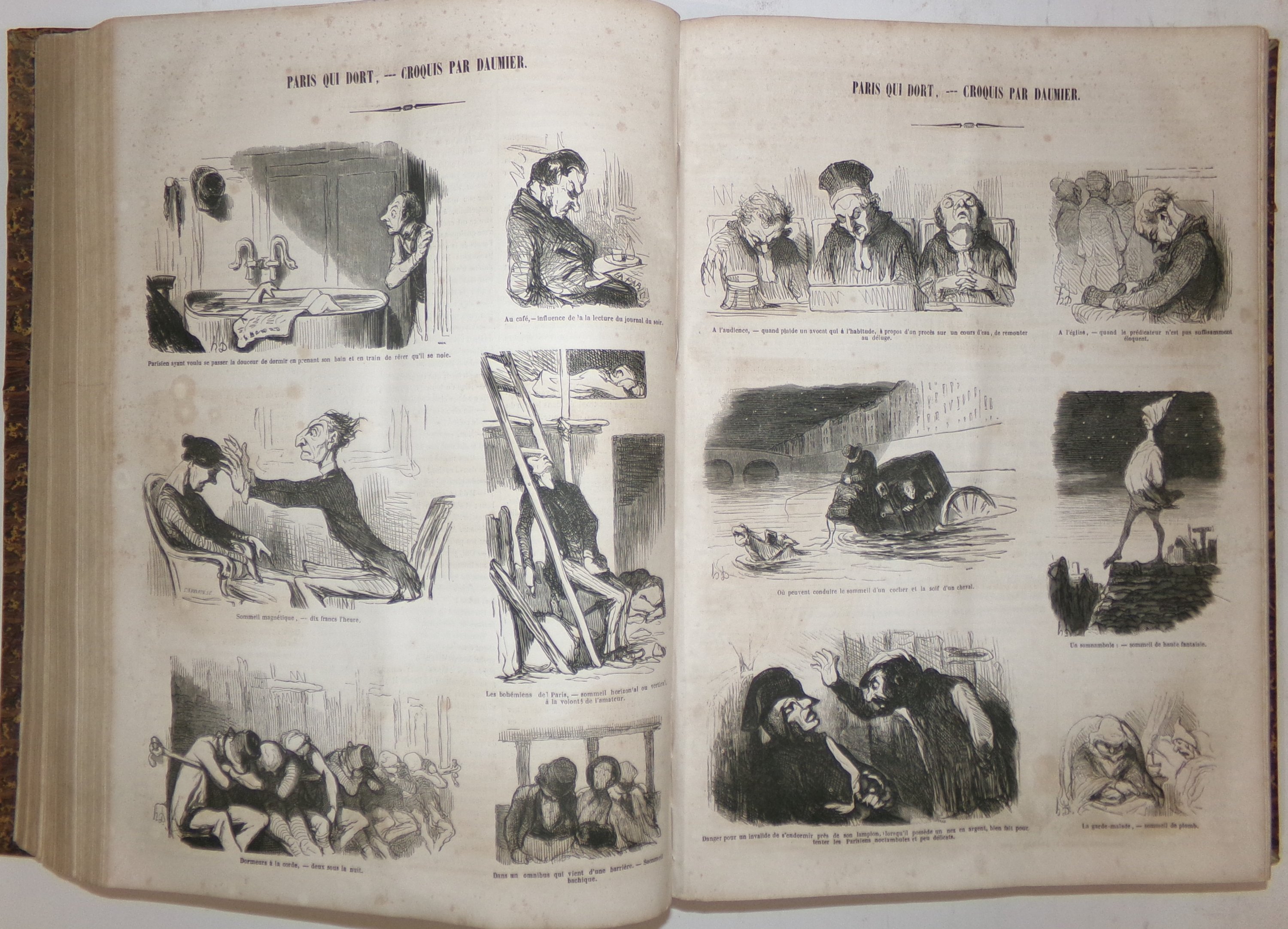 1 vol. rel. in-4 contenant du n°1 (1er janvier 1852) au 244 (31 août 1852) (manque 21, 38, 45) ; nombreuses illustrations de Cham, Vernier et principalement de Daumier sur les thèmes : Enfantillages (1), Les Parisiens en 1852 (11), Scènes parisiennes (3), Physionomies des chemins de fer (10), Croquis musicaux (16), Physionomies du palais de justice (1), Croquis variés (1), Le public du Salon (12), Paris l’été (1), Les bons Parisiens (1), Paris qui boit (6), Paris qui mange (1), Scène de la vie de province (3), Actualités (14), Croquis parisiens (2), Tout ce qu’on voudra (14), Les trains de plaisir (6) (rousseurs, qqs manques marginaux) T.B.E.
