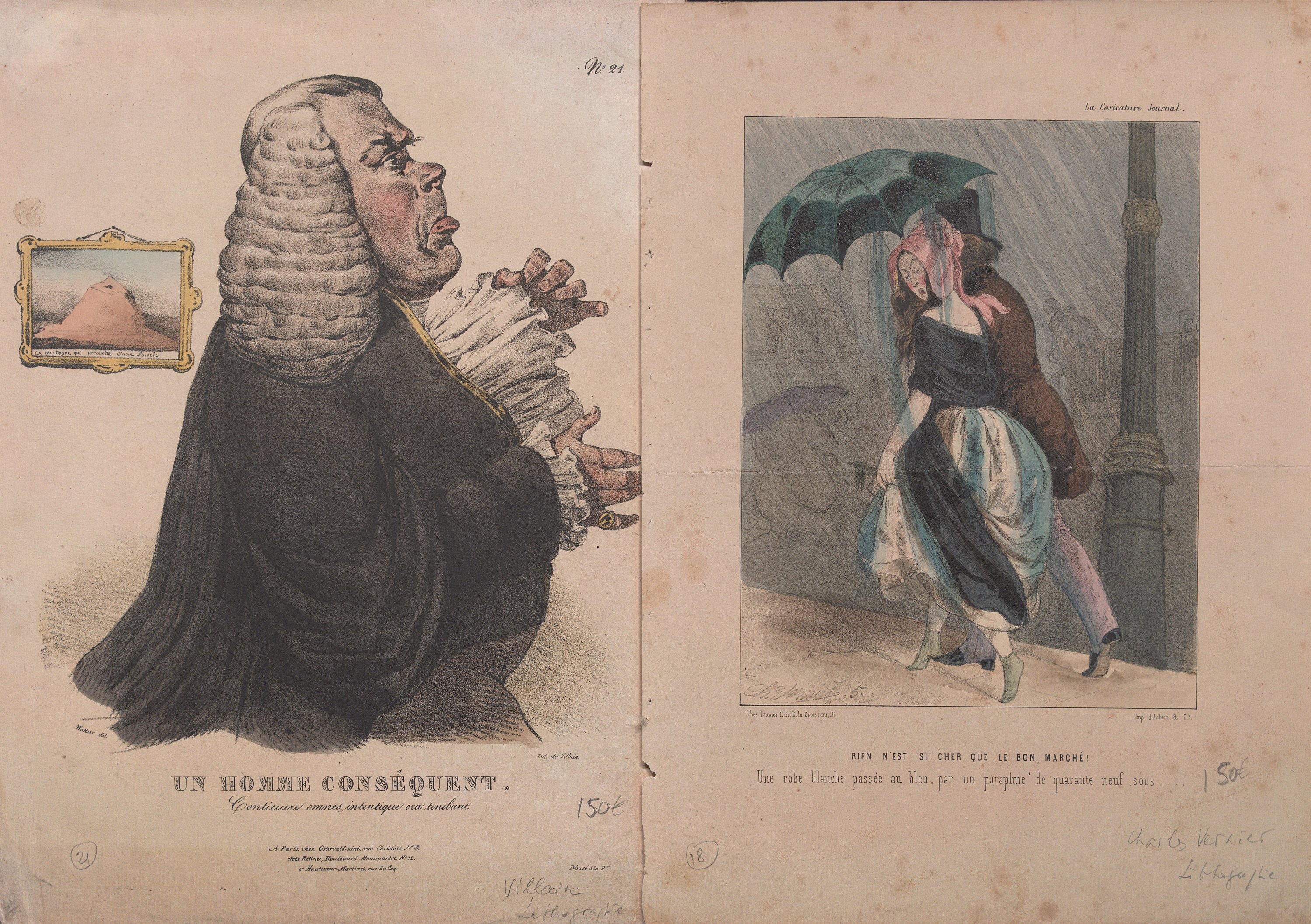 Joint : Grandville et Kaulbach, Album des bêtes à l'usage des gens d'esprit. Paris, Aux bureaux du Nain Jaune, 1864. 3 parties en 1 vol. broch. in-fol. (rousseurs, tâches) ; Rodolphe Töpffer, Histoire de Mr Jabot. Paris, chez Aubert, vers 1845. In-8 à l’italienne, 50 pp. ; Bertall, Album de caricatures. Paris, Au bureau du journal La Semaine, 1848. In-4 rel. à l’italienne, 23 pp. (rousseurs) ; Morin et Bertall, Petits albums pour rire n°29 - Voyage en Angleterre. Paris, Henri Plon, vers 1850. Broch. in-8 à l’italienne, 15 pp. (qqs rousseurs)