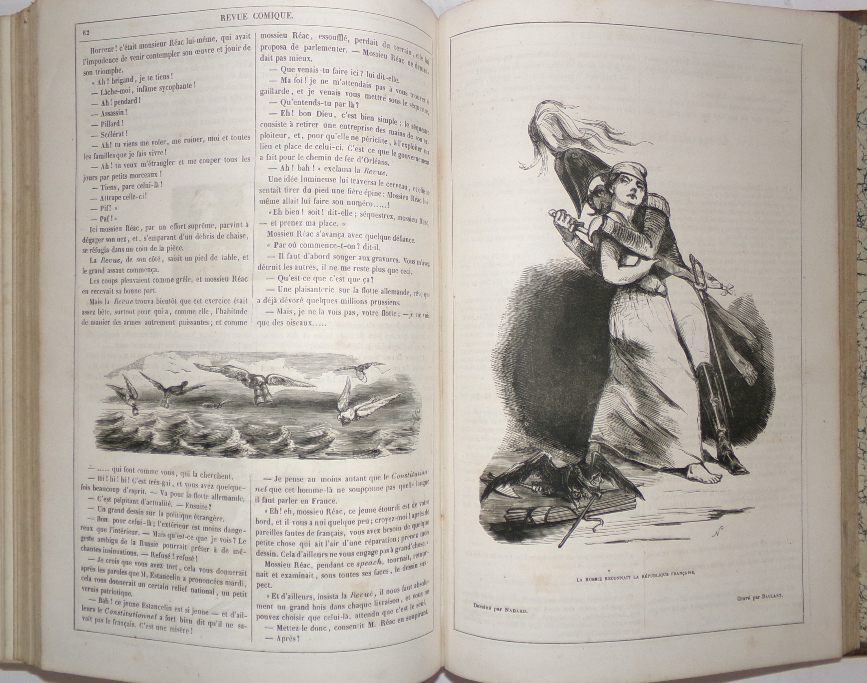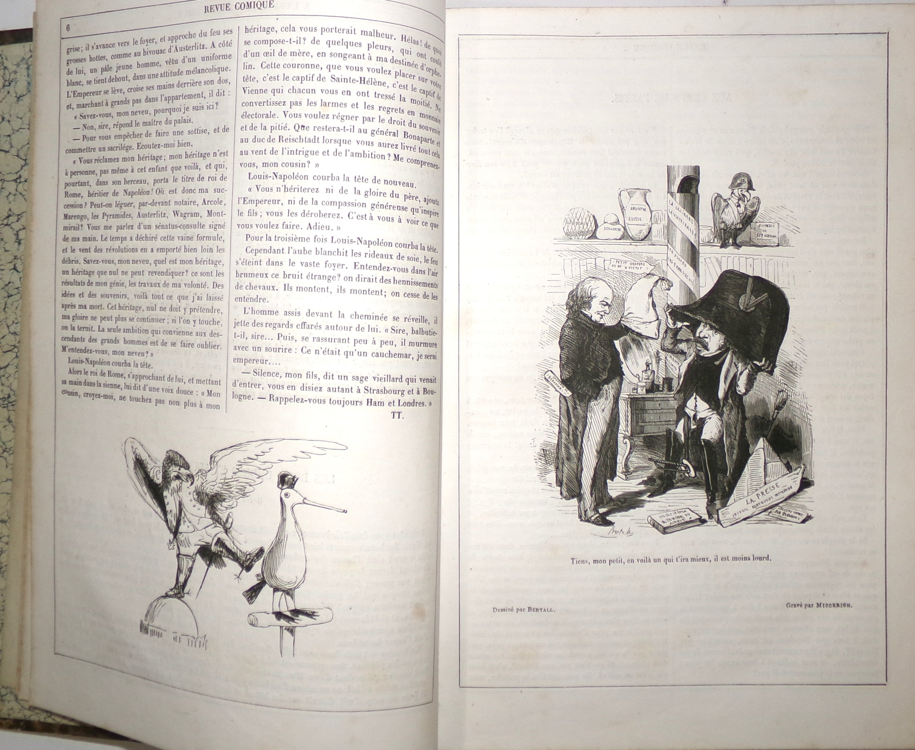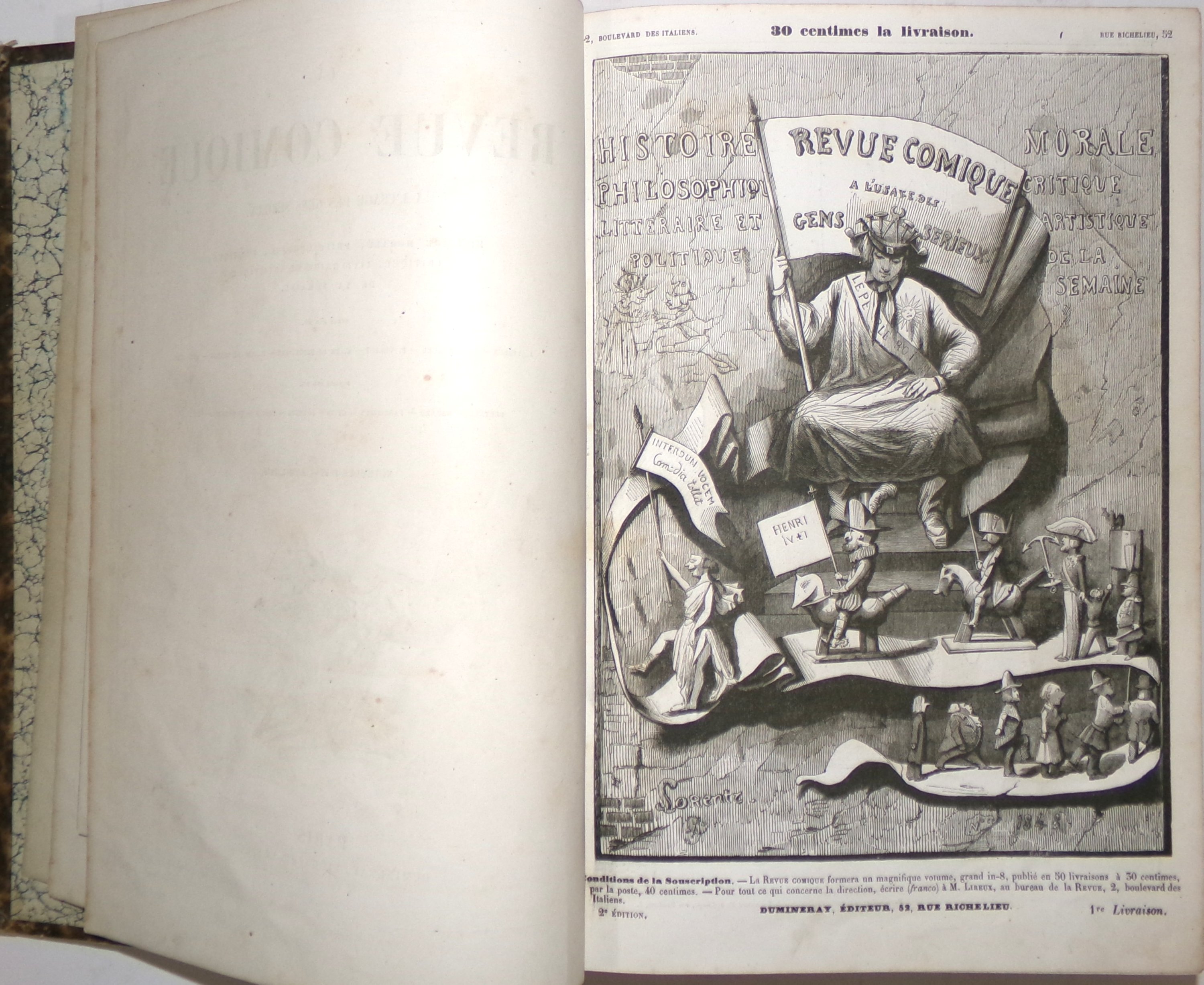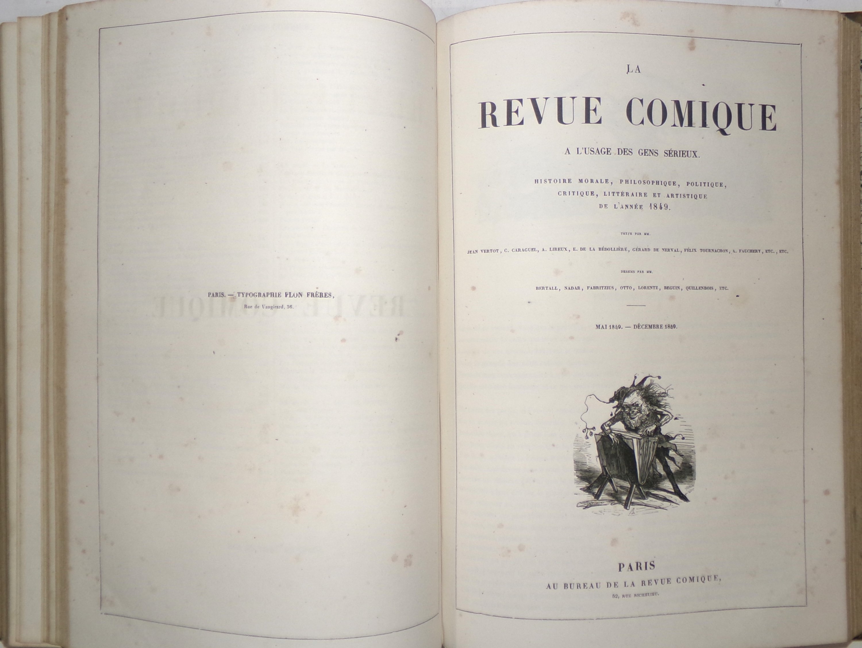 Novembre 1848 à avril 1849 ; mai 1849 à décembre 1849. 2 tomes en 1 vol. in-4 rel. Paris, Dumineray et au bureau de la Revue Comique. Page illustrée de la 1ère livraison, 368 et 188 pp.