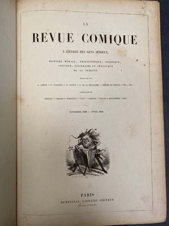 La revue comique à l’usage des gens sérieux, Histoire morale, philosophique, politique, critique, littéraire et artistique de la semaine. Novembre 1848 à avril 1849. 1er tome in-4 rel. Paris, Dumineray et au bureau de la Revue Comique. Page illustrée de la 1ère livraison, 368 pp. Dessins in-texte et h.-t. de Nadar, Achille Béguin, Bertall, Alcide-Joseph Lorentz, Nadar, Otto, Quillenbois, etc. Jules Hetzel créa cette revue pour soutenir la candidature du général Cavaignac contre Louis Napoléon. Elle prit fin sous les coups de la censure. B.E. (couv. en l’état., rousseurs éparses)