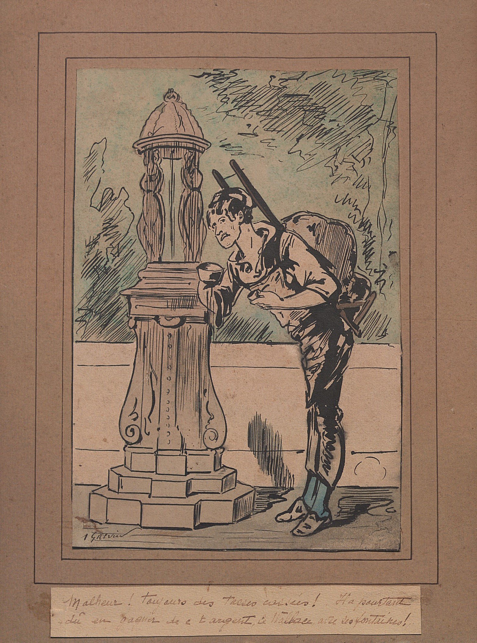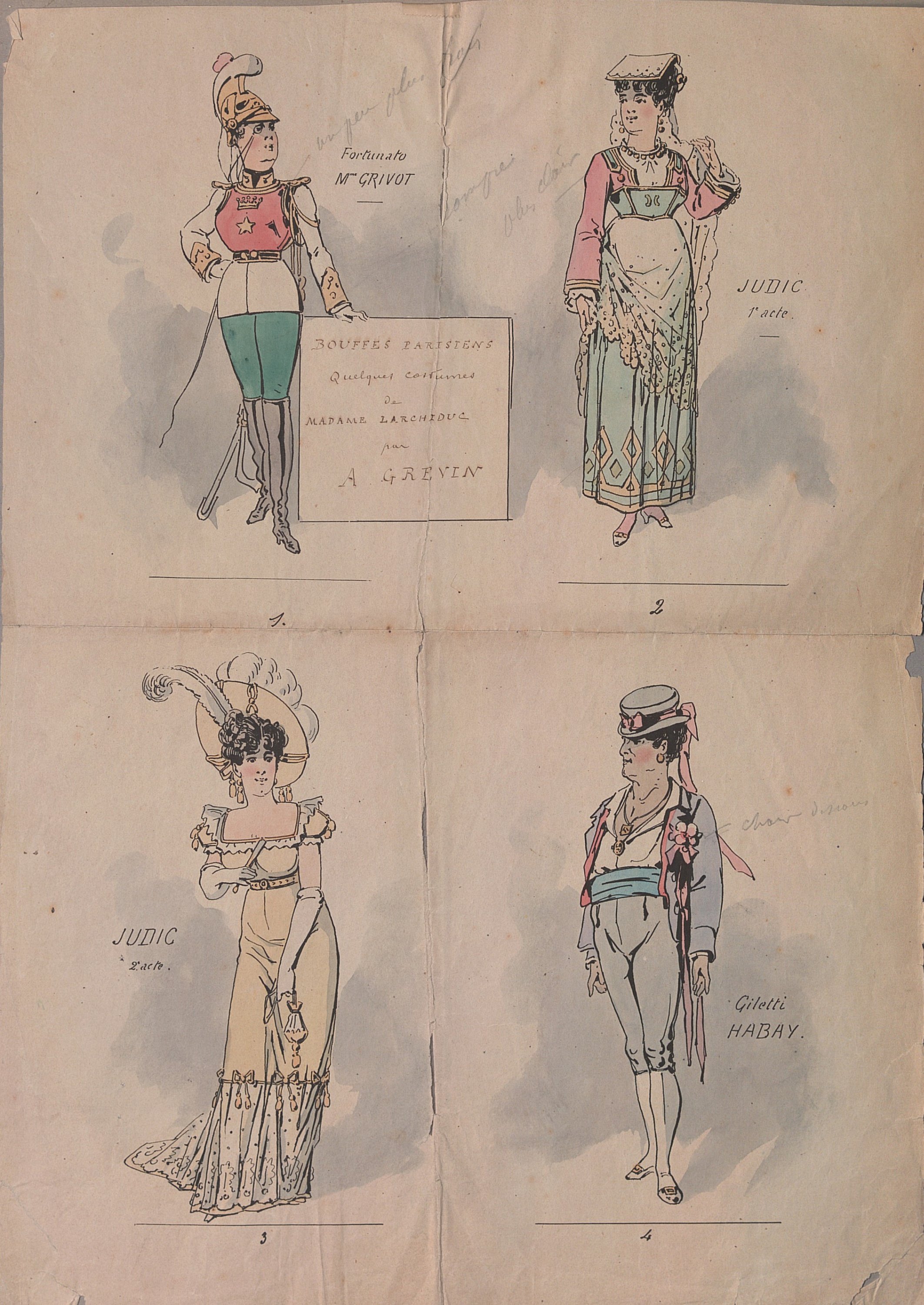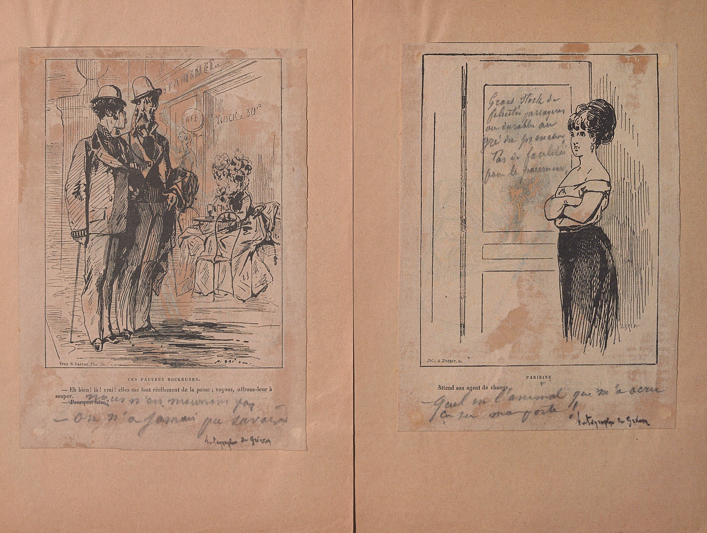 3 dessins à l’encre attribués à Alfred Grévin, légendés, 35 x 22,5 cm ;