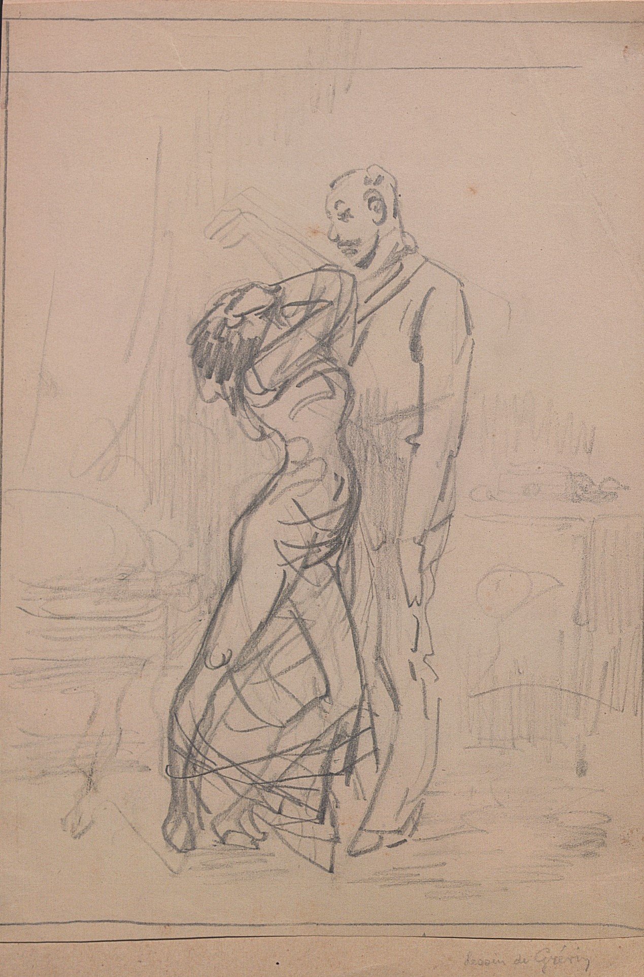 2 croquis au crayon attribués à Alfred Grévin, 19 x 14 cm et 25 x 18 cm ;