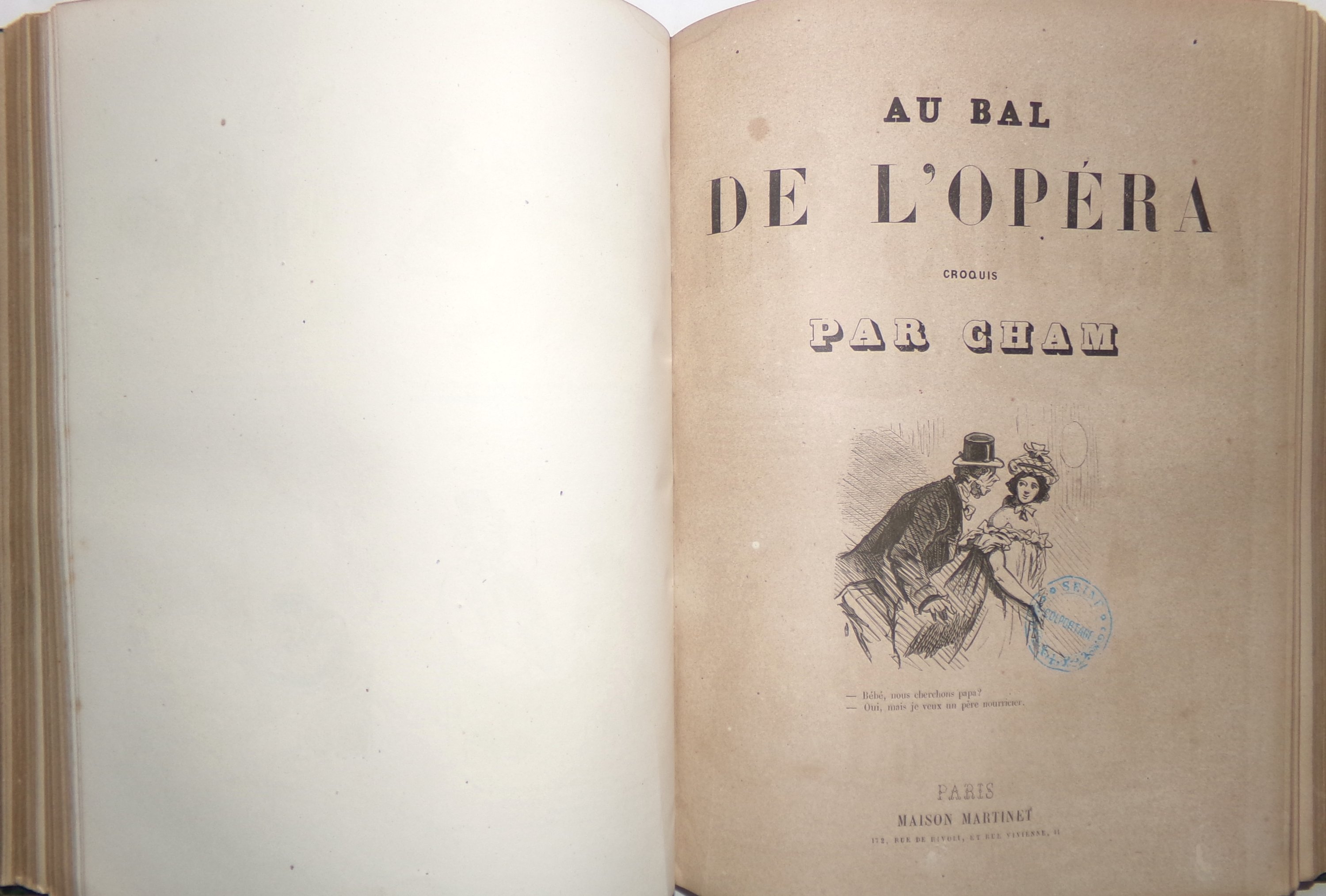 Recueil factice de 15 fascicules imprimés de caricatures en majorité croqués par Cham (14 fasc.) et par Baric (1 fasc.) en 1 vol. rel. ½ basane in-8 : Le code civil commenté par Cham, ouvrage destiné aux personnes qui désirent avoir des démêlés avec la justice (3 parties) ; L’exposition de Londres (2 parties) ; Choses et autres ; Cours de physique ; Au bal de l’Opéra ; La bourse illustrée ; Les jours gras ; Baigneurs et buveurs d’eau ; Pendant la canicule ; Spahis et turcos ; Promenades au jardin d’acclimatation ; Voilà ce qui vient de paraître, revue comique de l’année par Baric. Tampon bleu de colportage de la Seine sur chaque couv., publiés à Paris par la maison Martinet et Arnauld de Vresse, vers 1861-1863 ;