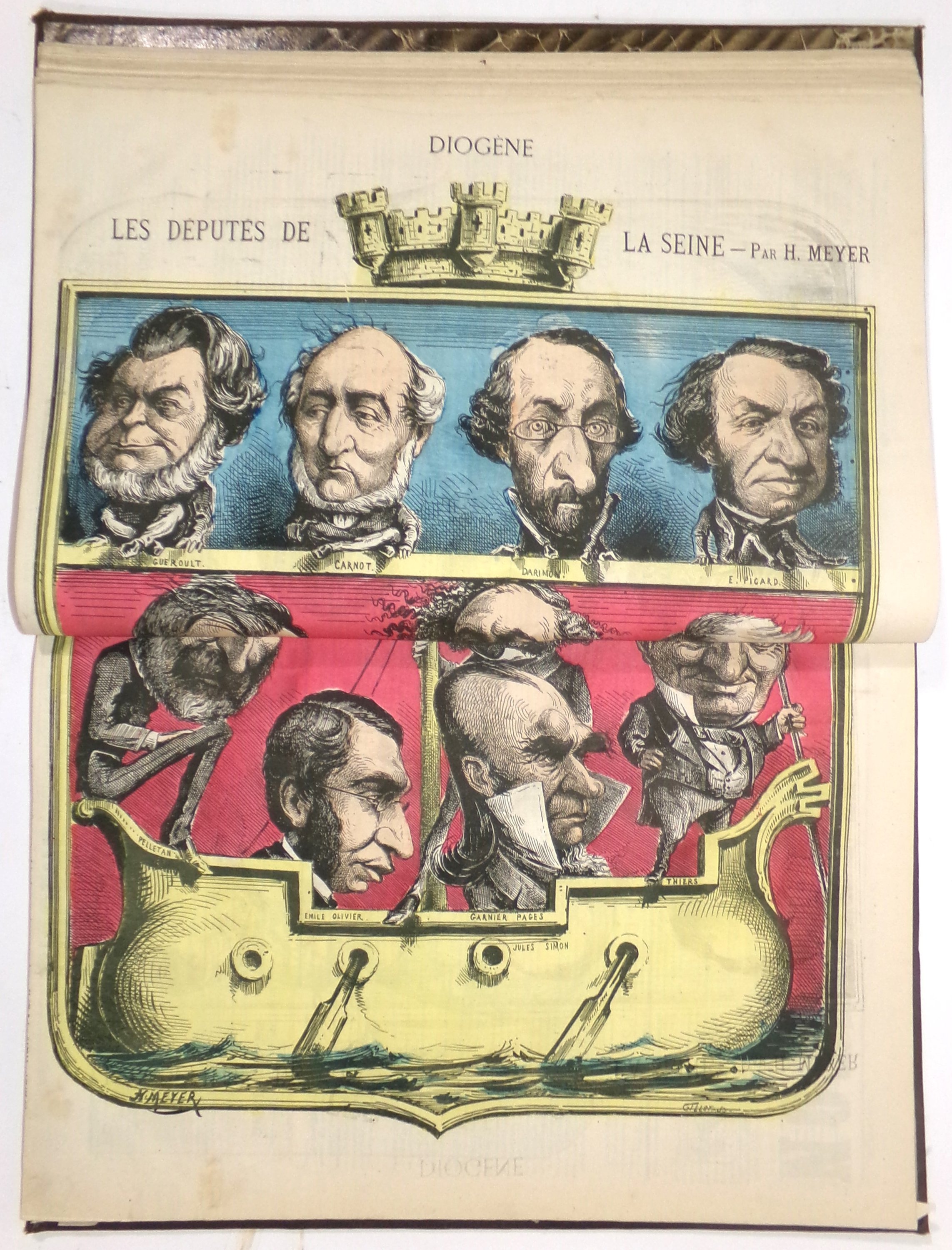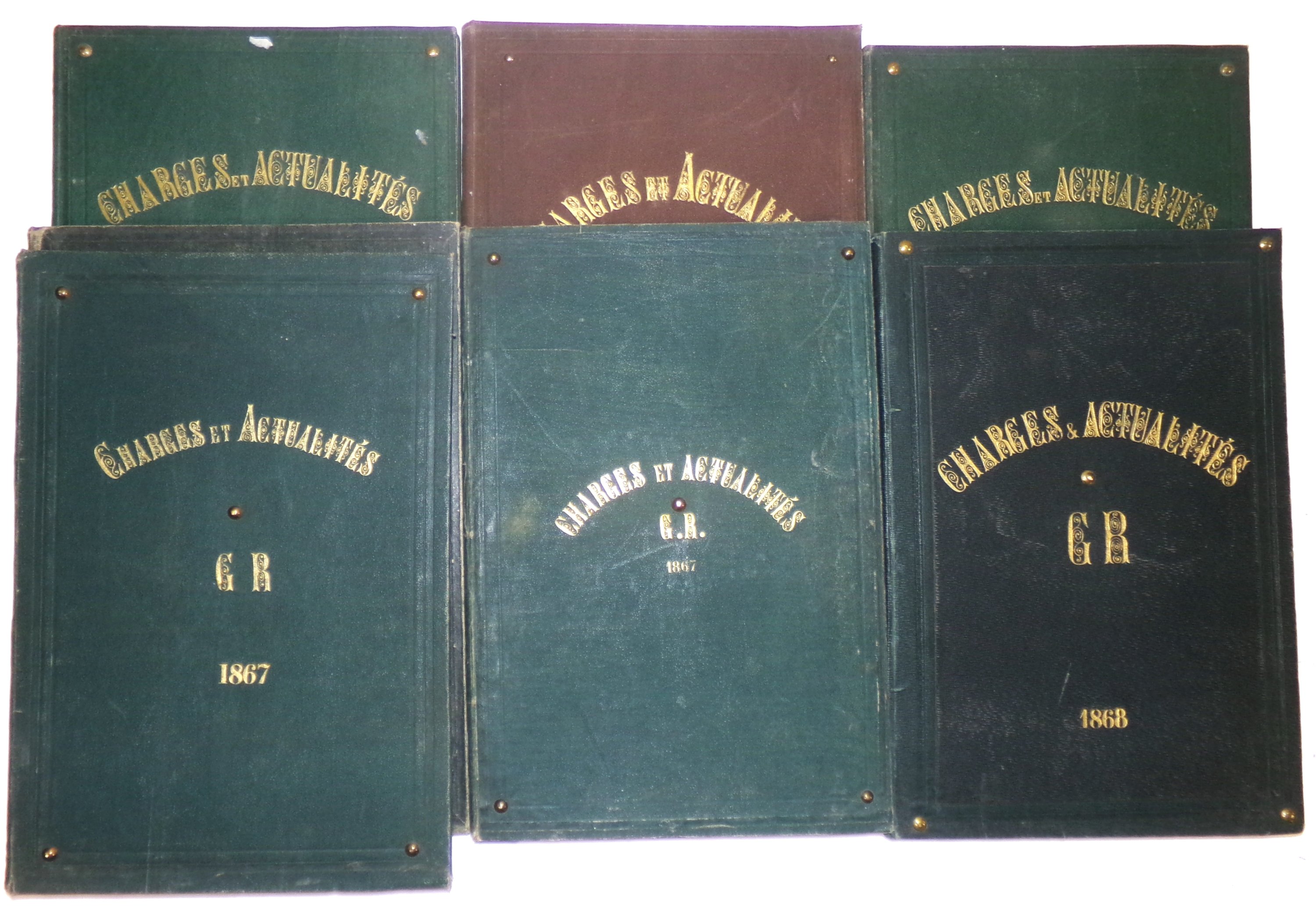 Rare et belle réunion de journaux satiriques illustrés parisiens et provinciaux, en 7 vol. rel. in-fol. plein percaline, 1865-1868, ayant pour titre en lettres dorées « Charges et actualités - G.R. »