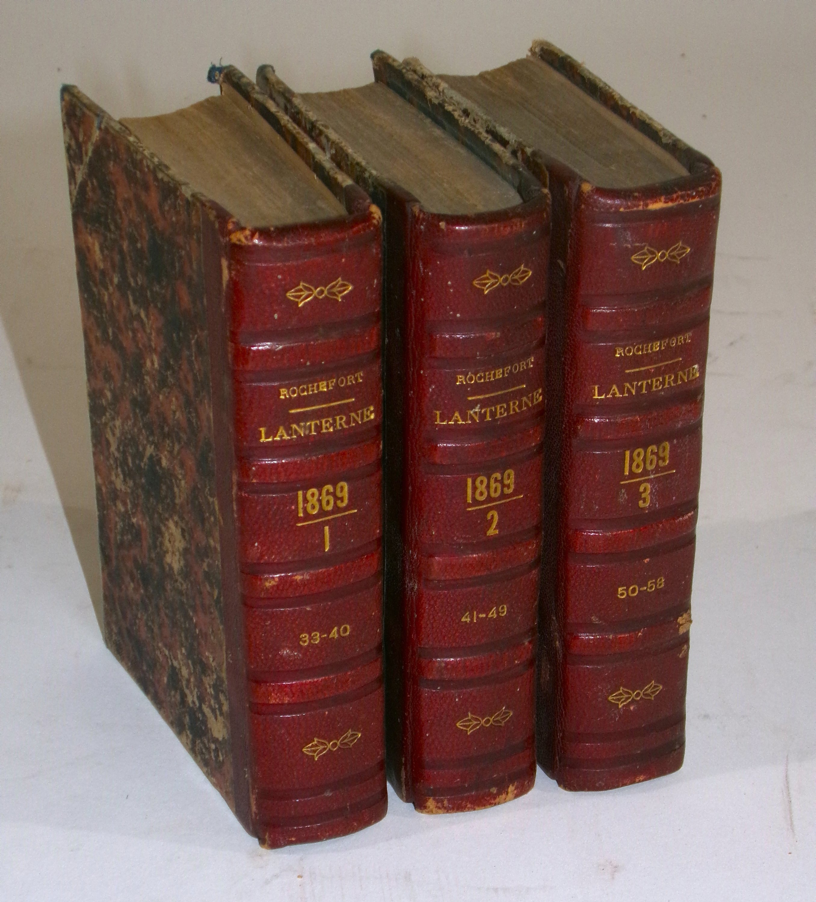 Joint : 24 numéros dépareillés en double ; 3 vol. rel. ½ chagrin in-12 La Lanterne d’Henri Rochefort, 1869 (n°33 au n°49) ; 10 numéros « Les Guêpes », broch. in-12, 1840-1841, revue satirique fondée et écrite par le romancier et journaliste Alphonse Karr.