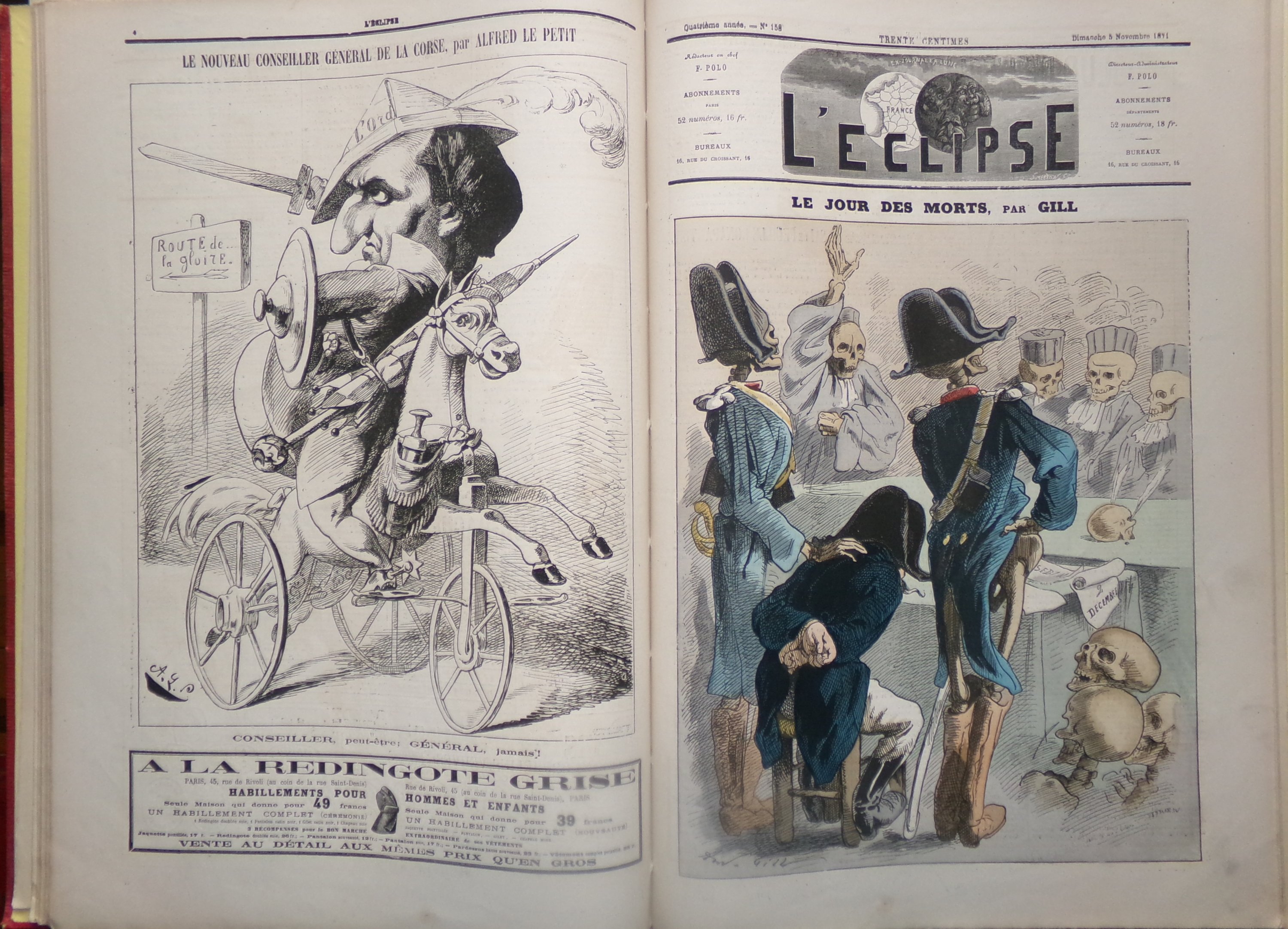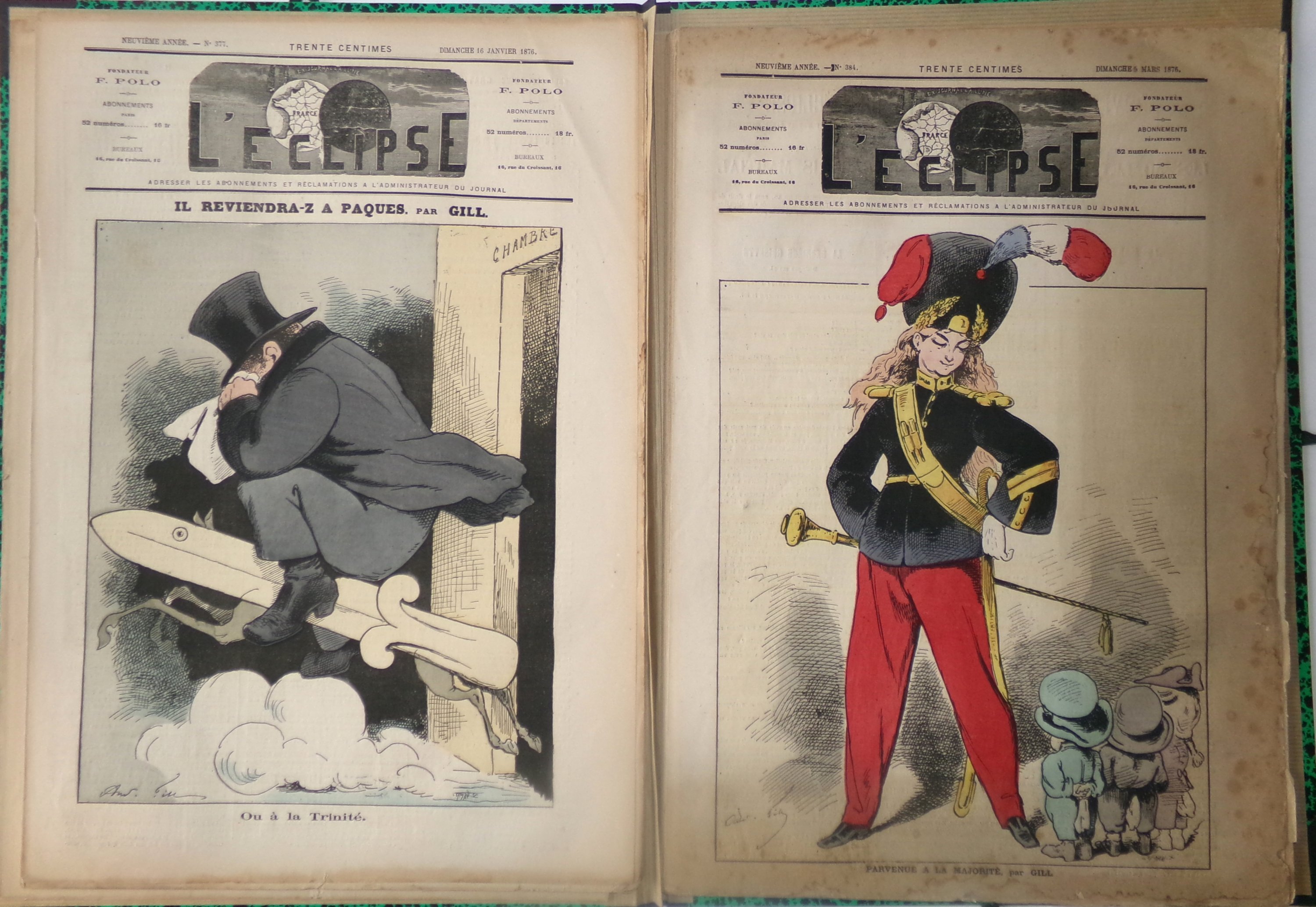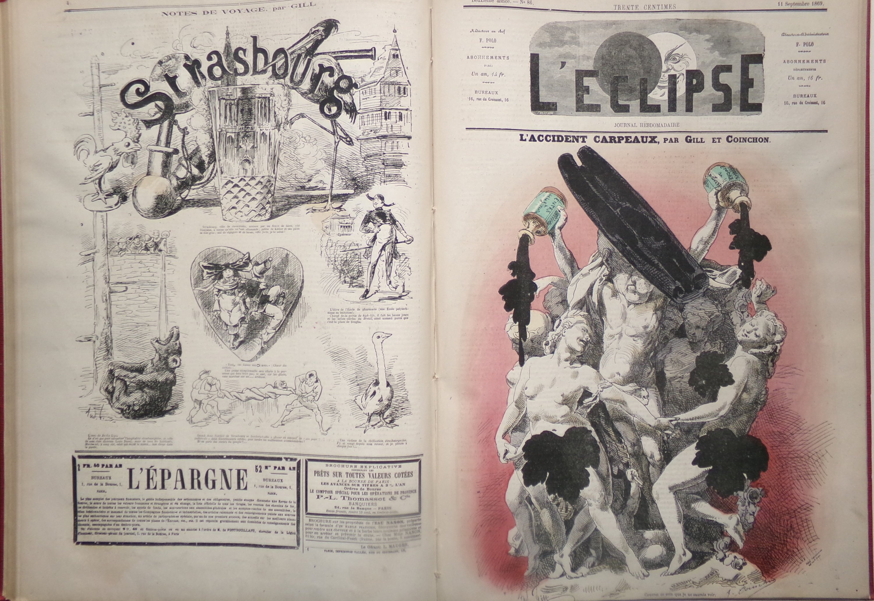 (1 vol.) n°102 (2 janvier 1870) au n° 139 (18 septembre 1870) suivi des suppl. n°1 à 5 (du 18 sept. 1870 à juin 1871, l’Eclipse ne parut pas, mais elle publia durant ces neuf mois d’interruption, 5 feuilles supplémentaires) y compris suppl. du n°119, n°103bis, 105bis, 106bis, 114bis, 116bis, 128bis, 129bis, 132bis, 133bis, 134bis, complet ;