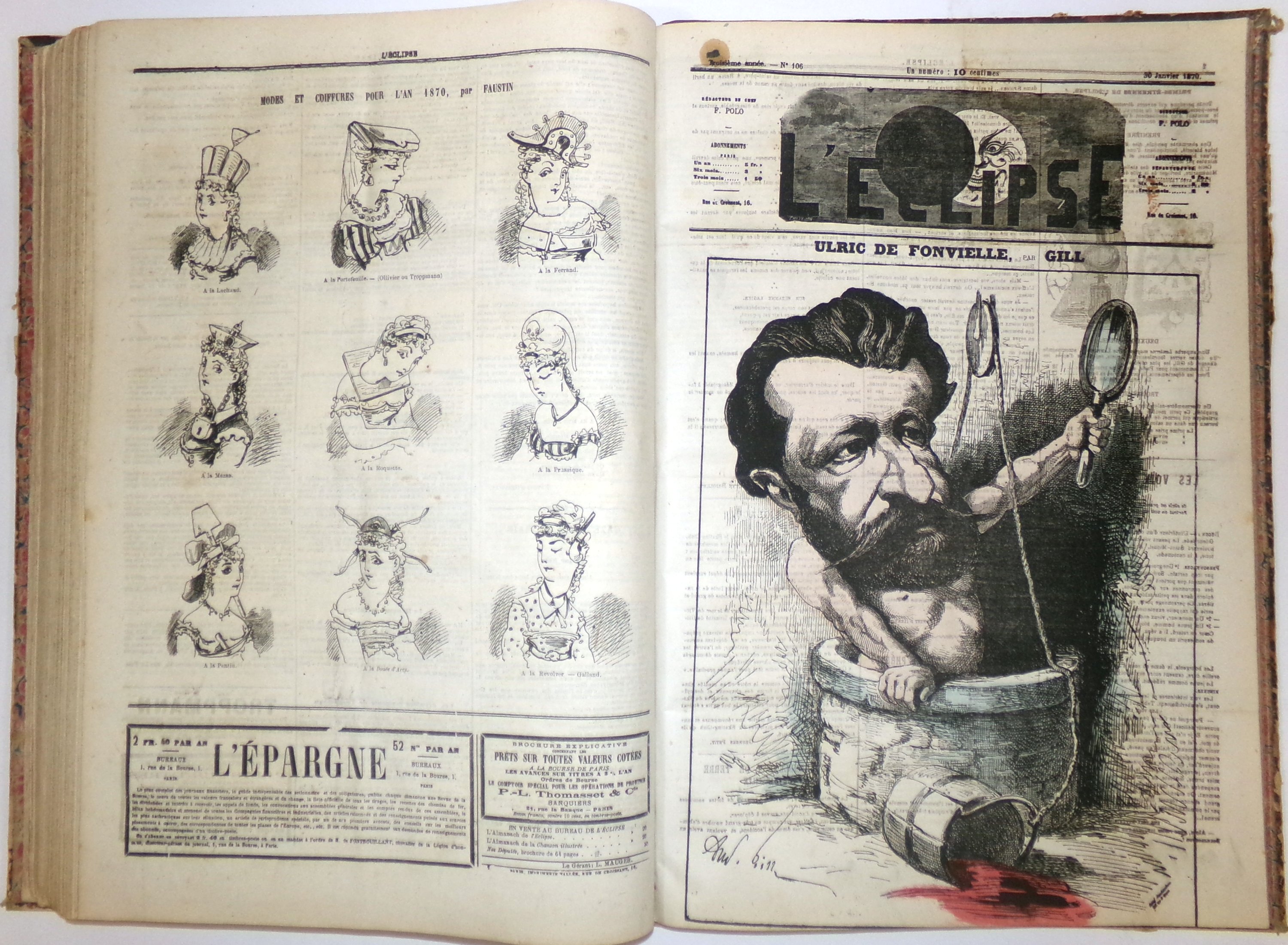 L’Eclipse : n°1 (26 janvier 1868) au n°49 (27 décembre 1868), n°50 (3 janvier 1869) au n°101 (26 décembre 1869), n°102 (2 janvier 1870) au n°134 (11 août 1870) y compris les n°53bis, 87bis, 98bis, 99bis, 105bis et 114 bis (mque 73, 87 et 100).