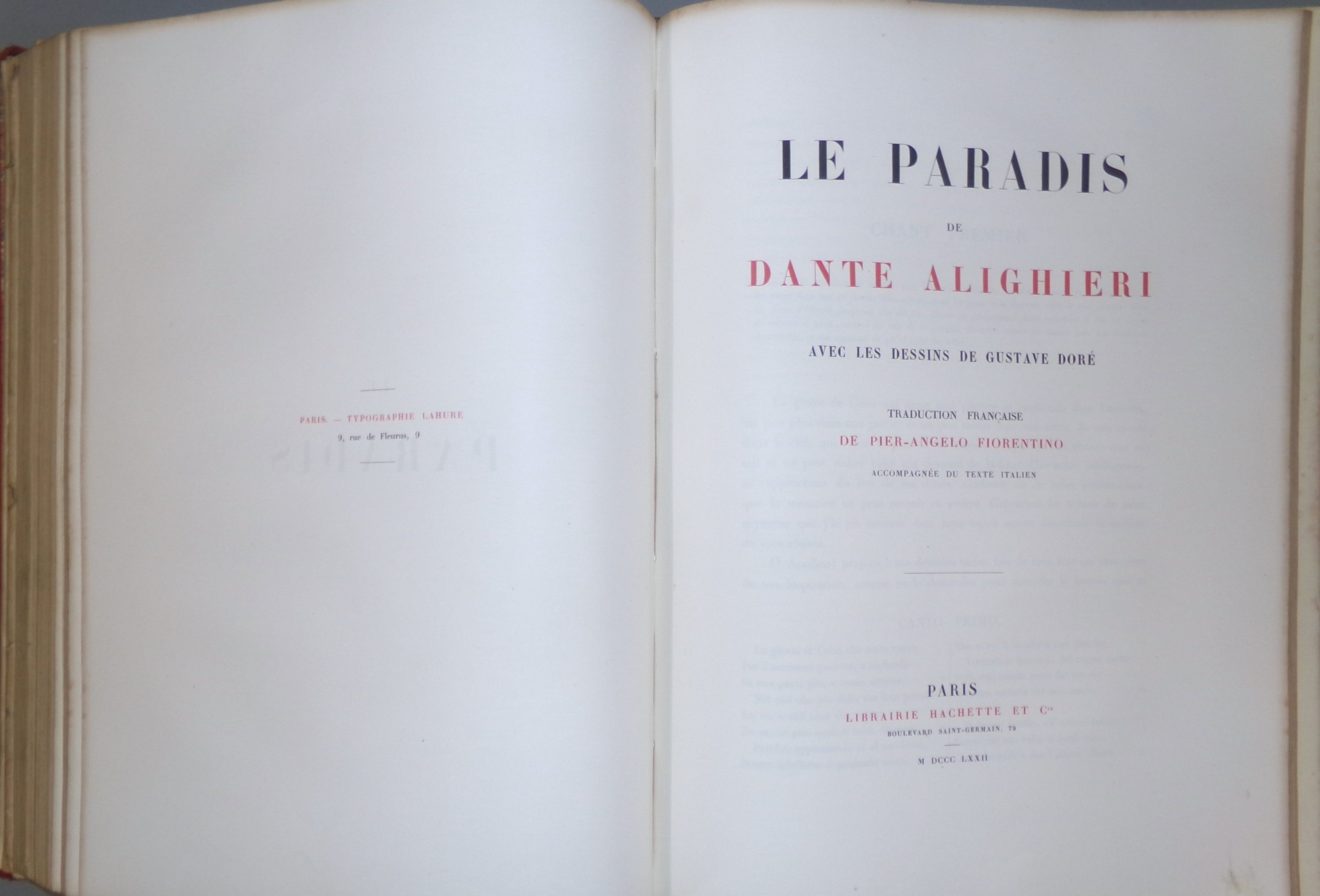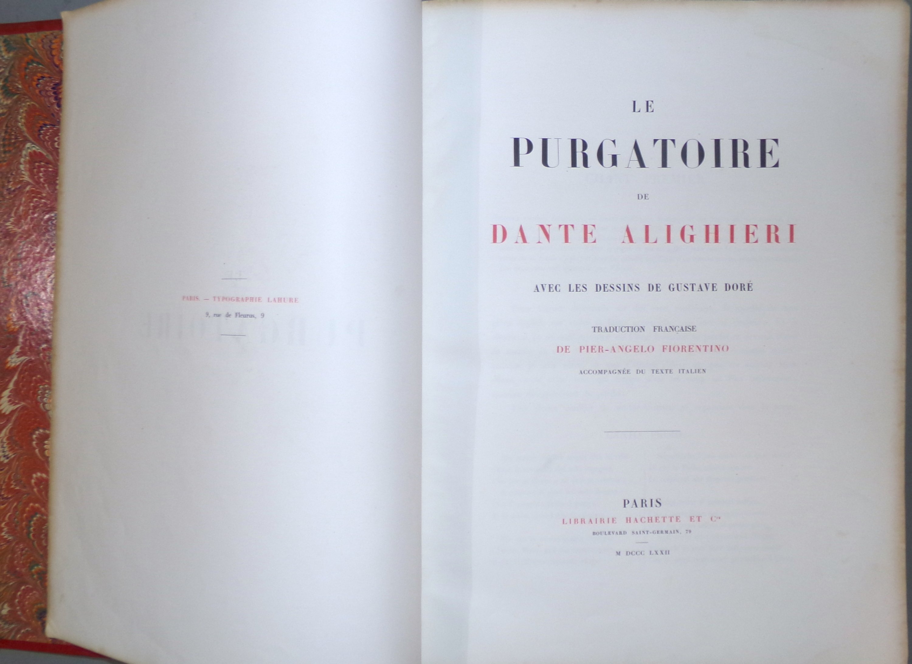 Dante. L'Enfer et Le Purgatoire, Le Paradis. Avec les dessins de Gustave Doré. Traduction française de Pier-Angelo Fiorentino accompagnée du texte italien. 2 vol. in-fol. percaline rouge couv. éditeur. Paris, Hachette, 1872. Edition illustrée de la Divine Comédie. Contient un portrait et 135 planches hors-texte gravées sur bois de Gustave Doré (mque pl. 2 L’Enfer, pl. 14 Le Purgatoire)