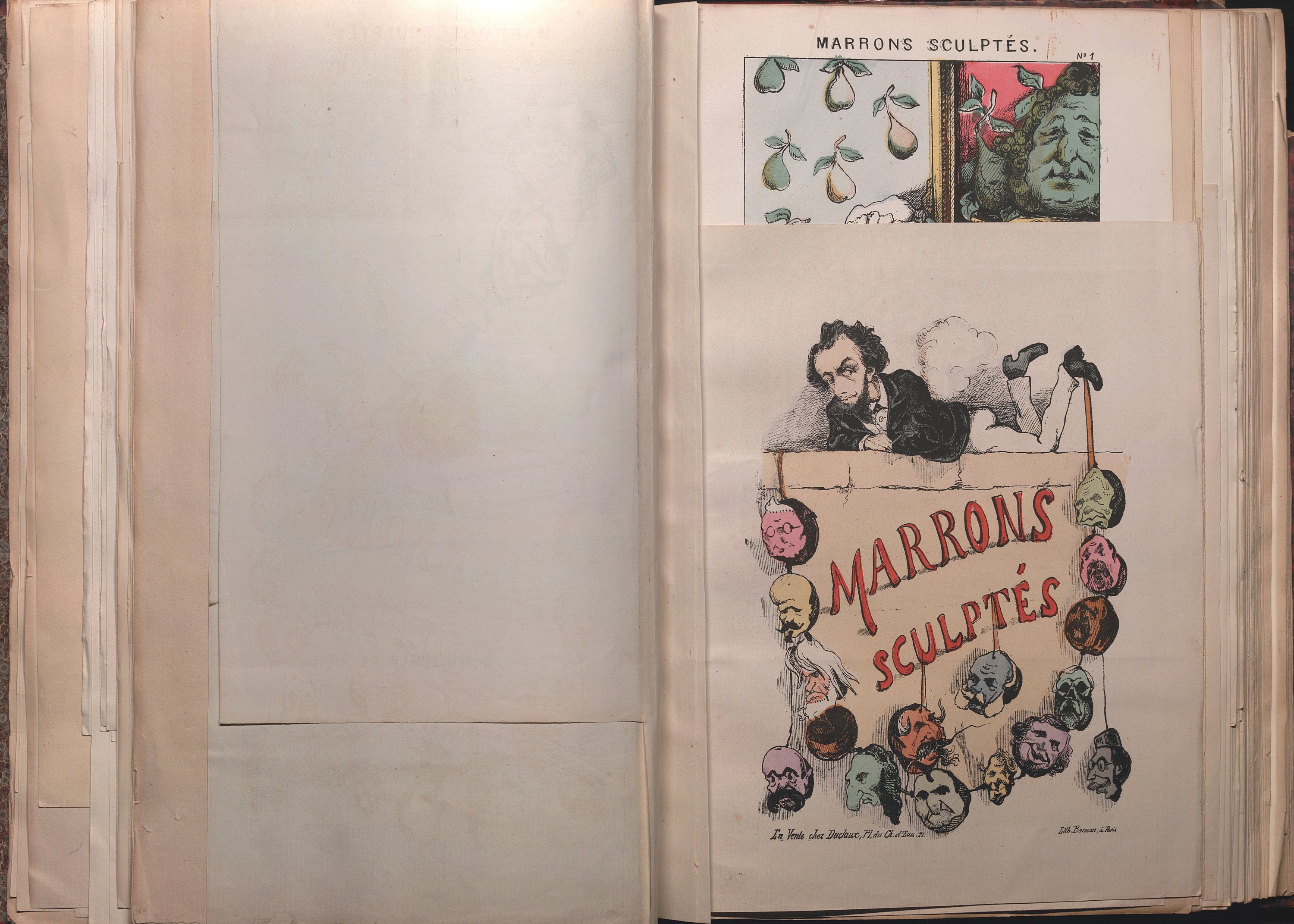 Charles de Frondat (1846-1903), dit Frondas : série Marrons sculptés, page de titre et n°1 au n°24 (mque 9, 25-27) ; série Paris Garde national, souvenir des 2 sièges, n°1 au n°8 (sur 10 pl.) ;
