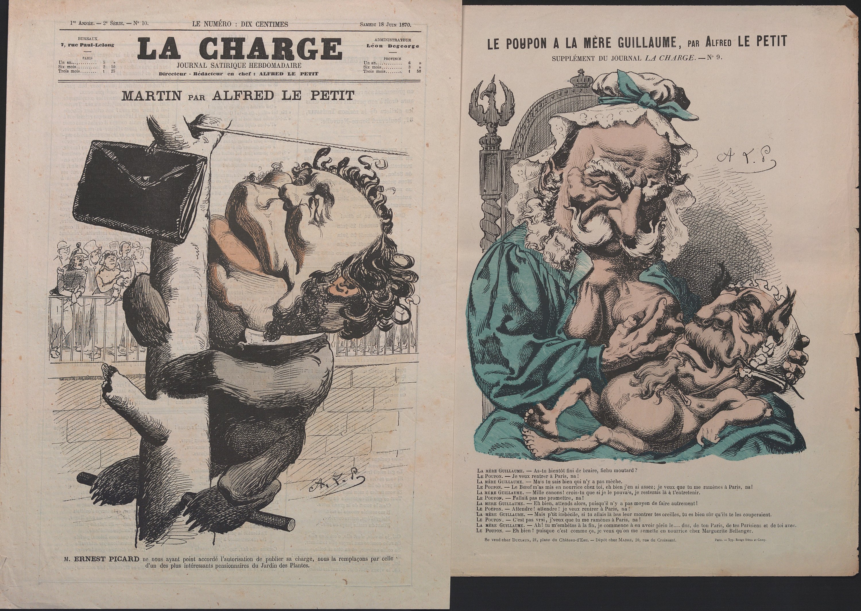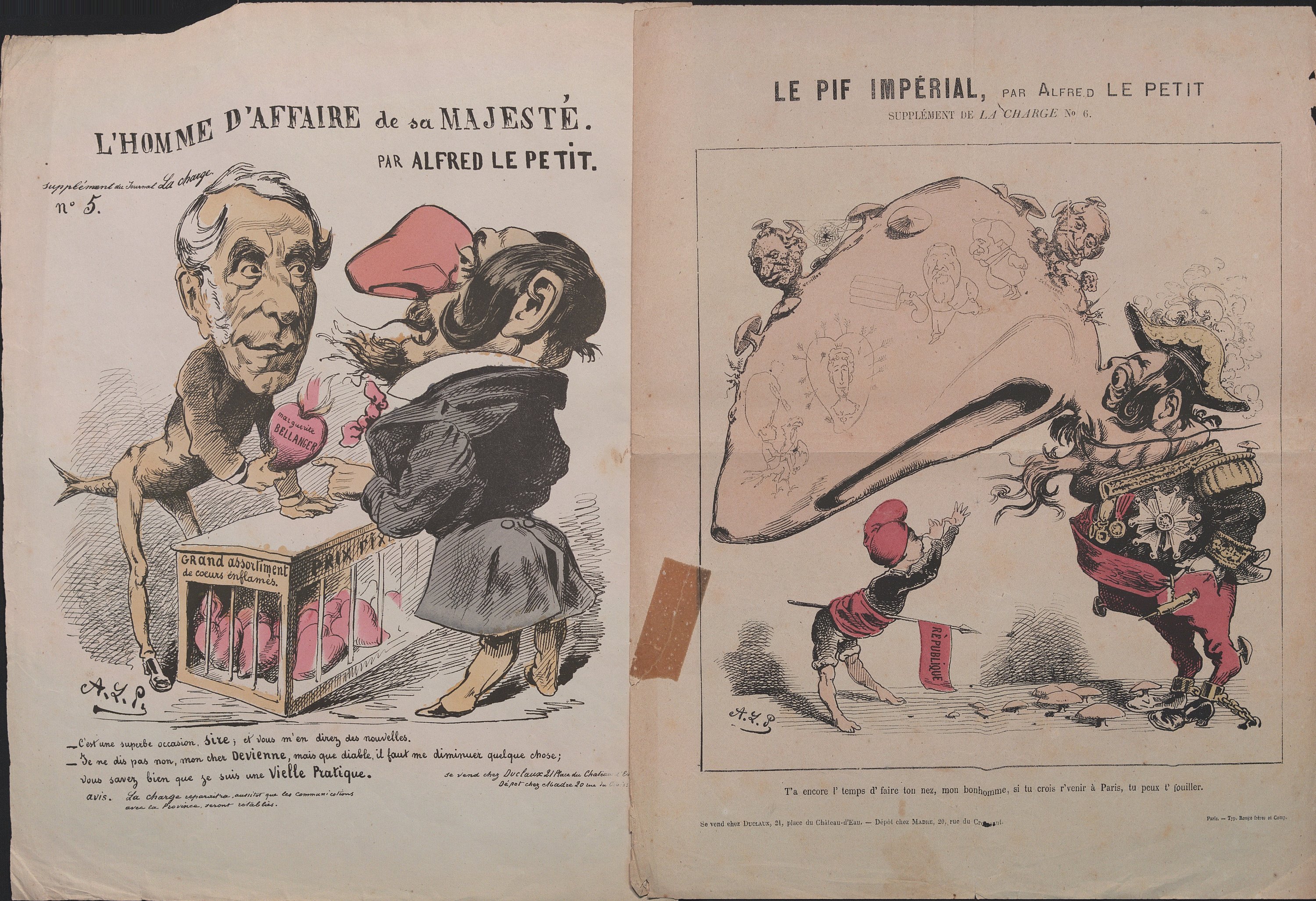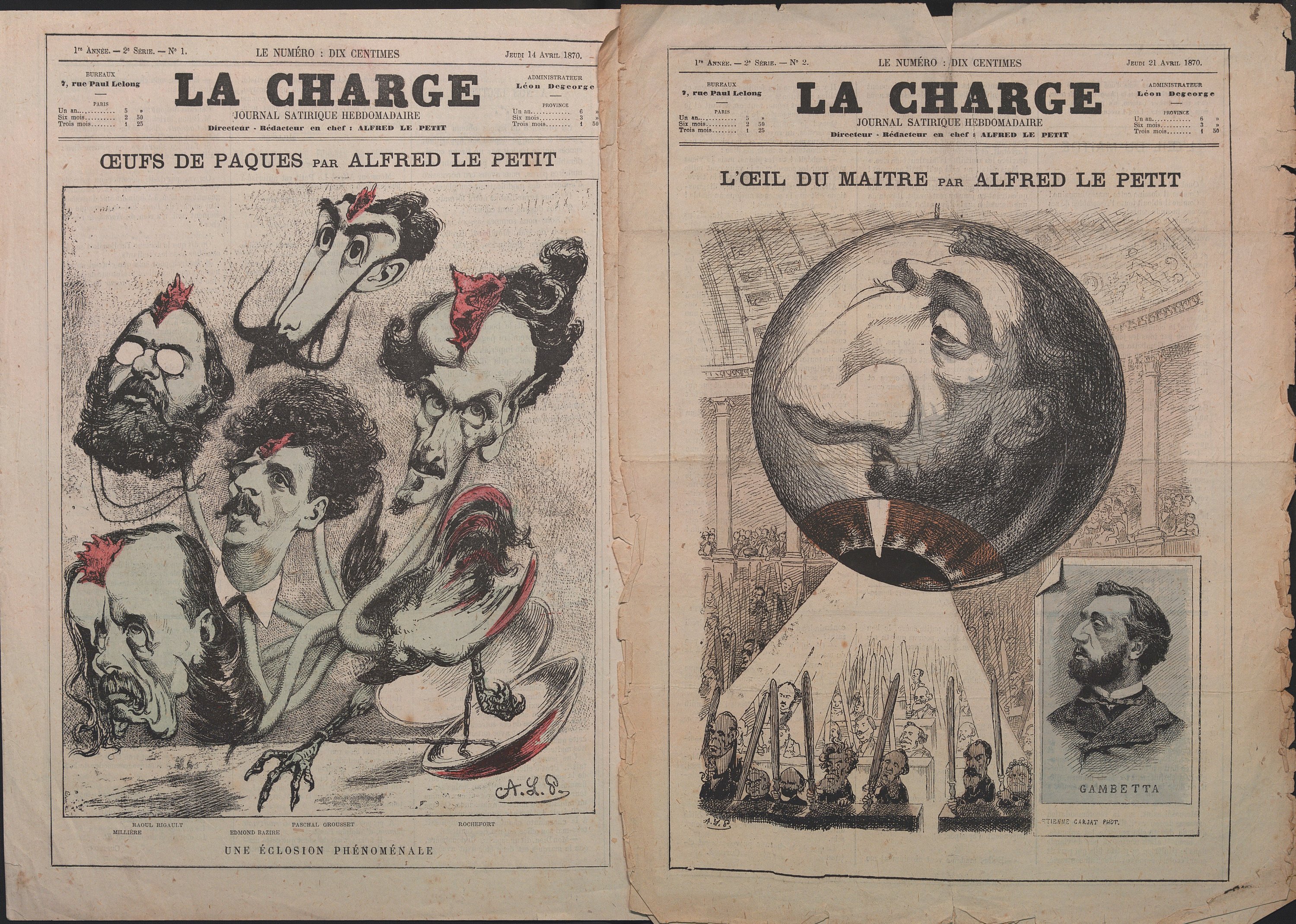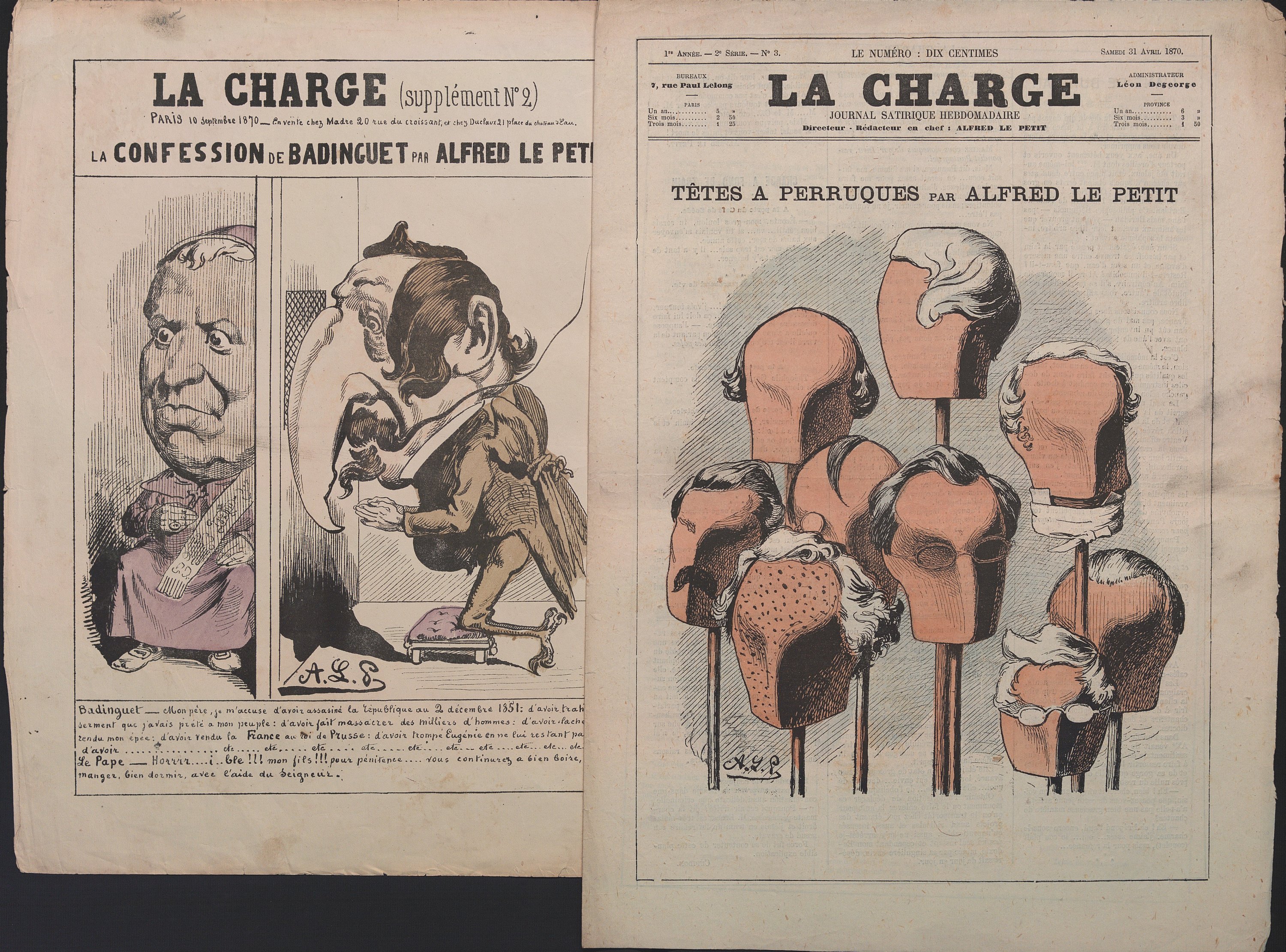 Rare réunion de ce journal satirique fondé par Alfred Le Petit, ayant quitté l’Eclipse pour cause de mésentente. Il publie deux séries : la 1ère parait le 13 janvier 1870 sur papier de différentes couleurs ; la seconde débute le 14 avril 1870 et se termine au n°24. L'esprit de ce journal est anti-bonapartiste et anti-prussien, plusieurs fois poursuivi et condamné pour la publication de dessins interdits.