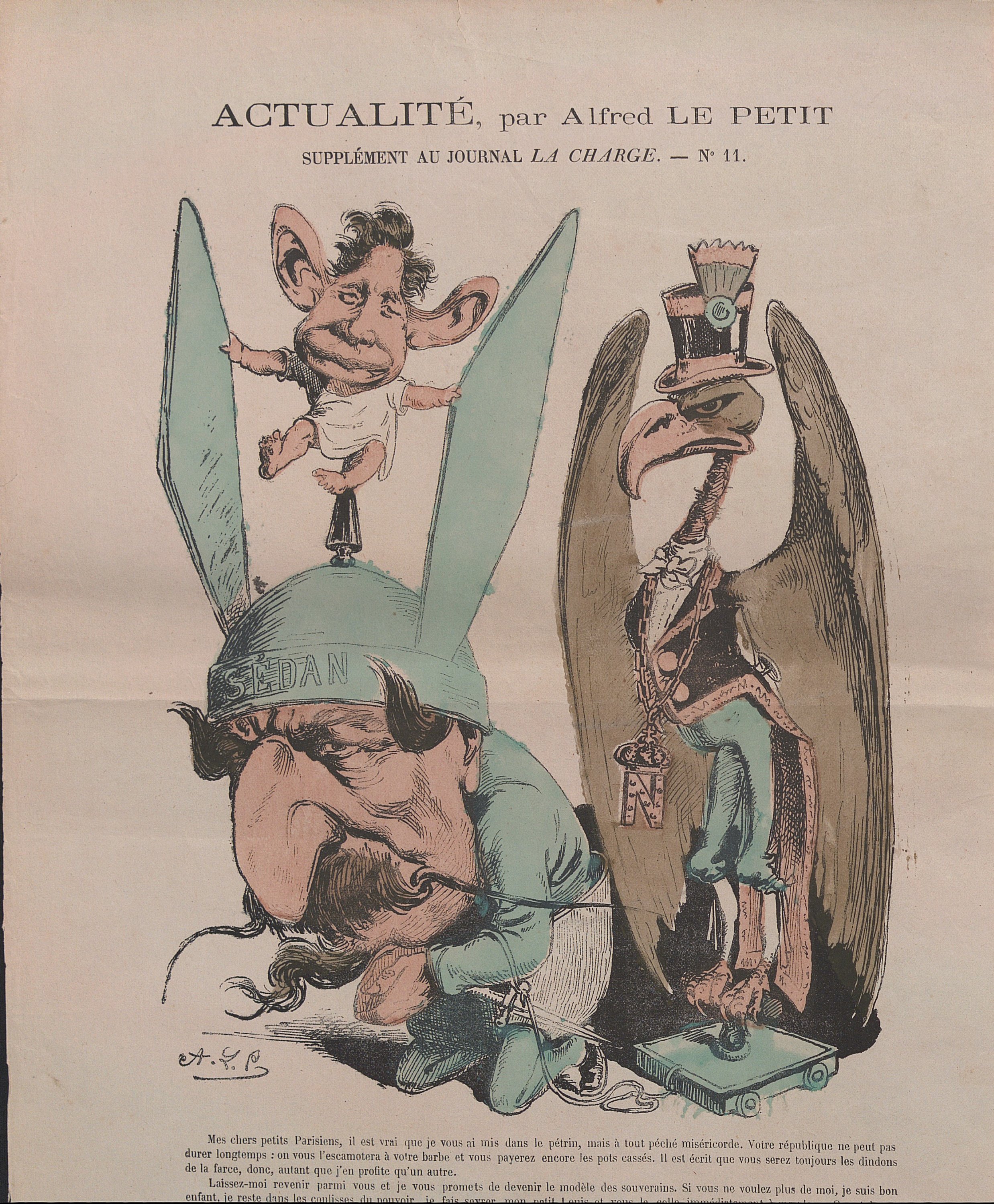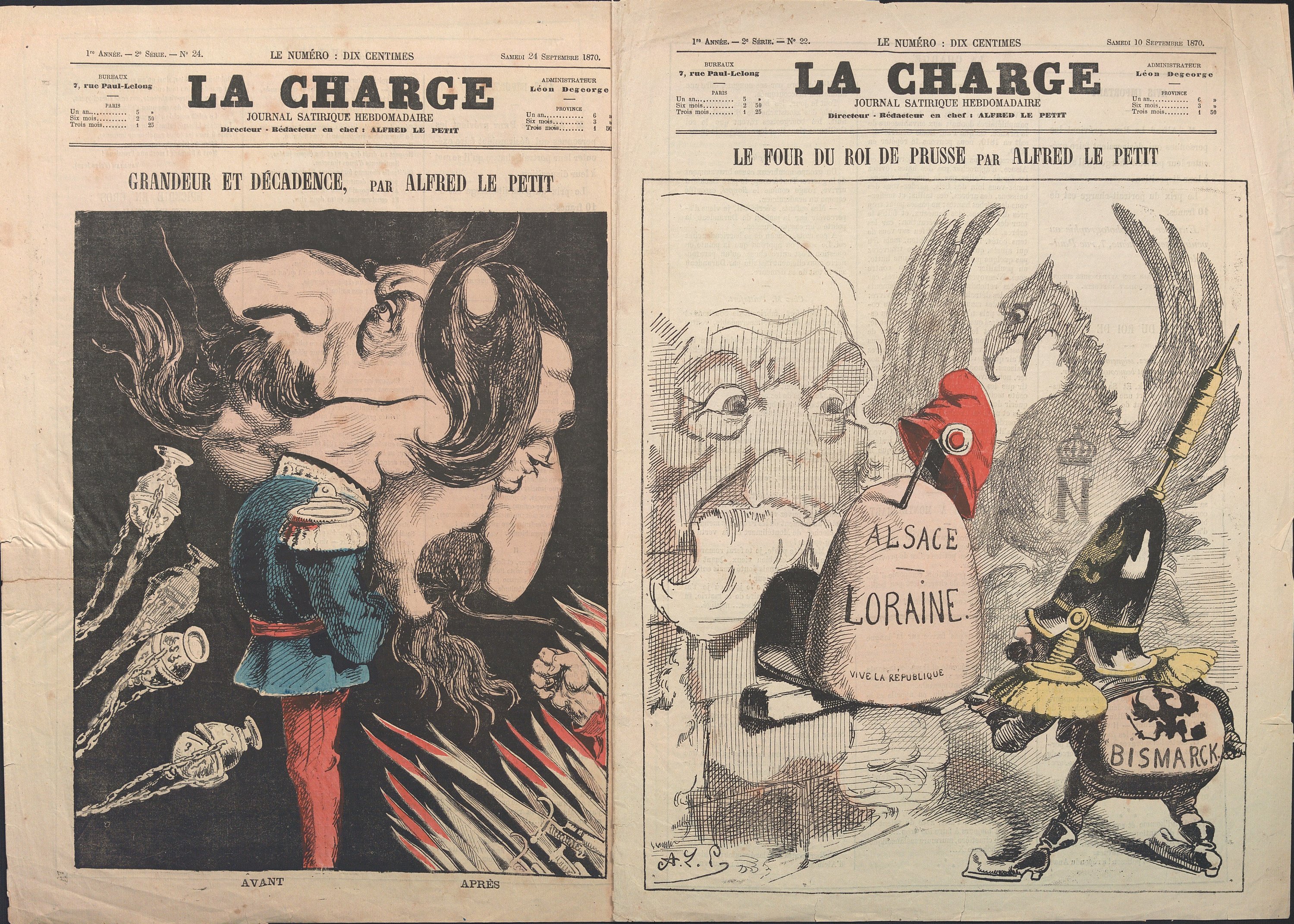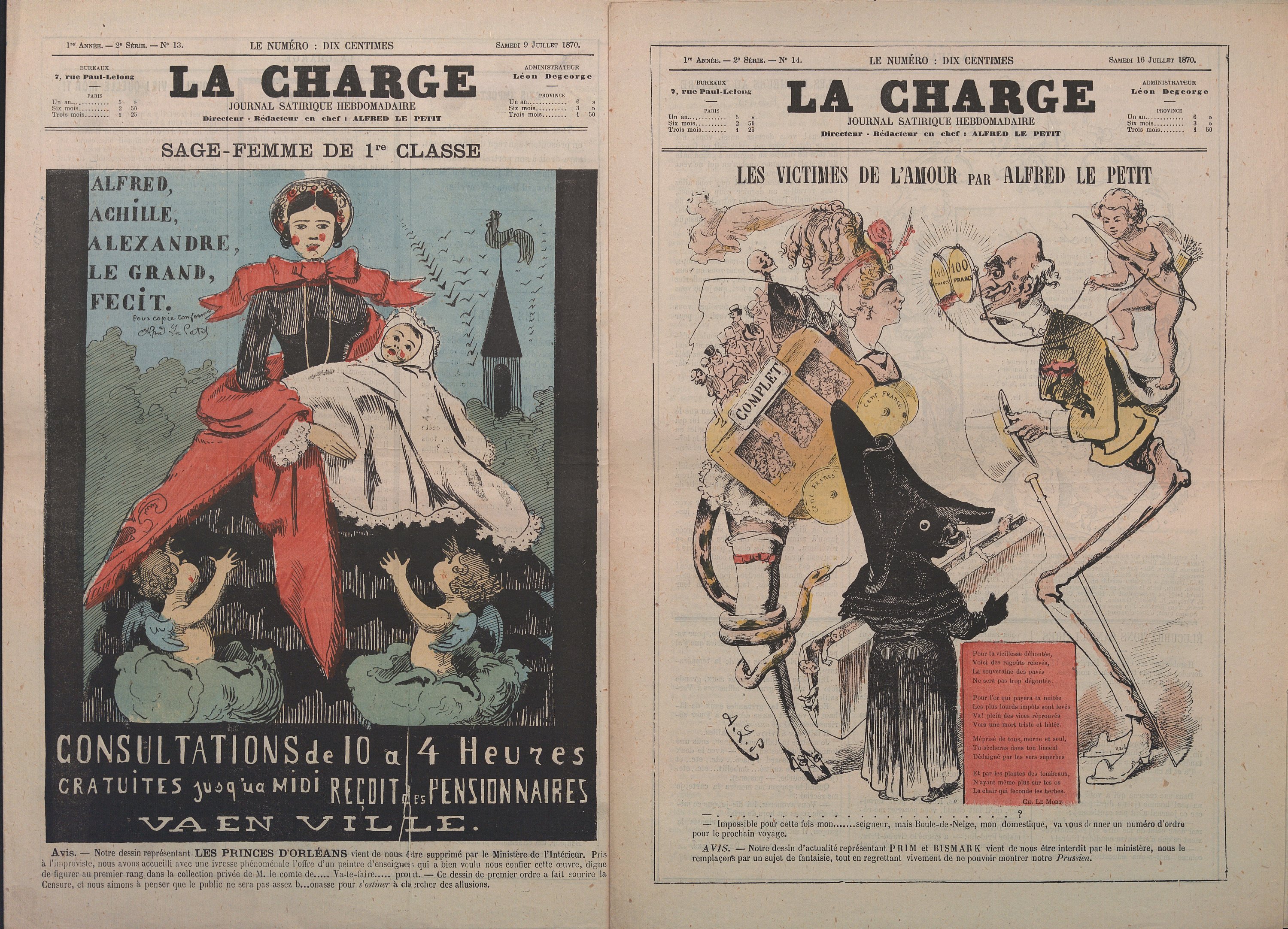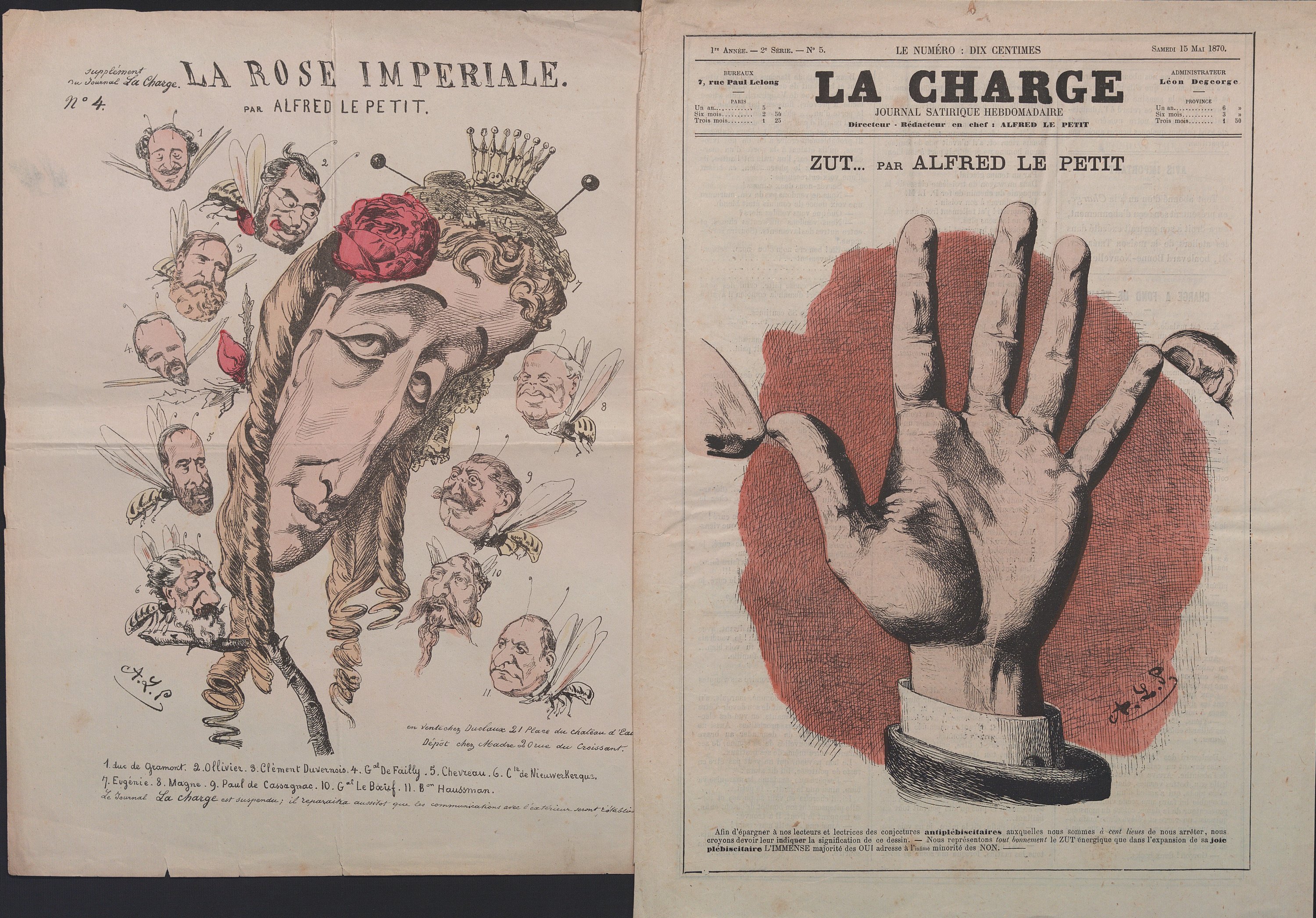 Rare réunion de ce journal satirique fondé par Alfred Le Petit, ayant quitté l’Eclipse pour cause de mésentente. Il publie deux séries : la 1ère parait le 13 janvier 1870 sur papier de différentes couleurs ; la seconde débute le 14 avril 1870 et se termine au n°24. L'esprit de ce journal est anti-bonapartiste et anti-prussien, plusieurs fois poursuivi et condamné pour la publication de dessins interdits.