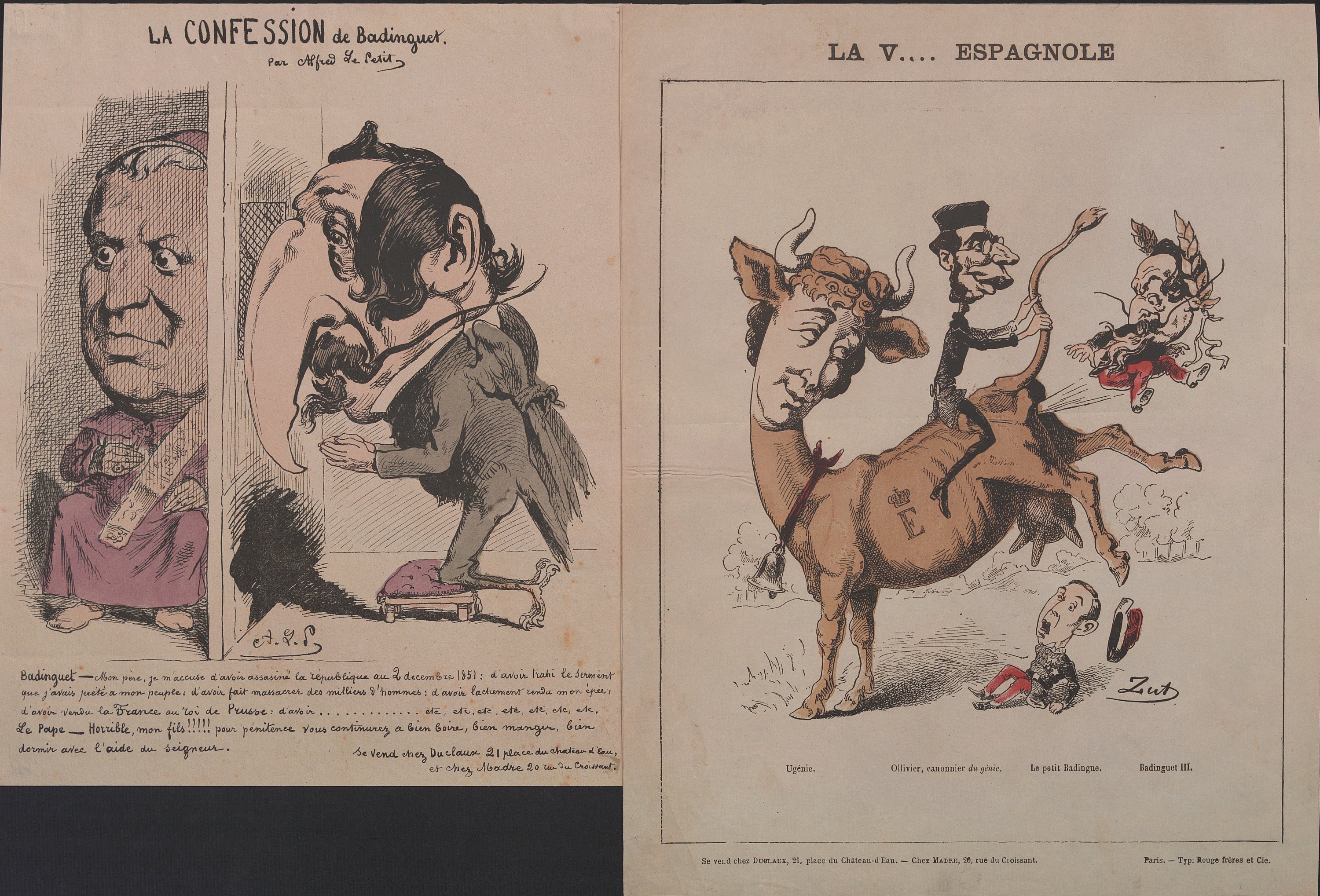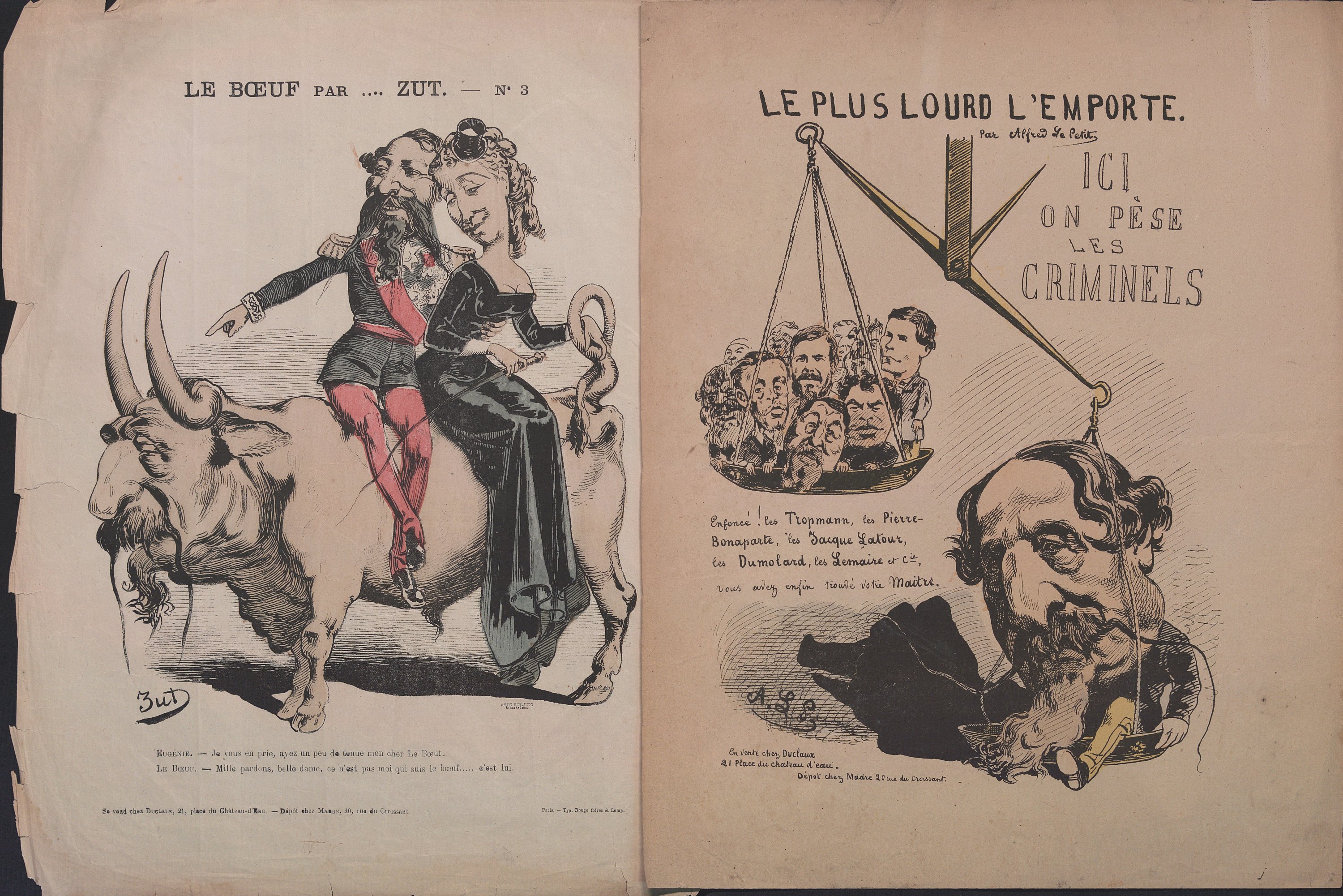 Joint : 4 feuilles volantes : Le plus lourd l’emporte, 35 x 27,5 cm ; La confession de Badinguet, 28,5 x 23 cm ; La V . espagnole, 32 x 25 cm ; Le bœuf par Zut, 35,5 x 28 cm (déchirures et manques en marge)